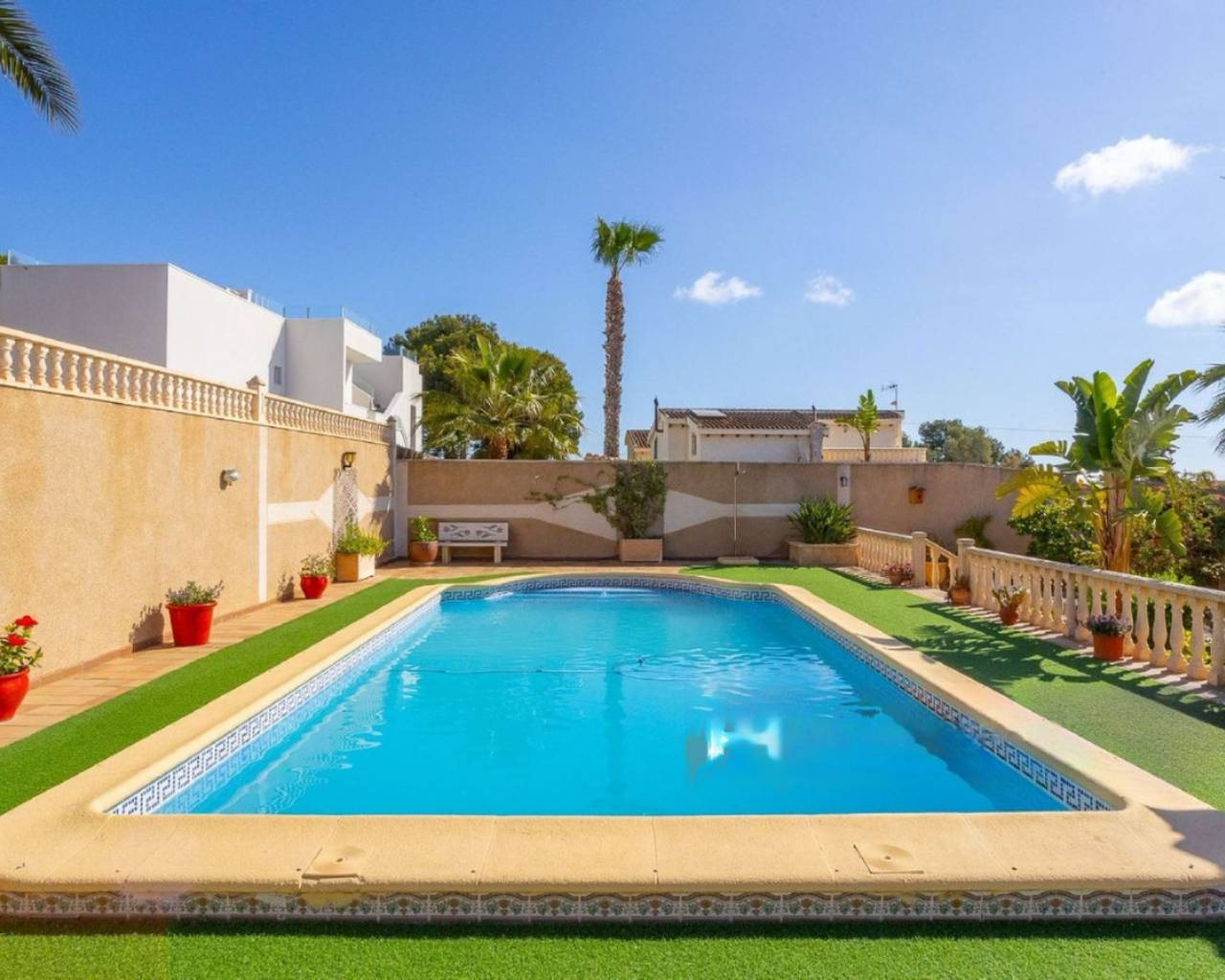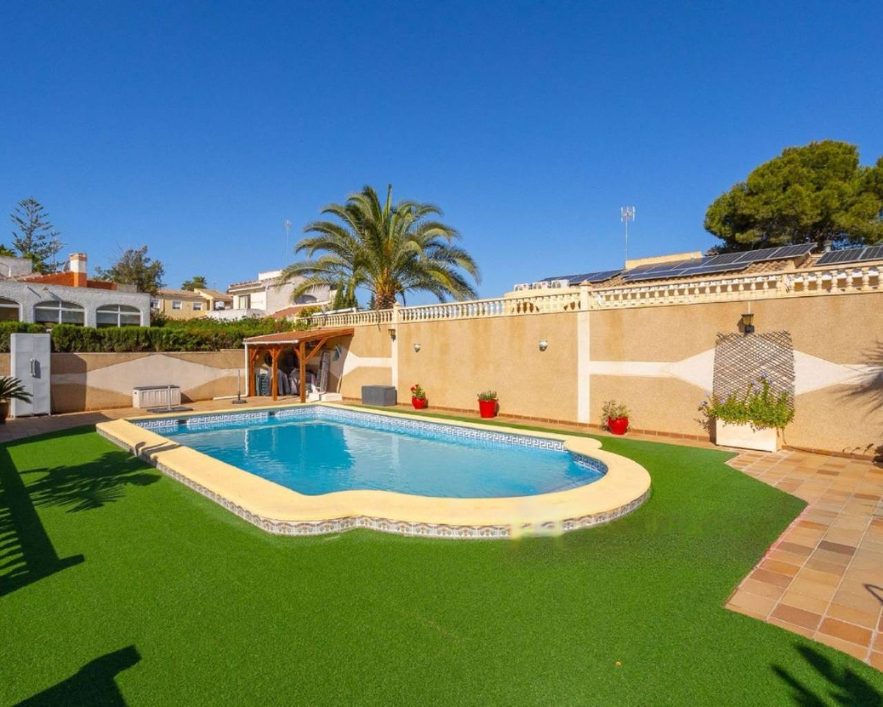 Descubre este espectacular chalet independiente en la prestigiosa zona de Los Balcones, Torrevieja. Un oasis de tranquilidad con piscina privada, amplio jardín y terraza soleada. Sumérgete en la comodidad de una casa distribuida en dos plantas, con 4 espaciosos dormitorios, incluyendo una suite principal con baño privado y vistas al jardín. Su diseño moderno y acabados de alta calidad hacen de este hogar un lugar único para vivir. El exterior no se queda atrás: su jardín bien cuidado, la gran piscina y la terraza invitan a disfrutar del clima mediterráneo durante todo el año. Además, cuenta con un amplio parking para varios vehículos, aportando seguridad y comodidad. Este chalet de ensueño es la combinación perfecta entre lujo, privacidad y bienestar. ¡No dejes pasar esta oportunidad única en Torrevieja!