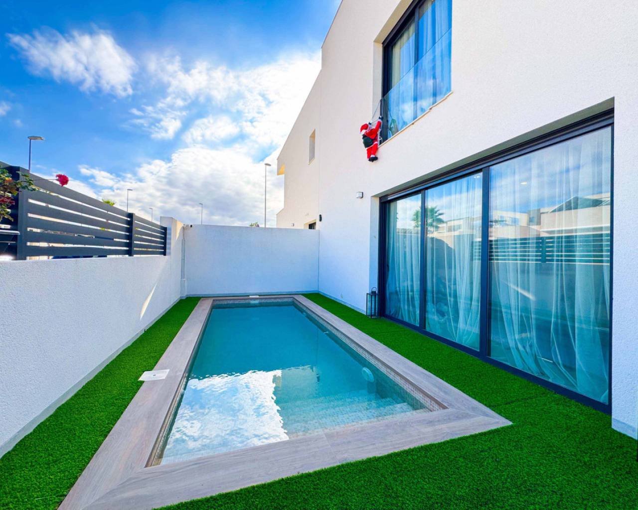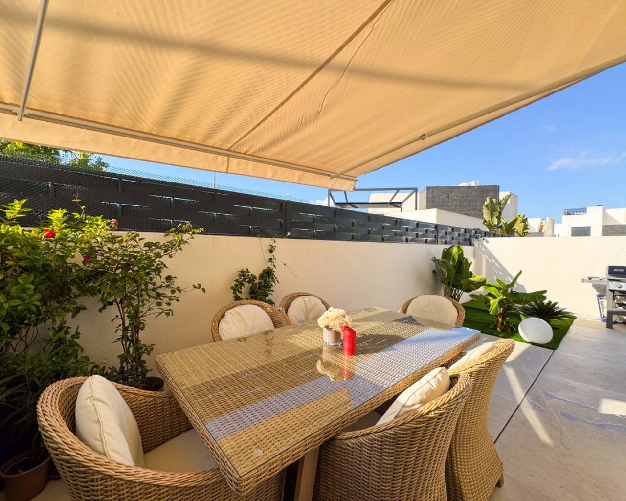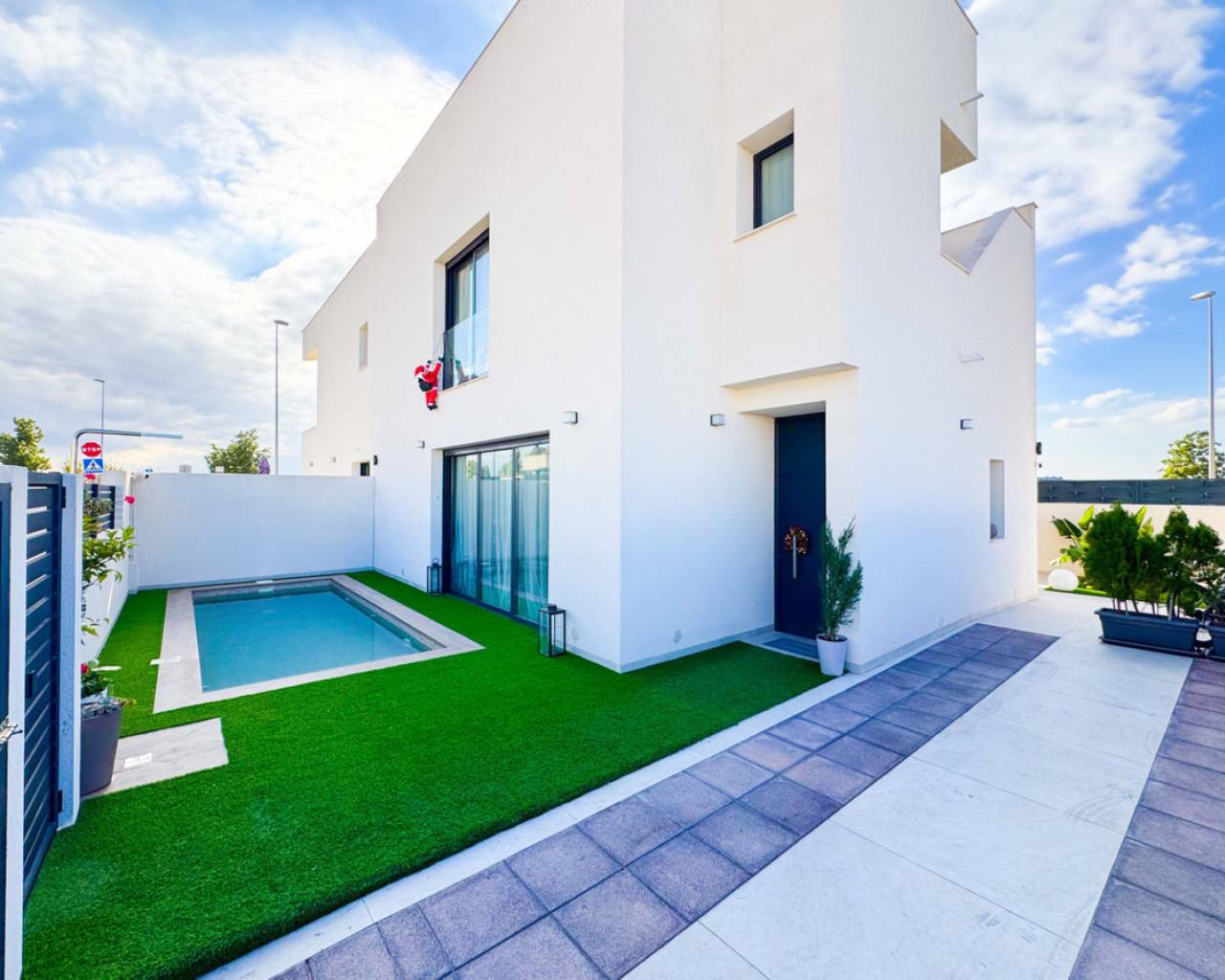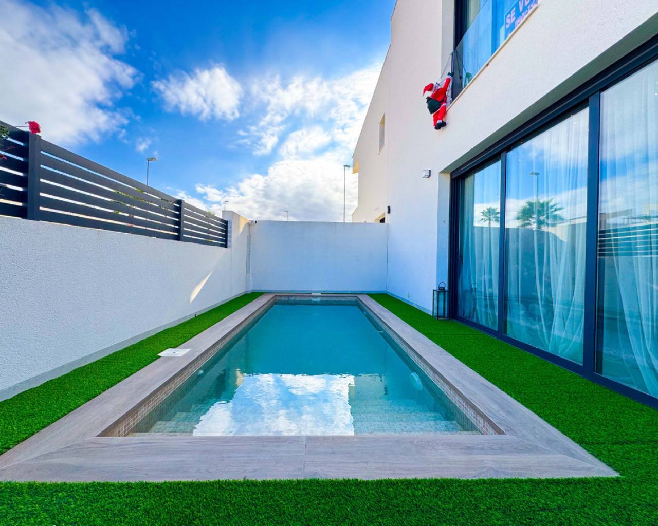Este precioso chalet adosado de obra reciente, construido en 2024, se encuentra en una de las zonas más demandadas de Benijófar (Alicante), a tan solo 10 km de las magníficas playas de Guardamar, famosas por sus dunas naturales y aguas cristalinas.La vivienda, distribuida en 2 plantas, ofrece 110 m² construidos (106 m² útiles) sobre una parcela privada de 150 m². La distribución es cómoda, moderna y muy funcional:Planta baja: Un amplio y luminoso salón con cocina abierta, diseñado en concepto abierto, con grandes ventanales que permiten la salida directa a la zona de la piscina privada. Este espacio ofrece mucha luz natural y una conexión perfecta entre interior y exterior. En esta planta se encuentra también un aseo, ideal para invitados y para uso diario.Segunda planta: Dispone de 2 amplios dormitorios, ambos con muy buena iluminación natural, y un baño grande, moderno y elegante. Desde esta planta se accede al gran solárium privado, un espacio perfecto para relajarse, tomar el sol, crear una zona chill-out o disfrutar de agradables veladas con vistas despejadas.En el exterior, la casa cuenta con una piscina privada, ideal para disfrutar del clima mediterráneo durante todo el año, así como un parking privado dentro de la parcela, incluido en el precio. La orientación este garantiza luminosidad desde primeras horas del día. La vivienda está en excelente estado y equipada con calefacción individual mediante bomba de frío/calor, aportando confort durante todo el año.Benijófar es un encantador municipio del sur de Alicante que combina tranquilidad, servicios y calidad de vida. Rodeado de naturaleza, senderos y zonas verdes, es el lugar ideal tanto para vivir todo el año como para disfrutar de estancias vacacionales. El municipio ofrece todos los servicios esenciales, como supermercados, comercios locales, farmacias, colegios y una amplia oferta gastronómica reconocida por su calidad.Su ubicación es estratégica, con fácil acceso a la AP-7 y muy cerca de localidades como Ciudad Quesada, Rojales y Torrevieja, además de encontrarse a solo 30 minutos del aeropuerto internacional de Alicante. Benijófar es un destino muy valorado por su ambiente tranquilo, seguro y acogedor, popular entre residentes nacionales e internacionales.Una propiedad perfecta para quienes buscan calidad, comodidad, privacidad, sol y proximidad al mar en un entorno privilegiado.