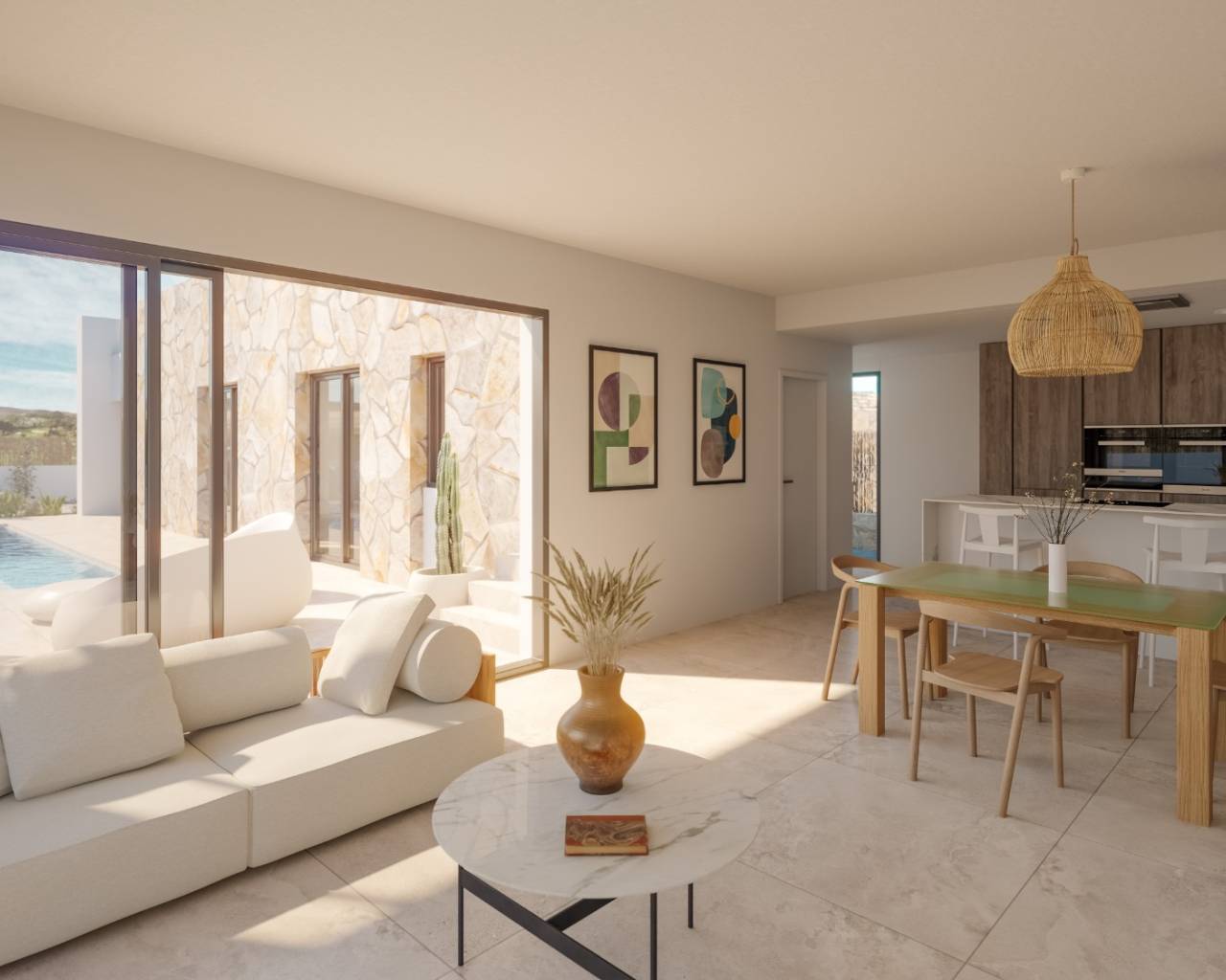 Salón y cocina abierta, conectados directamente con la terraza y la piscina