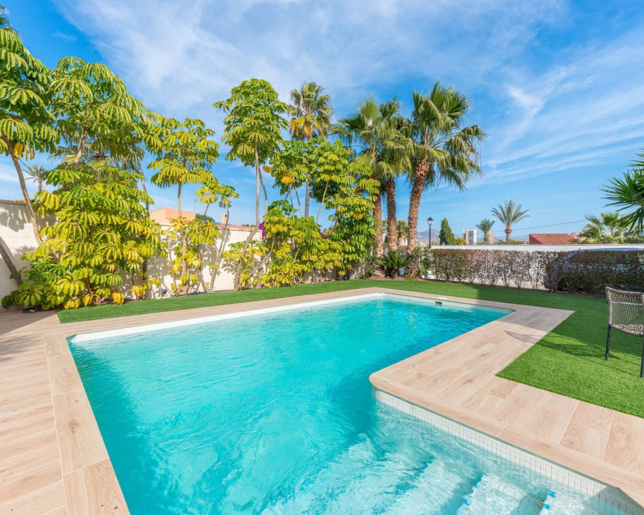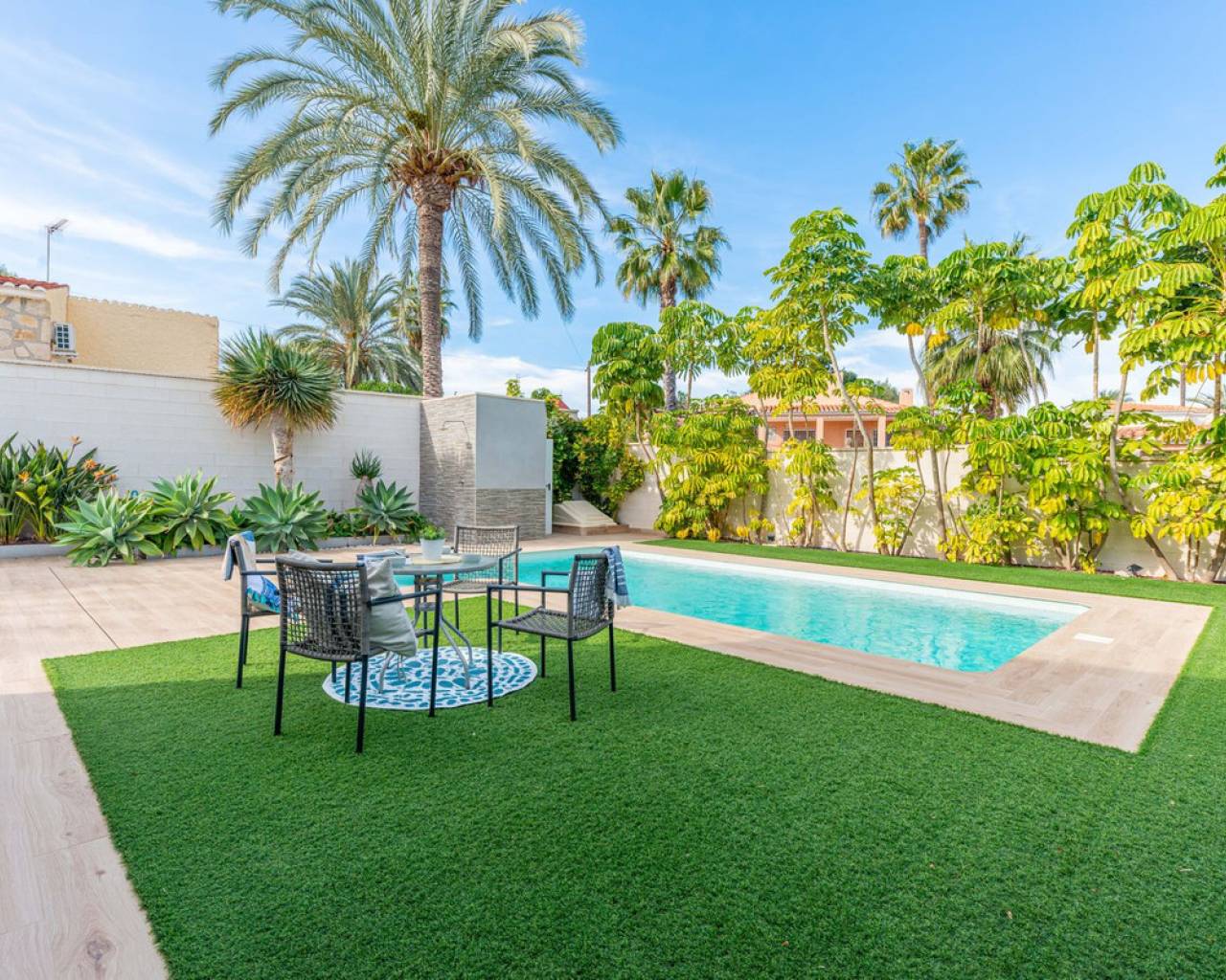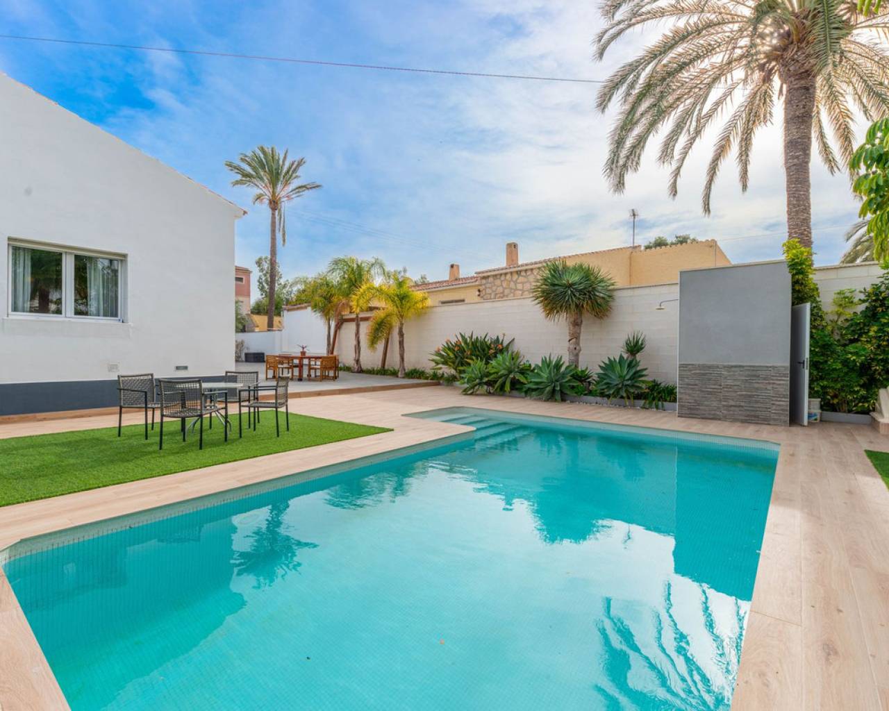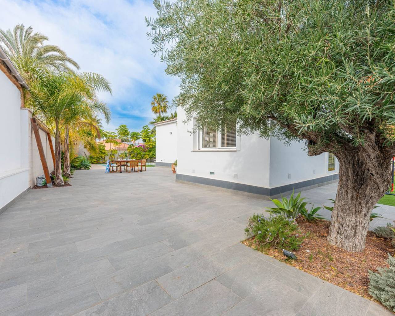Cerca de la espectacular playa de Muchavista, a solo 20 minutos de la ciudad de Alicante y a 5 minutos del centro de El Campello, a poca distancia de servicios de tranvía y autobús, cerca de todas las comodidades, escuelas y conexiones de autopistas, se encuentra esta encantadora villa, toda en una planta y en una parcela llana de 727m2 con piscina y jardín paisajístico. La villa, de 3 dormitorios, está ubicada en una zona residencial consolidada y se encuentra a poca distancia a pie (10 minutos) de la playa de 6 km que cuenta con la bandera azul. Se accede a la villa por una tranquila carretera residencial de sentido único hasta la puerta de entrada automatizada. Esta propiedad orientada al sur se beneficia de una renovación integral y consta de un vestíbulo y 3 dormitorios, así como de otra habitación actualmente utilizada como estudio/oficina de 18m2. El salón comedor es espacioso (33m2) y cuenta con una chimenea de leña. La cocina es independiente y está equipada con electrodomésticos, también hay un área de desayuno justo al lado de la cocina principal. Los 3 dormitorios son dobles y el dormitorio principal cuenta con un vestidor y un baño en suite con doble lavabo, bañera y ducha a ras de suelo. Dos baños dentro de la casa y un aseo exterior junto a la atractiva piscina con forma de "L". 70m2 de terraza alrededor de la piscina, otros 127m2 de terraza exterior alrededor de la casa y 142 m2 de césped artificial creando un espacio exterior espectacular y de bajo mantenimiento. Entrada con estacionamiento para varios autos. Una propiedad impresionante en una excelente ubicación y renovada a un alto estándar.