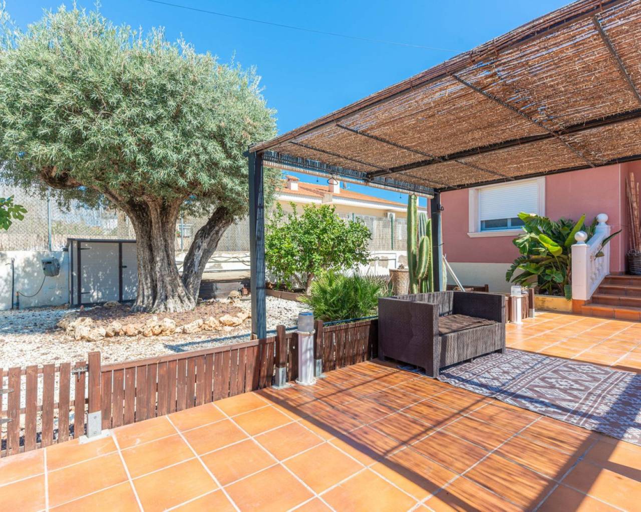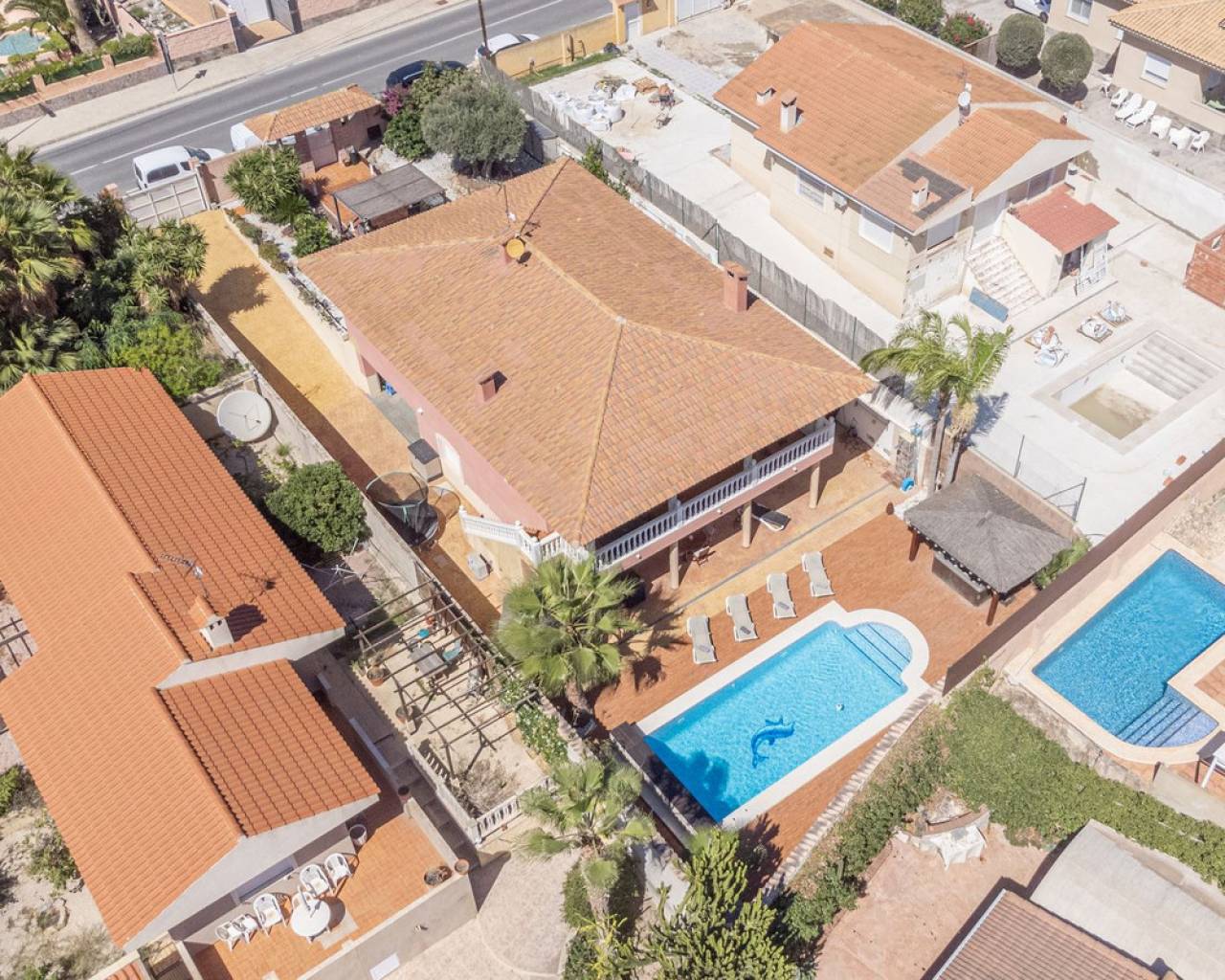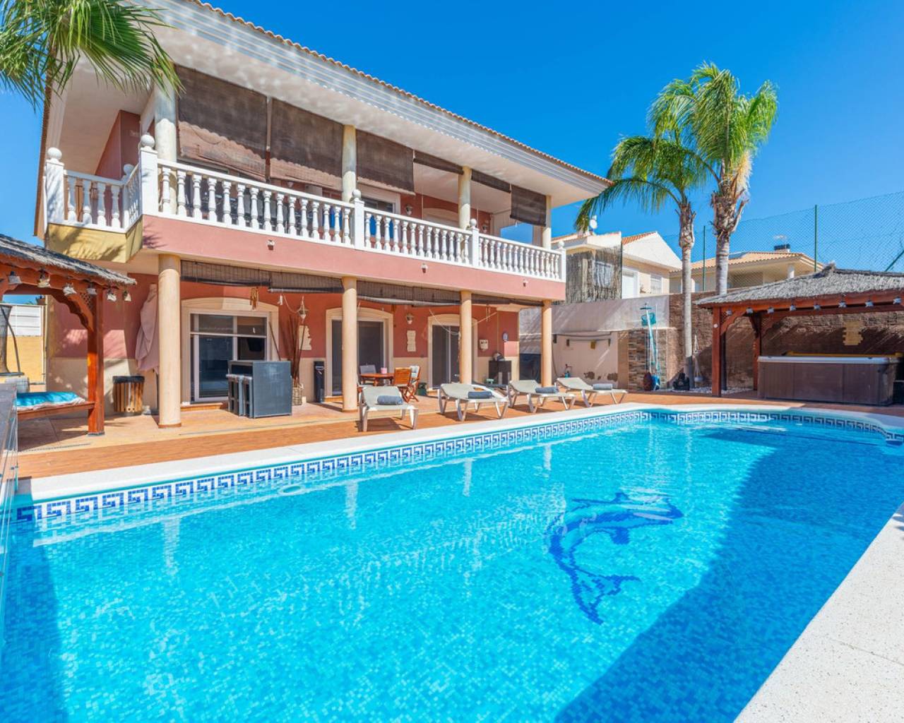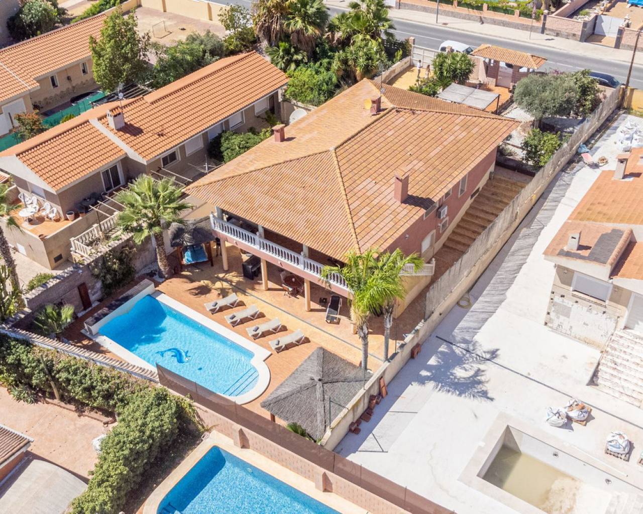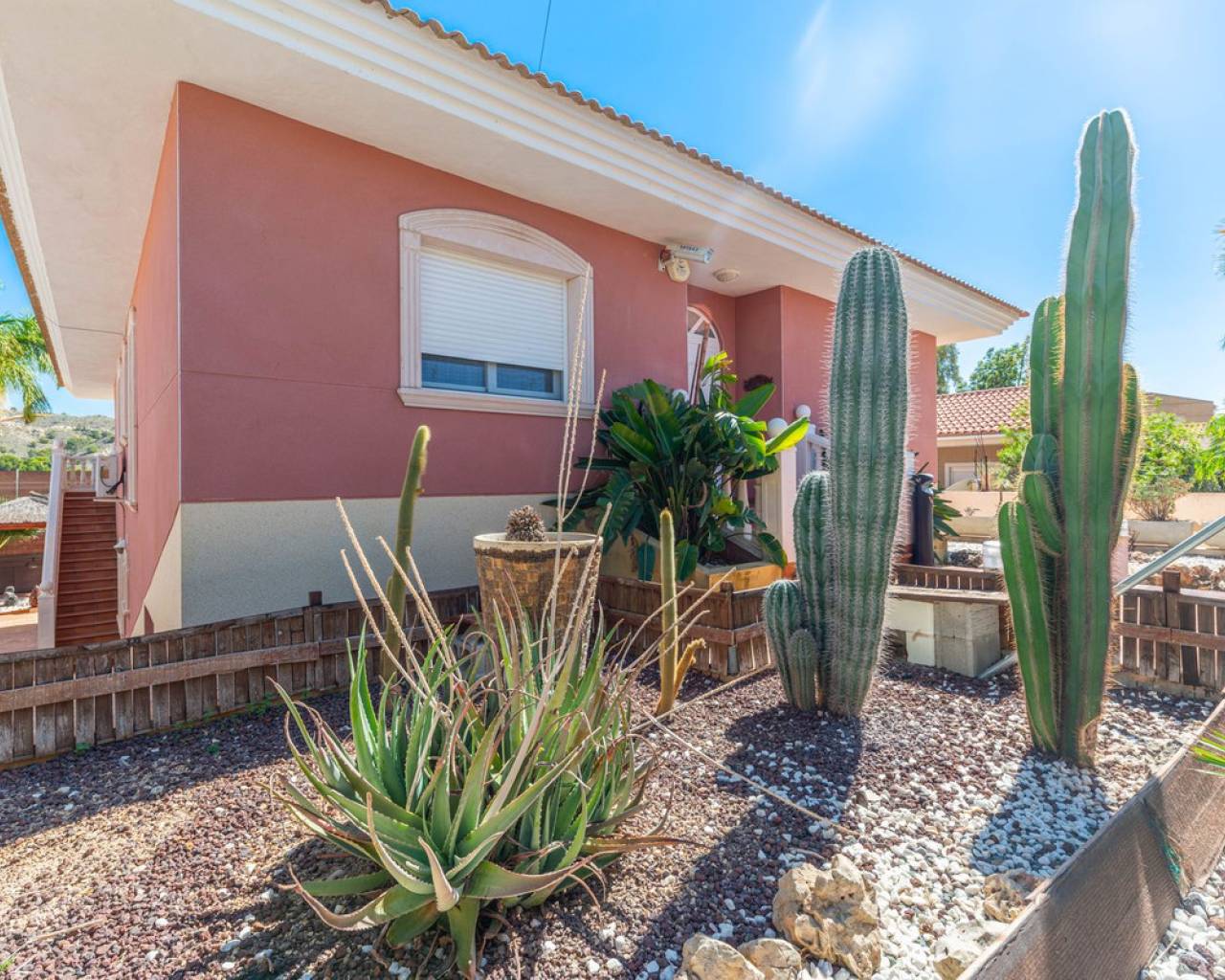 Situada en la codiciada zona de Partida Bonalba, Busot, entre el campo de golf y el encantador pueblo de Busot, se encuentra esta notable residencia: Villa Bali. Renovada a un alto nivel, ofrece más de 330 m² de espacio habitable. Situada en una parcela privada de más del doble de su tamaño, esta villa goza de fácil acceso al pueblo de Busot, a solo cinco minutos en coche, a 15 minutos de las playas vírgenes de El Campello-San Juan y a solo 25-30 minutos de Alicante y su aeropuerto internacional. El exterior cuenta con una piscina de generosas dimensiones, un gran jacuzzi cubierto por una pérgola de madera y otra pérgola a juego con una cama balinesa. La villa está rodeada de árboles y arbustos maduros, y un camino conduce a un garaje doble. La decoración interior está inspirada en la rica cultura de Bali, con muchos elementos cuidadosamente seleccionados que crean un ambiente único y relajante. Juntos, estos elementos ofrecen una experiencia de vida muy versátil y completa. La parte trasera de la villa se accede por la carretera hacia Busot, donde una puerta automatizada da acceso a un camino y un garaje para dos coches. La planta superior es el área principal de estar, con un salón-comedor espacioso con una estufa de leña y calefacción eléctrica dentro de las paredes para el invierno y aire acondicionado para el verano. Una cocina independiente, parcialmente equipada, de buen tamaño, se extiende desde el salón e incluye una despensa y un lavadero adyacente. Tanto el salón como la cocina tienen acceso directo a una amplia terraza cubierta orientada al sur, con vistas a la piscina y al campo montañoso en la distancia. En esta planta también se encuentran el recibidor, dos habitaciones dobles (una con armario empotrado y la más grande con vestidor y baño en suite), y un baño familiar independiente. En la planta baja, encontrarás tres habitaciones dobles adicionales, además de un baño familiar con ducha. Esta planta también incluye un salón, comedor, trastero y un garaje cerrado para dos vehículos. Desde aquí se tiene acceso directo a la terraza de la piscina. Externamente, la villa cuenta con una piscina con cubierta automatizada y una terraza de 100 m² que rodea la piscina, junto con un jacuzzi exterior y una cama de día. Esta villa orientada al sur es ideal para una familia, ofreciendo un amplio espacio para acomodar a los invitados, permitiéndoles disfrutar tanto del interior como del exterior de Villa Bali.