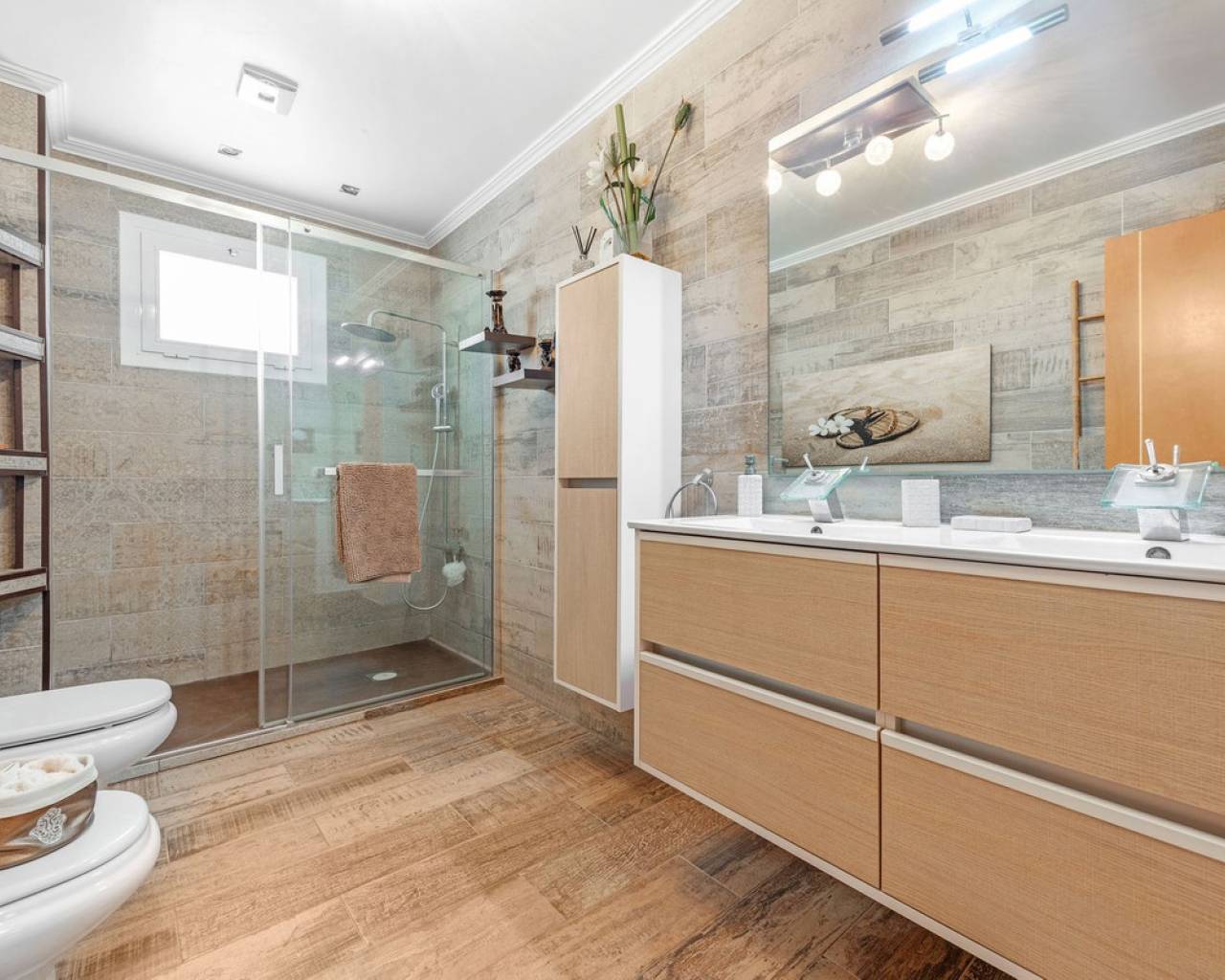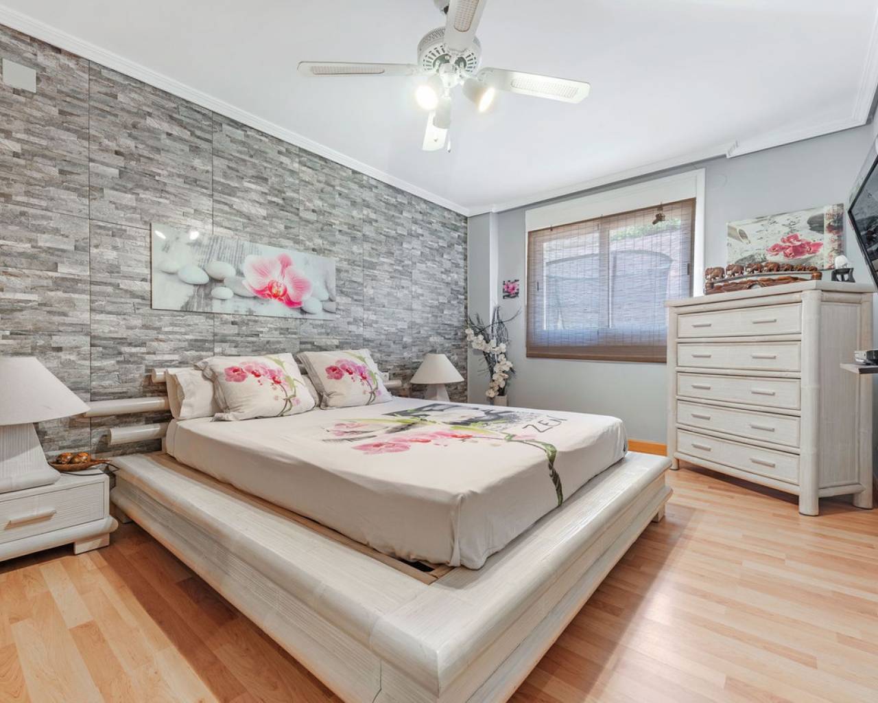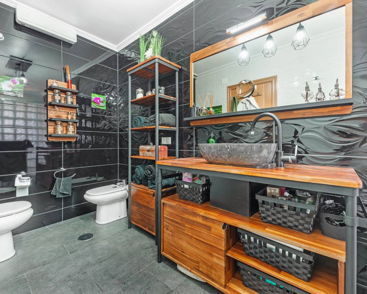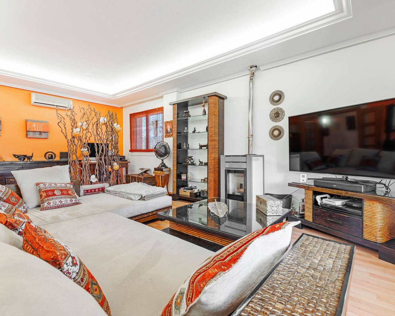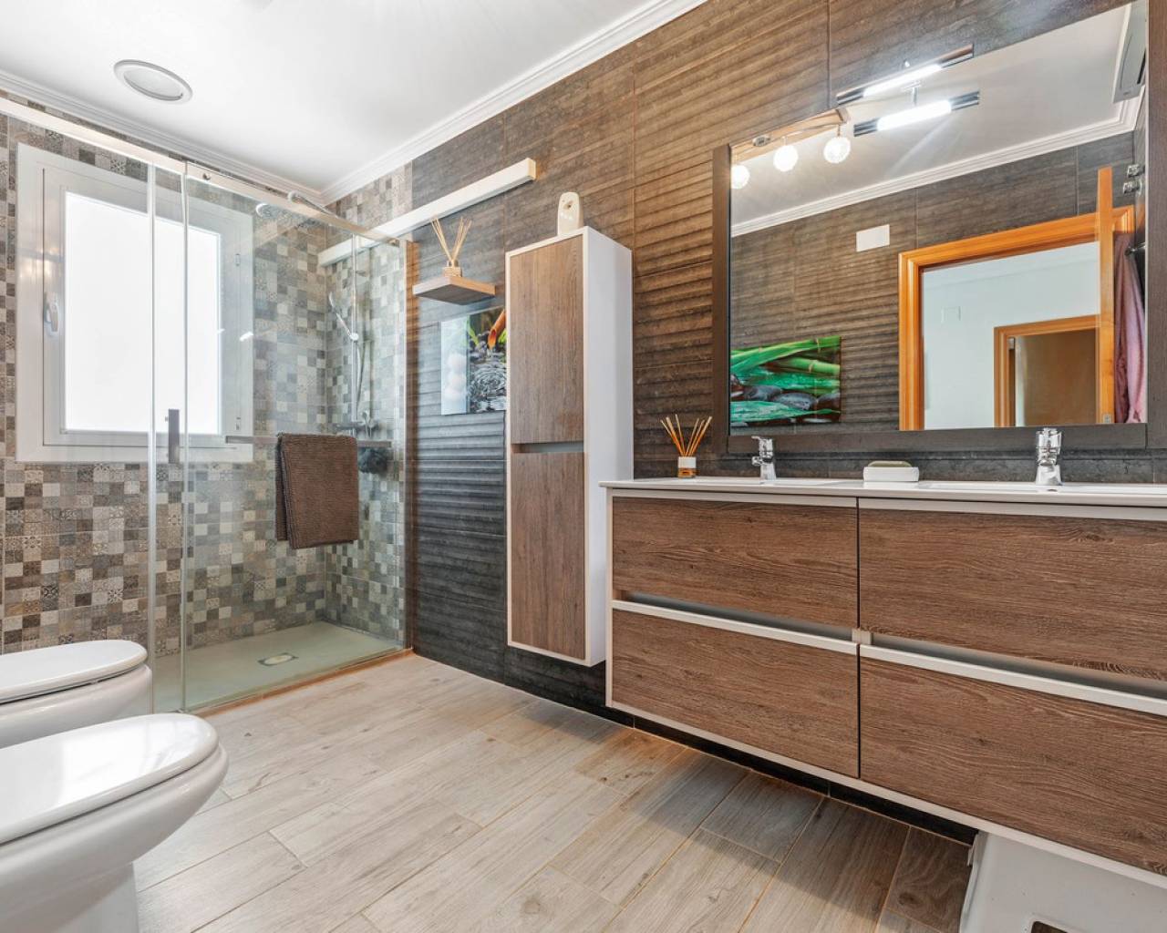 Situada en la codiciada zona de Partida Bonalba, Busot, entre el campo de golf y el encantador pueblo de Busot, se encuentra esta notable residencia: Villa Bali. Renovada a un alto nivel, ofrece más de 330 m² de espacio habitable. Situada en una parcela privada de más del doble de su tamaño, esta villa goza de fácil acceso al pueblo de Busot, a solo cinco minutos en coche, a 15 minutos de las playas vírgenes de El Campello-San Juan y a solo 25-30 minutos de Alicante y su aeropuerto internacional. El exterior cuenta con una piscina de generosas dimensiones, un gran jacuzzi cubierto por una pérgola de madera y otra pérgola a juego con una cama balinesa. La villa está rodeada de árboles y arbustos maduros, y un camino conduce a un garaje doble. La decoración interior está inspirada en la rica cultura de Bali, con muchos elementos cuidadosamente seleccionados que crean un ambiente único y relajante. Juntos, estos elementos ofrecen una experiencia de vida muy versátil y completa. La parte trasera de la villa se accede por la carretera hacia Busot, donde una puerta automatizada da acceso a un camino y un garaje para dos coches. La planta superior es el área principal de estar, con un salón-comedor espacioso con una estufa de leña y calefacción eléctrica dentro de las paredes para el invierno y aire acondicionado para el verano. Una cocina independiente, parcialmente equipada, de buen tamaño, se extiende desde el salón e incluye una despensa y un lavadero adyacente. Tanto el salón como la cocina tienen acceso directo a una amplia terraza cubierta orientada al sur, con vistas a la piscina y al campo montañoso en la distancia. En esta planta también se encuentran el recibidor, dos habitaciones dobles (una con armario empotrado y la más grande con vestidor y baño en suite), y un baño familiar independiente. En la planta baja, encontrarás tres habitaciones dobles adicionales, además de un baño familiar con ducha. Esta planta también incluye un salón, comedor, trastero y un garaje cerrado para dos vehículos. Desde aquí se tiene acceso directo a la terraza de la piscina. Externamente, la villa cuenta con una piscina con cubierta automatizada y una terraza de 100 m² que rodea la piscina, junto con un jacuzzi exterior y una cama de día. Esta villa orientada al sur es ideal para una familia, ofreciendo un amplio espacio para acomodar a los invitados, permitiéndoles disfrutar tanto del interior como del exterior de Villa Bali.