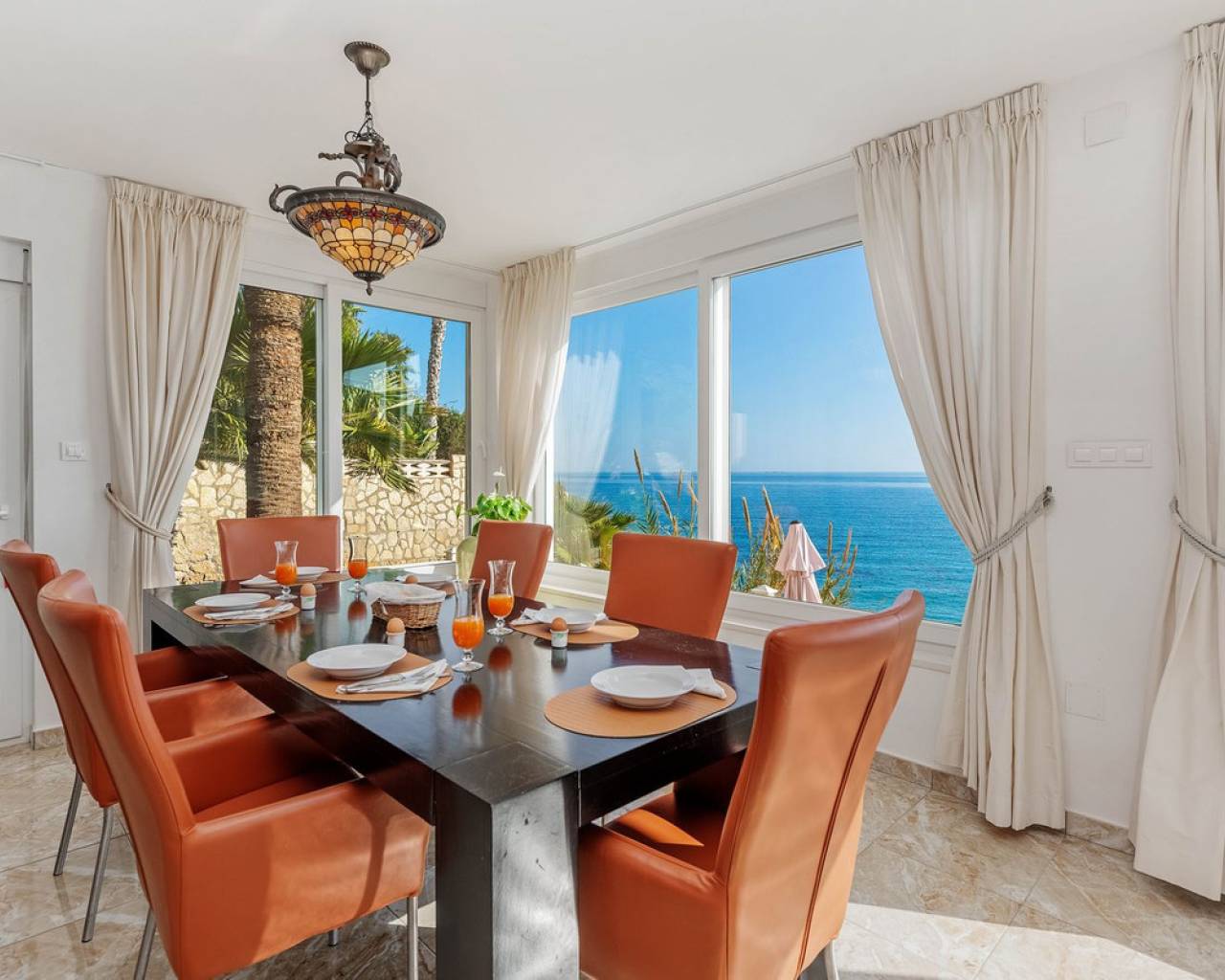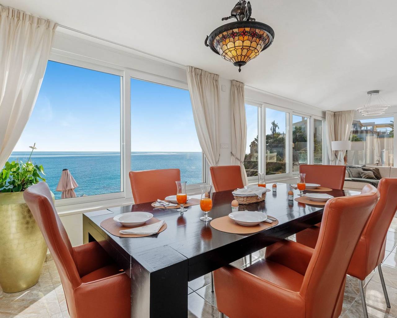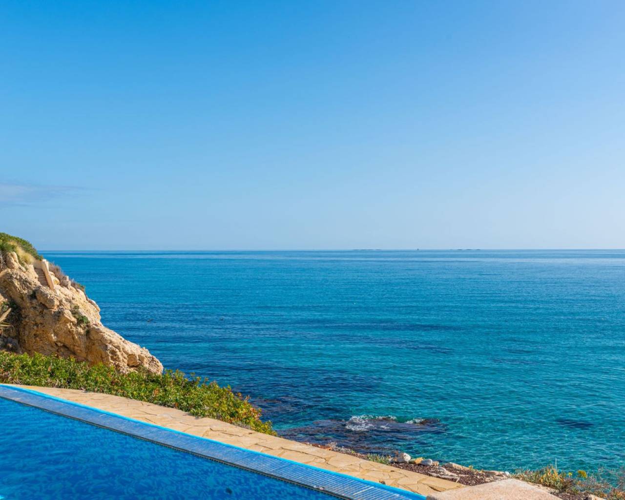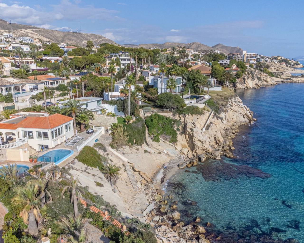 Excepcional Villa Frente al Mar en la Costa Blanca Norte con Escalera Privada a la Playa Ubicada en primera línea de la Costa Blanca Norte, en la codiciada zona residencial de Coveta Fumá, esta excepcional villa cuenta con más de 220 m² y se sitúa en una parcela privada que multiplica por cinco su tamaño. Estratégicamente posicionada entre dos idílicas calas y sobre una tercera, se encuentra a poca distancia en coche del encantador pueblo pesquero de Villajoyosa al norte y de la pintoresca ciudad costera de El Campello al sur. Su ubicación privilegiada ofrece impresionantes vistas al mar y la montaña, además de una escalera privada que conduce directamente a una cala de playa aislada. La tranquila cala es ideal para tomar el sol o nadar lejos de las multitudes. Además, la Villa Bahía Verdosa está convenientemente situada cerca del centro comercial local de Coveta Fumá. Su proximidad a Alicante, a tan solo 25 minutos, garantiza un fácil acceso al aeropuerto internacional, dos campos de golf y un puerto deportivo. Acceso y Privacidad La villa cuenta con un acceso a través de una puerta automática deslizante que da paso a un camino privado desde una tranquila calle residencial sin salida en Coveta Fumá. Diseño y Distribución Ubicada en una parcela de esquina, esta villa de una sola planta (con garaje en el nivel inferior) se integra perfectamente en el exuberante paisaje mediterráneo. La propiedad fue completamente renovada en 2019 con los más altos estándares, y nuevamente actualizada en 2023. Durante la renovación, se mantuvo la estructura original, pero todo lo demás fue reconstruido por completo. Mejoras realizadas:** - Aislamiento de paredes y techo. - Sustitución de ventanas, puertas, portón de entrada y puerta del garaje. - Instalación de nuevos suelos y tejado. - Reforma integral de sistemas eléctricos, fontanería, jardín y terrazas. - Remodelación completa de baños, cocina y cocina exterior. - Diseño interior y amueblamiento con materiales de alta calidad para asegurar comodidad y estilo. Detalles Interiores Planta Principal Un espacioso salón-comedor de planta abierta de aproximadamente 76 m² incluye dos zonas de estar y un comedor. Amplios ventanales inundan el espacio de luz natural, destacando las impresionantes vistas de la terraza y el mar Mediterráneo. Junto al salón se encuentra una terraza cubierta tipo "naya" (15 m²) orientada al oeste, ideal para disfrutar del sol de la tarde o el invierno. Cocina Una cocina de última generación totalmente equipada, con electrodomésticos de alta gama, perfecta para los amantes de la gastronomía. Dormitorios - Tres dormitorios dobles con armarios empotrados. - El dormitorio principal ofrece impresionantes vistas al mar y un baño en suite con doble lavabo. Planta Inferior - Garaje subterráneo con espacio para un coche, motocicleta, moto acuática y almacenamiento adicional. - Aparcamiento privado para varios vehículos dentro de la propiedad. Características Exteriores - Zona de barbacoa cubierta al aire libre (11 m²). - Jardines maduros y paisajísticos con numerosas palmeras y áreas de terraza para comer, relajarse y tomar el sol. - Impresionante terraza de piscina de 126 m² con una piscina infinita de 38 m² que ofrece vistas espectaculares. - Acceso privado a una cala de playa aislada. Servicios Adicionales - Sistema de alarma para mayor seguridad. - Aire acondicionado frío/calor en toda la vivienda. - Mobiliario, accesorios y electrodomésticos de lujo incluidos en el precio. Orientación Su La villa goza de una orientación sur que garantiza abundante luz natural durante todo el día. Ideal para Vivir el Mediterráneo Esta villa es la elección perfecta para una familia que desee disfrutar de lo mejor del estilo de vida mediterráneo, combinando lujo, privacidad y un entorno costero espectacular. También es ideal para personas con movilidad reducida y residentes mayores.