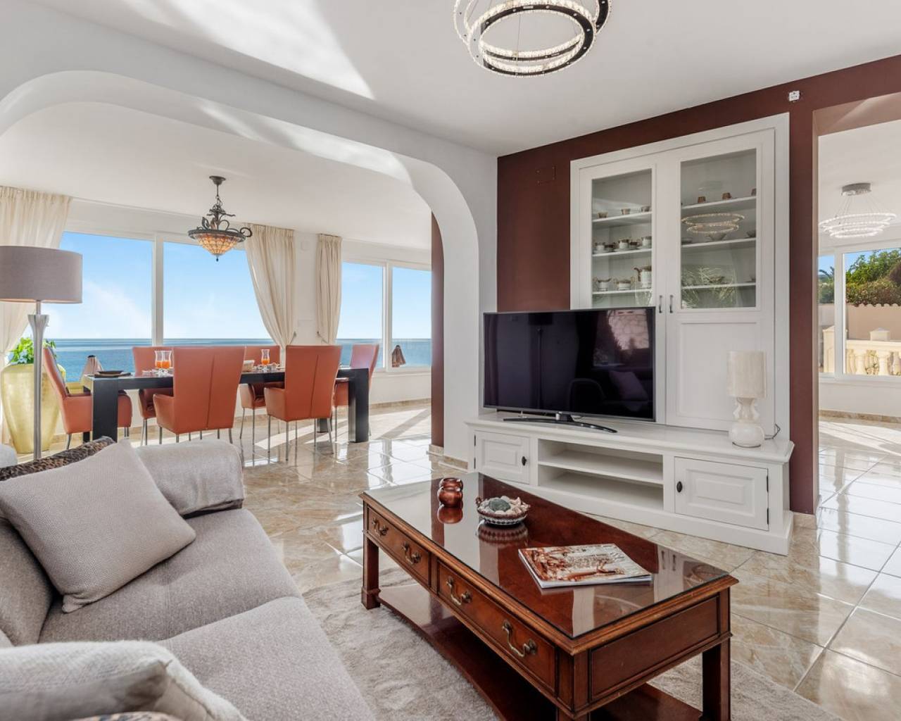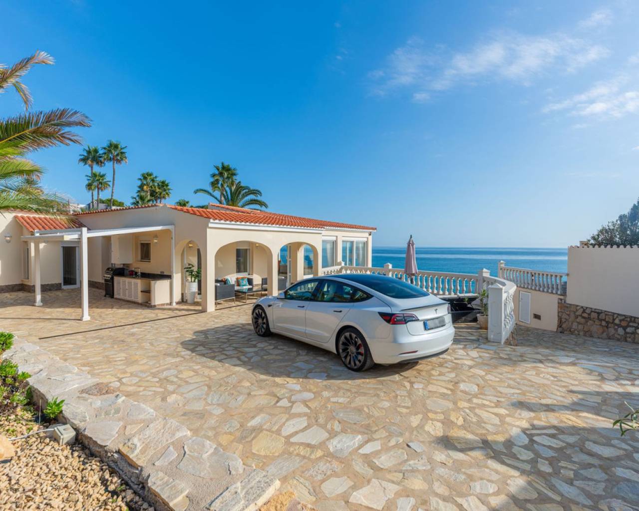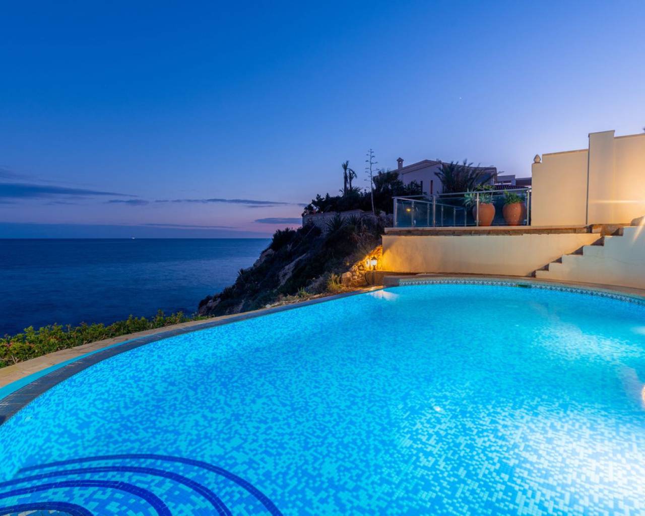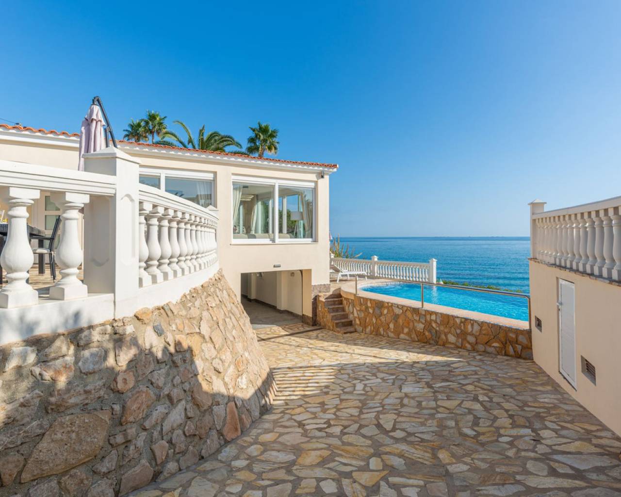Excepcional Villa Frente al Mar en la Costa Blanca Norte con Escalera Privada a la Playa Ubicada en primera línea de la Costa Blanca Norte, en la codiciada zona residencial de Coveta Fumá, esta excepcional villa cuenta con más de 220 m² y se sitúa en una parcela privada que multiplica por cinco su tamaño. Estratégicamente posicionada entre dos idílicas calas y sobre una tercera, se encuentra a poca distancia en coche del encantador pueblo pesquero de Villajoyosa al norte y de la pintoresca ciudad costera de El Campello al sur. Su ubicación privilegiada ofrece impresionantes vistas al mar y la montaña, además de una escalera privada que conduce directamente a una cala de playa aislada. La tranquila cala es ideal para tomar el sol o nadar lejos de las multitudes. Además, la Villa Bahía Verdosa está convenientemente situada cerca del centro comercial local de Coveta Fumá. Su proximidad a Alicante, a tan solo 25 minutos, garantiza un fácil acceso al aeropuerto internacional, dos campos de golf y un puerto deportivo. Acceso y Privacidad La villa cuenta con un acceso a través de una puerta automática deslizante que da paso a un camino privado desde una tranquila calle residencial sin salida en Coveta Fumá. Diseño y Distribución Ubicada en una parcela de esquina, esta villa de una sola planta (con garaje en el nivel inferior) se integra perfectamente en el exuberante paisaje mediterráneo. La propiedad fue completamente renovada en 2019 con los más altos estándares, y nuevamente actualizada en 2023. Durante la renovación, se mantuvo la estructura original, pero todo lo demás fue reconstruido por completo. Mejoras realizadas:** - Aislamiento de paredes y techo. - Sustitución de ventanas, puertas, portón de entrada y puerta del garaje. - Instalación de nuevos suelos y tejado. - Reforma integral de sistemas eléctricos, fontanería, jardín y terrazas. - Remodelación completa de baños, cocina y cocina exterior. - Diseño interior y amueblamiento con materiales de alta calidad para asegurar comodidad y estilo. Detalles Interiores Planta Principal Un espacioso salón-comedor de planta abierta de aproximadamente 76 m² incluye dos zonas de estar y un comedor. Amplios ventanales inundan el espacio de luz natural, destacando las impresionantes vistas de la terraza y el mar Mediterráneo. Junto al salón se encuentra una terraza cubierta tipo "naya" (15 m²) orientada al oeste, ideal para disfrutar del sol de la tarde o el invierno. Cocina Una cocina de última generación totalmente equipada, con electrodomésticos de alta gama, perfecta para los amantes de la gastronomía. Dormitorios - Tres dormitorios dobles con armarios empotrados. - El dormitorio principal ofrece impresionantes vistas al mar y un baño en suite con doble lavabo. Planta Inferior - Garaje subterráneo con espacio para un coche, motocicleta, moto acuática y almacenamiento adicional. - Aparcamiento privado para varios vehículos dentro de la propiedad. Características Exteriores - Zona de barbacoa cubierta al aire libre (11 m²). - Jardines maduros y paisajísticos con numerosas palmeras y áreas de terraza para comer, relajarse y tomar el sol. - Impresionante terraza de piscina de 126 m² con una piscina infinita de 38 m² que ofrece vistas espectaculares. - Acceso privado a una cala de playa aislada. Servicios Adicionales - Sistema de alarma para mayor seguridad. - Aire acondicionado frío/calor en toda la vivienda. - Mobiliario, accesorios y electrodomésticos de lujo incluidos en el precio. Orientación Su La villa goza de una orientación sur que garantiza abundante luz natural durante todo el día. Ideal para Vivir el Mediterráneo Esta villa es la elección perfecta para una familia que desee disfrutar de lo mejor del estilo de vida mediterráneo, combinando lujo, privacidad y un entorno costero espectacular. También es ideal para personas con movilidad reducida y residentes mayores.
