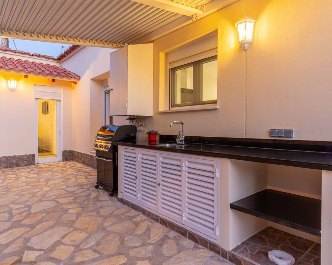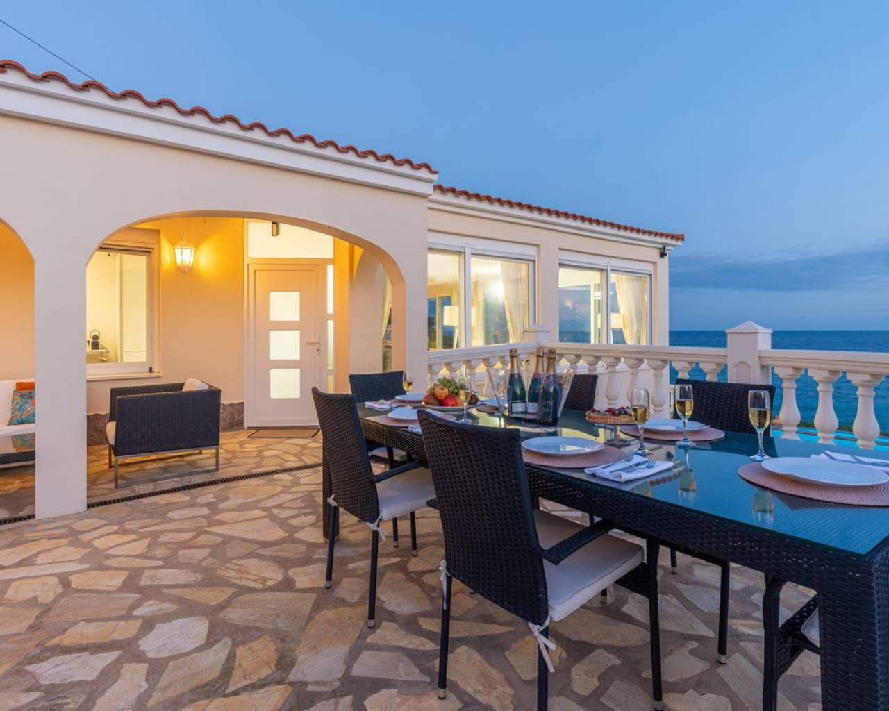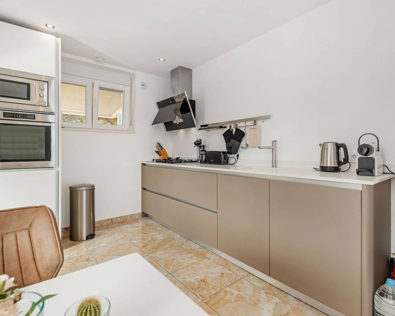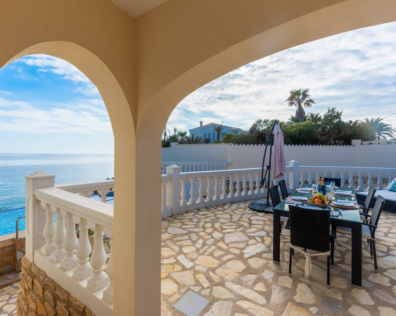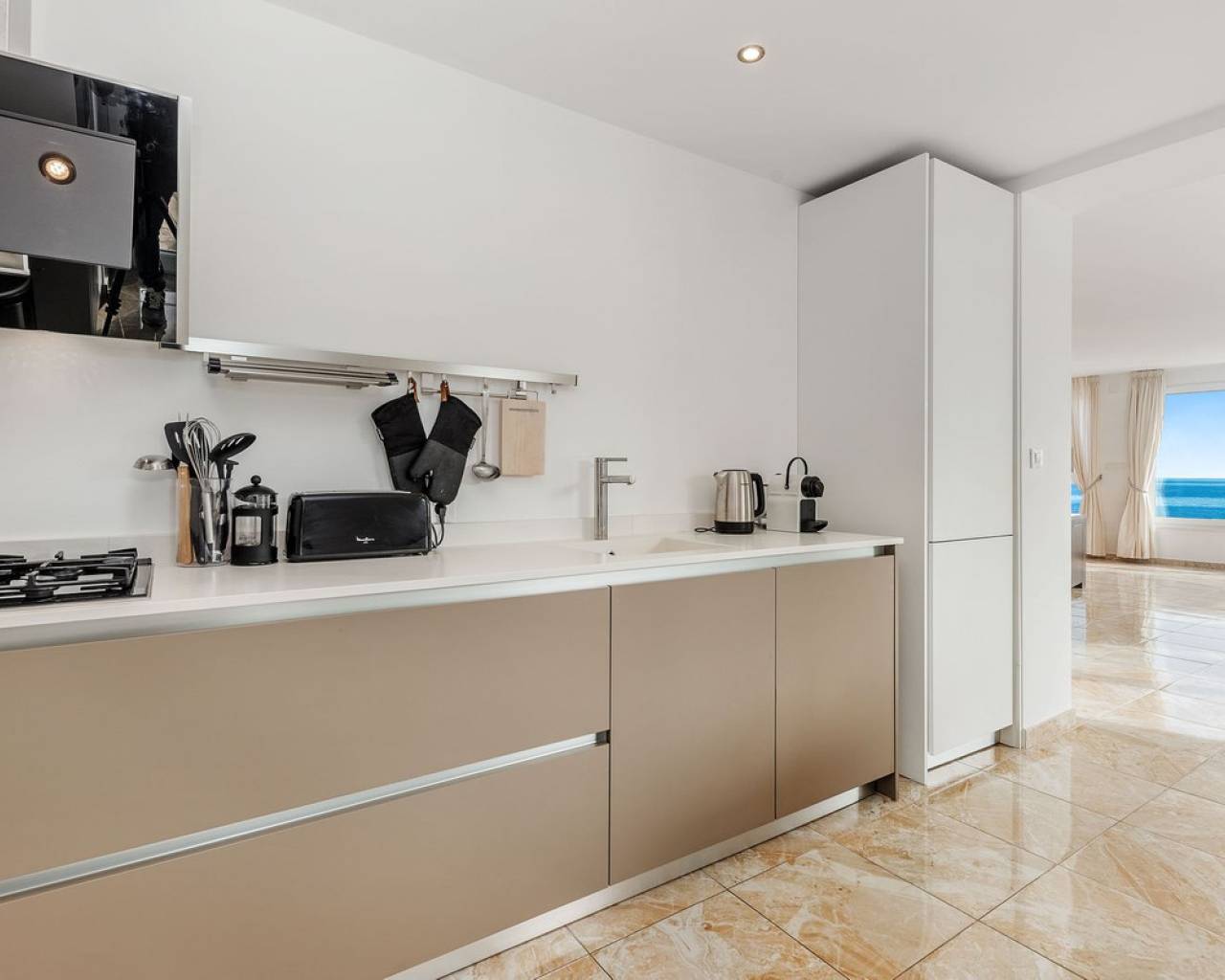 Excepcional Villa Frente al Mar en la Costa Blanca Norte con Escalera Privada a la Playa Ubicada en primera línea de la Costa Blanca Norte, en la codiciada zona residencial de Coveta Fumá, esta excepcional villa cuenta con más de 220 m² y se sitúa en una parcela privada que multiplica por cinco su tamaño. Estratégicamente posicionada entre dos idílicas calas y sobre una tercera, se encuentra a poca distancia en coche del encantador pueblo pesquero de Villajoyosa al norte y de la pintoresca ciudad costera de El Campello al sur. Su ubicación privilegiada ofrece impresionantes vistas al mar y la montaña, además de una escalera privada que conduce directamente a una cala de playa aislada. La tranquila cala es ideal para tomar el sol o nadar lejos de las multitudes. Además, la Villa Bahía Verdosa está convenientemente situada cerca del centro comercial local de Coveta Fumá. Su proximidad a Alicante, a tan solo 25 minutos, garantiza un fácil acceso al aeropuerto internacional, dos campos de golf y un puerto deportivo. Acceso y Privacidad La villa cuenta con un acceso a través de una puerta automática deslizante que da paso a un camino privado desde una tranquila calle residencial sin salida en Coveta Fumá. Diseño y Distribución Ubicada en una parcela de esquina, esta villa de una sola planta (con garaje en el nivel inferior) se integra perfectamente en el exuberante paisaje mediterráneo. La propiedad fue completamente renovada en 2019 con los más altos estándares, y nuevamente actualizada en 2023. Durante la renovación, se mantuvo la estructura original, pero todo lo demás fue reconstruido por completo. Mejoras realizadas:** - Aislamiento de paredes y techo. - Sustitución de ventanas, puertas, portón de entrada y puerta del garaje. - Instalación de nuevos suelos y tejado. - Reforma integral de sistemas eléctricos, fontanería, jardín y terrazas. - Remodelación completa de baños, cocina y cocina exterior. - Diseño interior y amueblamiento con materiales de alta calidad para asegurar comodidad y estilo. Detalles Interiores Planta Principal Un espacioso salón-comedor de planta abierta de aproximadamente 76 m² incluye dos zonas de estar y un comedor. Amplios ventanales inundan el espacio de luz natural, destacando las impresionantes vistas de la terraza y el mar Mediterráneo. Junto al salón se encuentra una terraza cubierta tipo "naya" (15 m²) orientada al oeste, ideal para disfrutar del sol de la tarde o el invierno. Cocina Una cocina de última generación totalmente equipada, con electrodomésticos de alta gama, perfecta para los amantes de la gastronomía. Dormitorios - Tres dormitorios dobles con armarios empotrados. - El dormitorio principal ofrece impresionantes vistas al mar y un baño en suite con doble lavabo. Planta Inferior - Garaje subterráneo con espacio para un coche, motocicleta, moto acuática y almacenamiento adicional. - Aparcamiento privado para varios vehículos dentro de la propiedad. Características Exteriores - Zona de barbacoa cubierta al aire libre (11 m²). - Jardines maduros y paisajísticos con numerosas palmeras y áreas de terraza para comer, relajarse y tomar el sol. - Impresionante terraza de piscina de 126 m² con una piscina infinita de 38 m² que ofrece vistas espectaculares. - Acceso privado a una cala de playa aislada. Servicios Adicionales - Sistema de alarma para mayor seguridad. - Aire acondicionado frío/calor en toda la vivienda. - Mobiliario, accesorios y electrodomésticos de lujo incluidos en el precio. Orientación Su La villa goza de una orientación sur que garantiza abundante luz natural durante todo el día. Ideal para Vivir el Mediterráneo Esta villa es la elección perfecta para una familia que desee disfrutar de lo mejor del estilo de vida mediterráneo, combinando lujo, privacidad y un entorno costero espectacular. También es ideal para personas con movilidad reducida y residentes mayores.