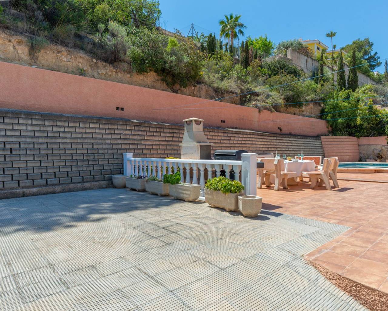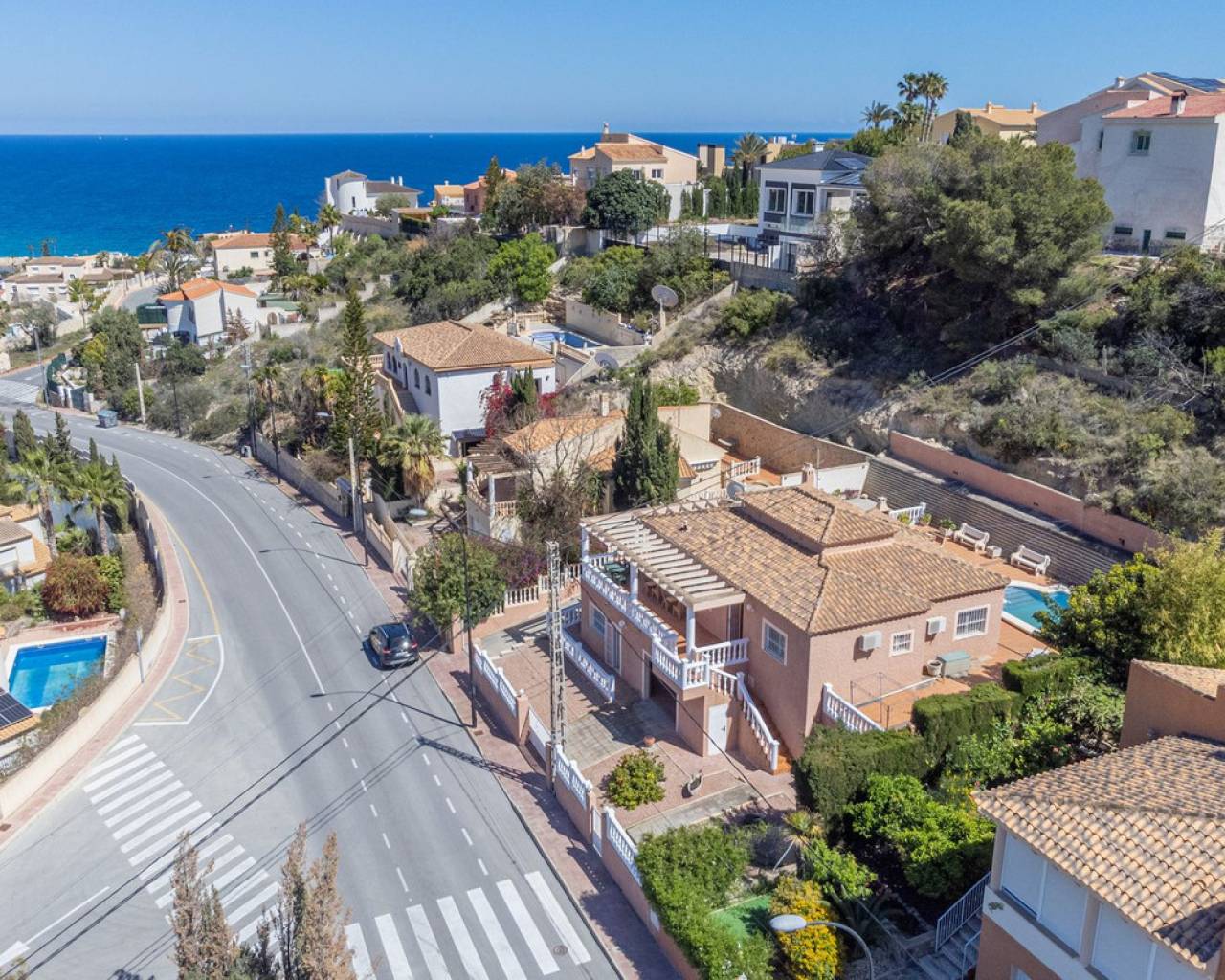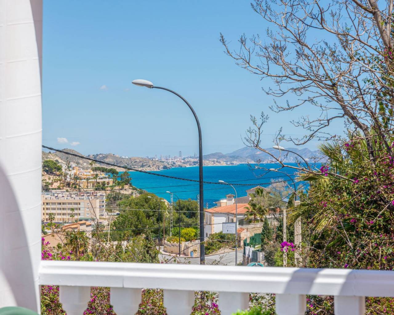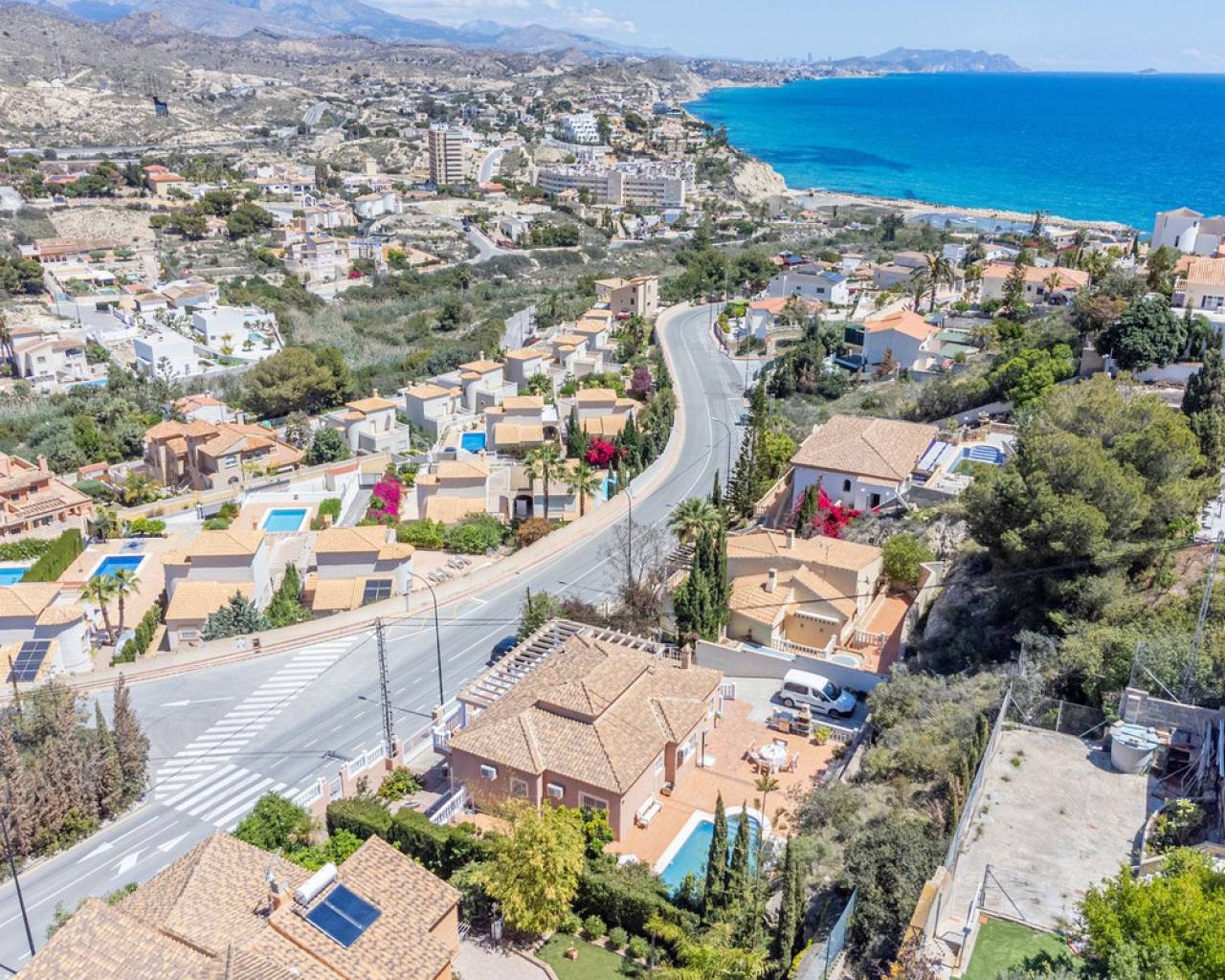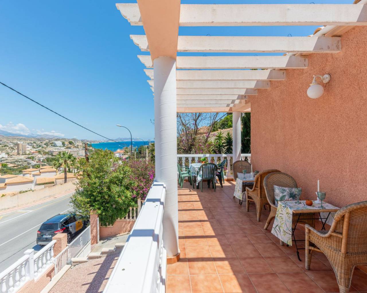 En El Campello Norte, sobre una parcela con pintorescas vistas al mar y la costa, se encuentra esta magnífica villa de más de 300 m² construidos. Situada en un terreno que duplica su superficie, la propiedad ofrece vistas al Mediterráneo tanto desde el interior de la vivienda y sobretodo desde su amplia terraza esquinera. Su ubicación es estratégica: a solo 10 minutos en coche del encantador pueblo costero de El Campello y sus playas, a 25 minutos del centro de Alicante y a 30 minutos del Aeropuerto Internacional de Alicante. Su orientación hacia el sol naciente, las vistas despejadas al mar y su generoso espacio habitable —incluyendo un apartamento independiente— convierten esta propiedad en una propuesta única. Acceso y exteriores: El acceso a la vivienda se realiza a través de una calle residencial y una puerta automática de hierro que conduce al área de estacionamiento exterior, con espacio suficiente para un coche frente al garaje, el cual tiene capacidad para dos o tres vehículos adicionales. También hay una entrada peatonal independiente. Planta principal: Se accede mediante escalera exterior hasta la puerta principal, que abre a un amplio hall de entrada desde el cual se distribuyen todas las estancias. El salón-comedor, de forma rectangular y con casi 30 m², tiene salida directa a una terraza esquinera de 41 m² con vistas al mar. La cocina es independiente, totalmente equipada, y cuenta con un lavadero contiguo. Dispone de tres dormitorios dobles con armarios empotrados y dos baños completos con bidé, uno de ellos en suite en el dormitorio principal. Planta inferior: Apartamento independiente con acceso directo desde el exterior, que conduce a un hall y a una amplia zona de salón-comedor-cocina de concepto abierto. Incluye un dormitorio doble con armario empotrado y baño en suite. Además, cuenta con un trastero y un aseo adicional con acceso también desde el garaje. Zona exterior: La parcela, cuidadosamente acondicionada, ofrece total privacidad en la zona de la piscina, donde se extienden 180 m² de terrazas. La piscina privada tiene una superficie de 30 m². Ideal como residencia principal para una familia o para quienes busquen una espléndida vivienda mediterránea con apartamento independiente incluido.