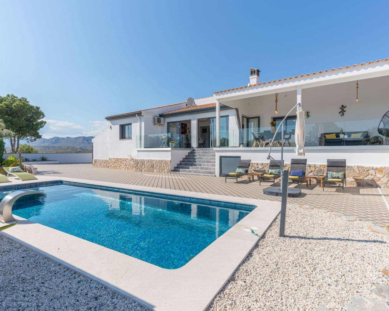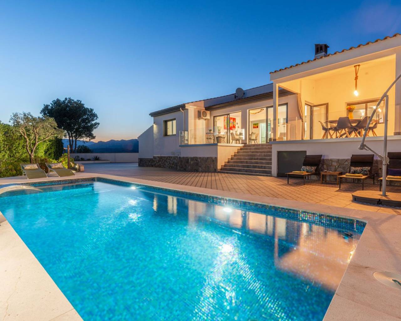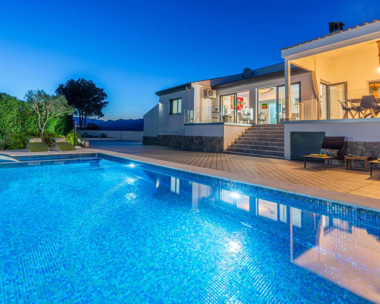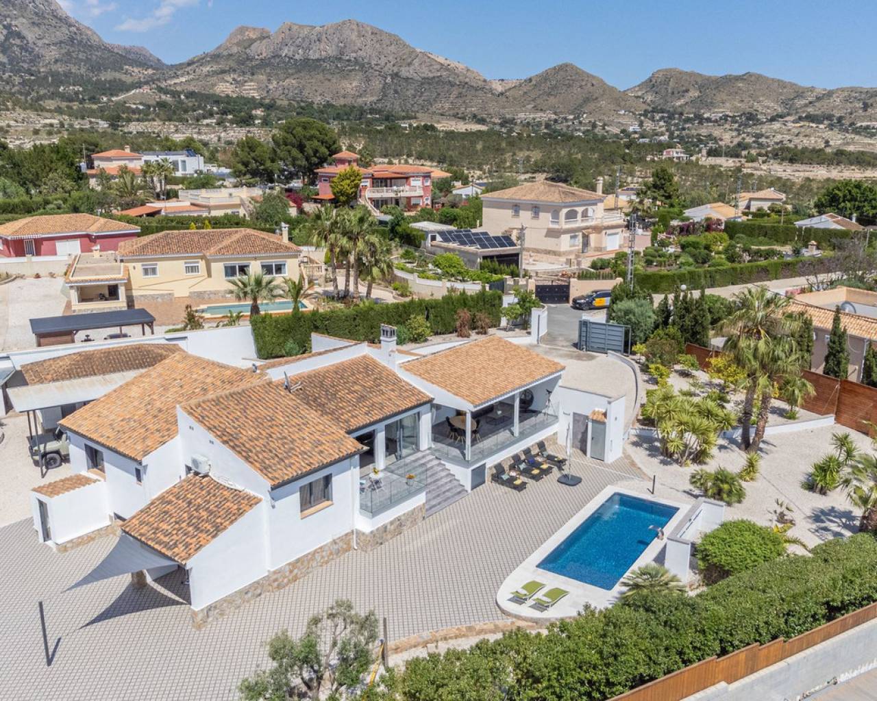 Villa Mirador del Sol – Un Refugio Privado con Vistas Costeras en Pla Lloma, Busot Ubicada en la codiciada zona de Pla Lloma, cerca del encantador pueblo de Busot, Villa Mirador del Sol es una residencia bellamente reformada que ofrece la combinación perfecta de privacidad, elegancia y estilo de vida mediterráneo. Con más de 250 m² de espacio interior y asentada en una parcela que multiplica por ocho su huella, esta excepcional vivienda brinda una oportunidad única de disfrutar de un entorno tranquilo a poca distancia de la costa. Situación ideal: a solo 4 minutos del centro de Busot, 20 minutos de las playas doradas de El Campello y San Juan, y a 30–35 minutos de la ciudad de Alicante y su aeropuerto internacional. Entrada y Exteriores Un tranquilo callejón sin salida conduce a las puertas automáticas de la propiedad, que se abren a una amplia entrada de grava con acceso a un garaje privado y dos marquesinas cubiertas, una de ellas lo suficientemente alta para una autocaravana. Diseño y Distribución La villa ofrece un alojamiento espacioso y flexible en dos niveles: Planta Principal • Elegante cocina en forma de L totalmente equipada, con generosas zonas de trabajo, conectada a un luminoso salón de planta abierta con estufa de leña. • Comedor adyacente con acceso directo a dos terrazas soleadas de 42 m² en total, con espectaculares vistas al mar y al campo. • Dos dormitorios dobles con armarios empotrados, incluyendo una suite principal con baño en suite. • Un segundo baño moderno se encuentra cerca del segundo dormitorio y el pasillo. Planta Inferior – Alojamiento para Invitados *Entrada independiente *Zona de salón y dormitorio de planta abierta *Dormitorio doble adicional con armarios empotrados *Baño compartido entre las dos zonas de descanso *Cocina exterior con barbacoa frente al alojamiento privado *Ideal para invitados o familia extensa Exteriores y Servicios • Piscina de diseño completamente nueva con cascada de acero inoxidable como pieza central del jardín • Amplias terrazas alrededor de la piscina, perfectas para descansar o recibir invitados • Sauna privada y zona de ejercicio exterior para el bienestar y la relajación • Parcela ajardinada con grava, árboles mediterráneos maduros, arbustos y setos • Aproximadamente 750 m² de jardín • Baño exterior junto a la zona de barbacoa cubierta, ideal para comidas al aire libre Orientación y Ambiente: La villa tiene orientación suroeste, lo que maximiza la luz natural y permite disfrutar de impresionantes puestas de sol sobre las colinas y hacia la costa lejana.