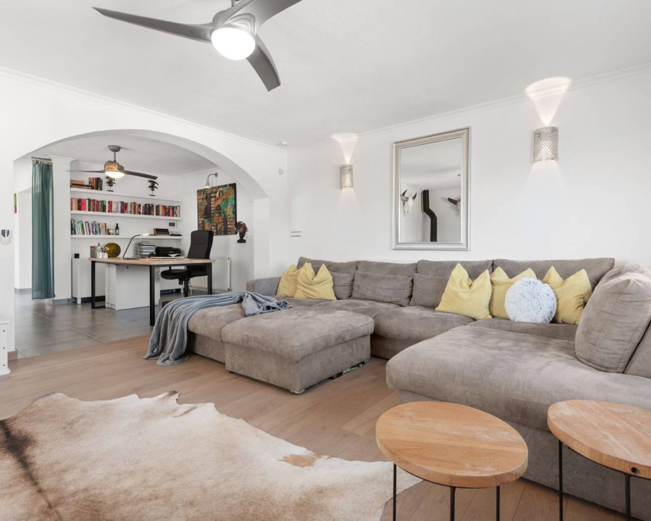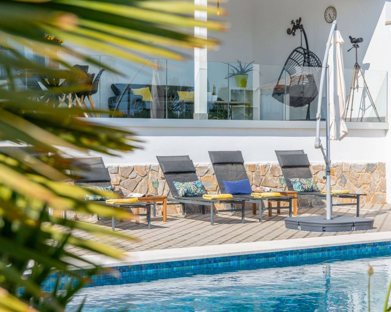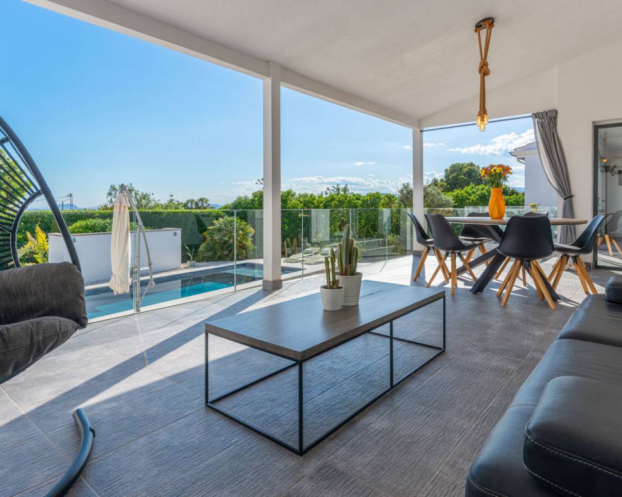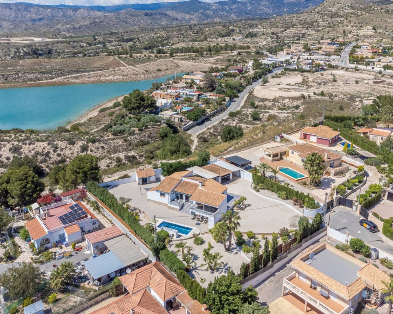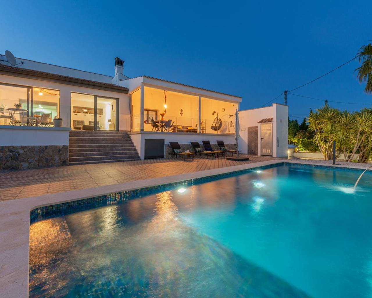 Villa Mirador del Sol – Un Refugio Privado con Vistas Costeras en Pla Lloma, Busot Ubicada en la codiciada zona de Pla Lloma, cerca del encantador pueblo de Busot, Villa Mirador del Sol es una residencia bellamente reformada que ofrece la combinación perfecta de privacidad, elegancia y estilo de vida mediterráneo. Con más de 250 m² de espacio interior y asentada en una parcela que multiplica por ocho su huella, esta excepcional vivienda brinda una oportunidad única de disfrutar de un entorno tranquilo a poca distancia de la costa. Situación ideal: a solo 4 minutos del centro de Busot, 20 minutos de las playas doradas de El Campello y San Juan, y a 30–35 minutos de la ciudad de Alicante y su aeropuerto internacional. Entrada y Exteriores Un tranquilo callejón sin salida conduce a las puertas automáticas de la propiedad, que se abren a una amplia entrada de grava con acceso a un garaje privado y dos marquesinas cubiertas, una de ellas lo suficientemente alta para una autocaravana. Diseño y Distribución La villa ofrece un alojamiento espacioso y flexible en dos niveles: Planta Principal • Elegante cocina en forma de L totalmente equipada, con generosas zonas de trabajo, conectada a un luminoso salón de planta abierta con estufa de leña. • Comedor adyacente con acceso directo a dos terrazas soleadas de 42 m² en total, con espectaculares vistas al mar y al campo. • Dos dormitorios dobles con armarios empotrados, incluyendo una suite principal con baño en suite. • Un segundo baño moderno se encuentra cerca del segundo dormitorio y el pasillo. Planta Inferior – Alojamiento para Invitados *Entrada independiente *Zona de salón y dormitorio de planta abierta *Dormitorio doble adicional con armarios empotrados *Baño compartido entre las dos zonas de descanso *Cocina exterior con barbacoa frente al alojamiento privado *Ideal para invitados o familia extensa Exteriores y Servicios • Piscina de diseño completamente nueva con cascada de acero inoxidable como pieza central del jardín • Amplias terrazas alrededor de la piscina, perfectas para descansar o recibir invitados • Sauna privada y zona de ejercicio exterior para el bienestar y la relajación • Parcela ajardinada con grava, árboles mediterráneos maduros, arbustos y setos • Aproximadamente 750 m² de jardín • Baño exterior junto a la zona de barbacoa cubierta, ideal para comidas al aire libre Orientación y Ambiente: La villa tiene orientación suroeste, lo que maximiza la luz natural y permite disfrutar de impresionantes puestas de sol sobre las colinas y hacia la costa lejana.