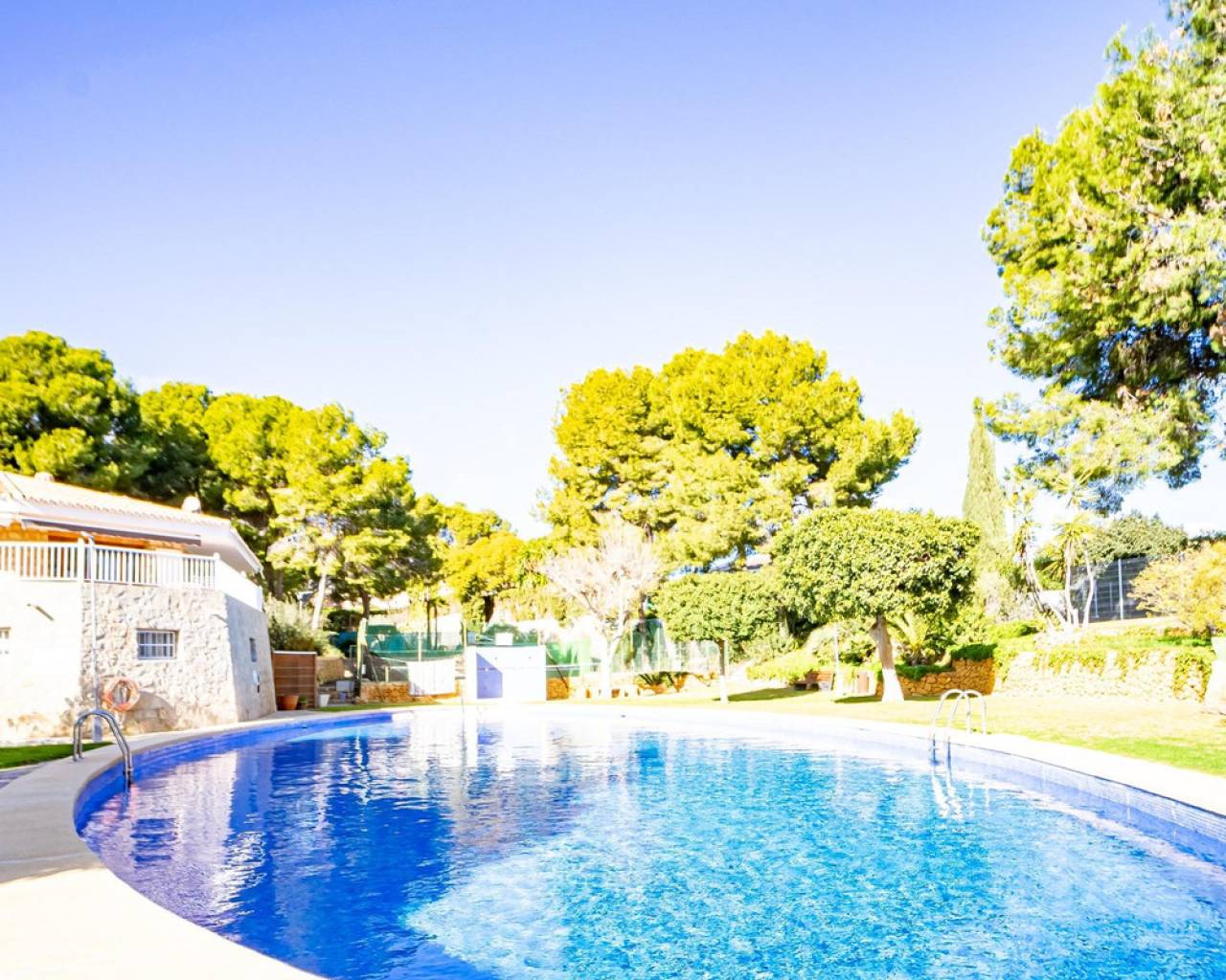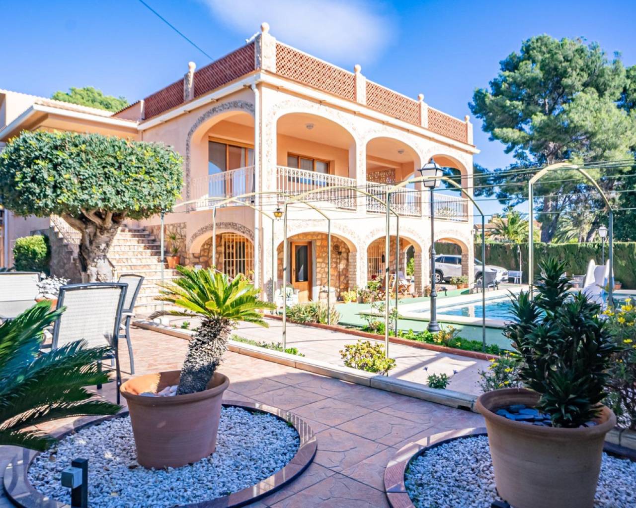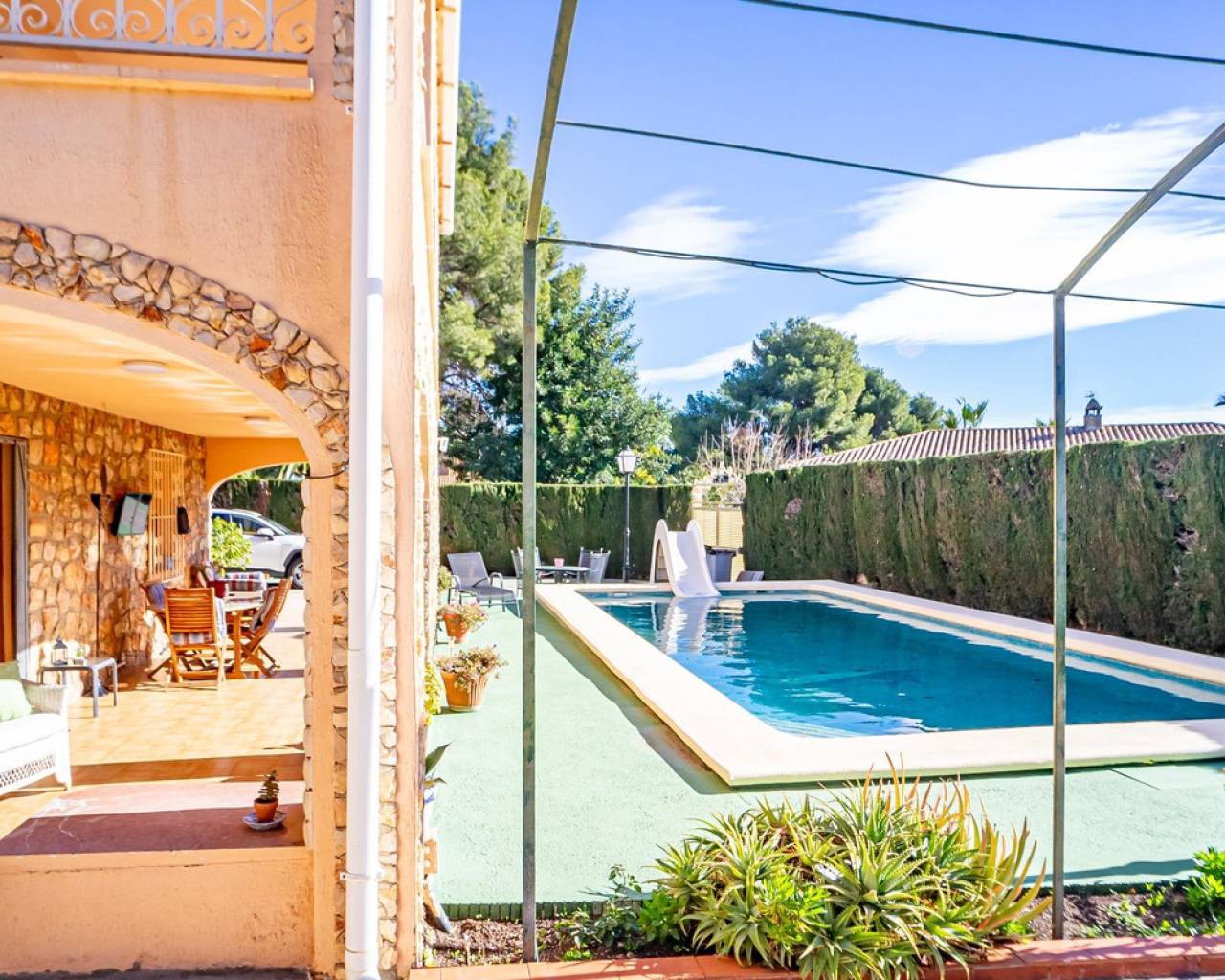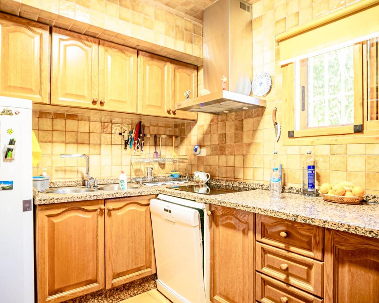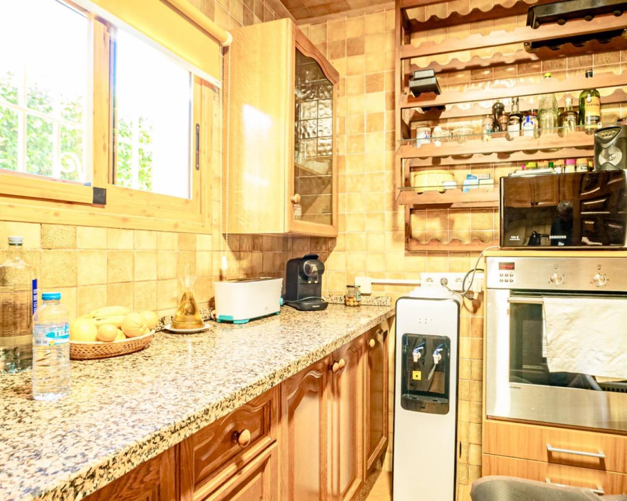 Este chalet es una casa grande y perfecta para una familia. En la planta baja hay dos dormitorios, un salón grande con chimenea, un baño con ducha y cocina. Esta planta tiene su propia entrada y se puede utilizar como apartamento independente. En esta planta también hay un garaje grande. En la segunda planta, comunicada con la inferior mediante una escalera interior, tiene también su propia entrada. Dispone de recibidor, cocina, un salón grande con chimenea, 3 dormitorios, uno se utiliza como vestidor, y 2 baños. El dormitorio principal es amplio con baño en-suite. Desde el dormitorio principal y el salón se puede salir a un balcón grande cubierto, con vistas panorámicas al mar, Benidorm y la montaña. Desde el balcón se puede subir a un solarium con vistas aún mejores si cabe. Alrededor de la casa hay un jardín llano, con una cocina exterior, parking para varios coches y piscina. En la vivienda hay varias máquinas de aire acondicionado con frío y calor. La propiedad pertenece a una urbanización tranquila, con una zona comunitaria que incluye piscina, jardín, 2 pistas de tenis y sala para fiestas y celebraciones. A tan solo un par de minutos en coche se llega a Benidorm y a todos los servicios.
