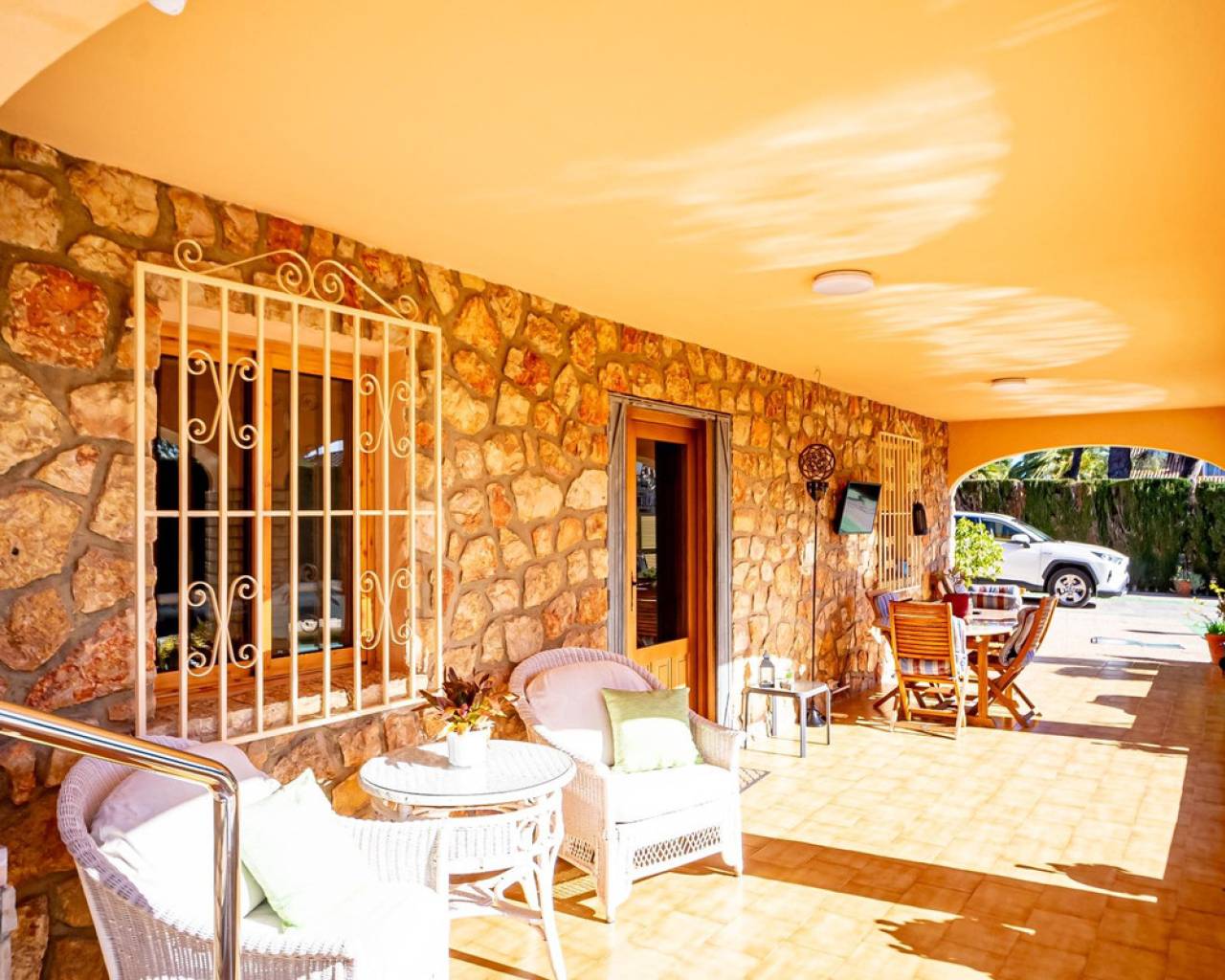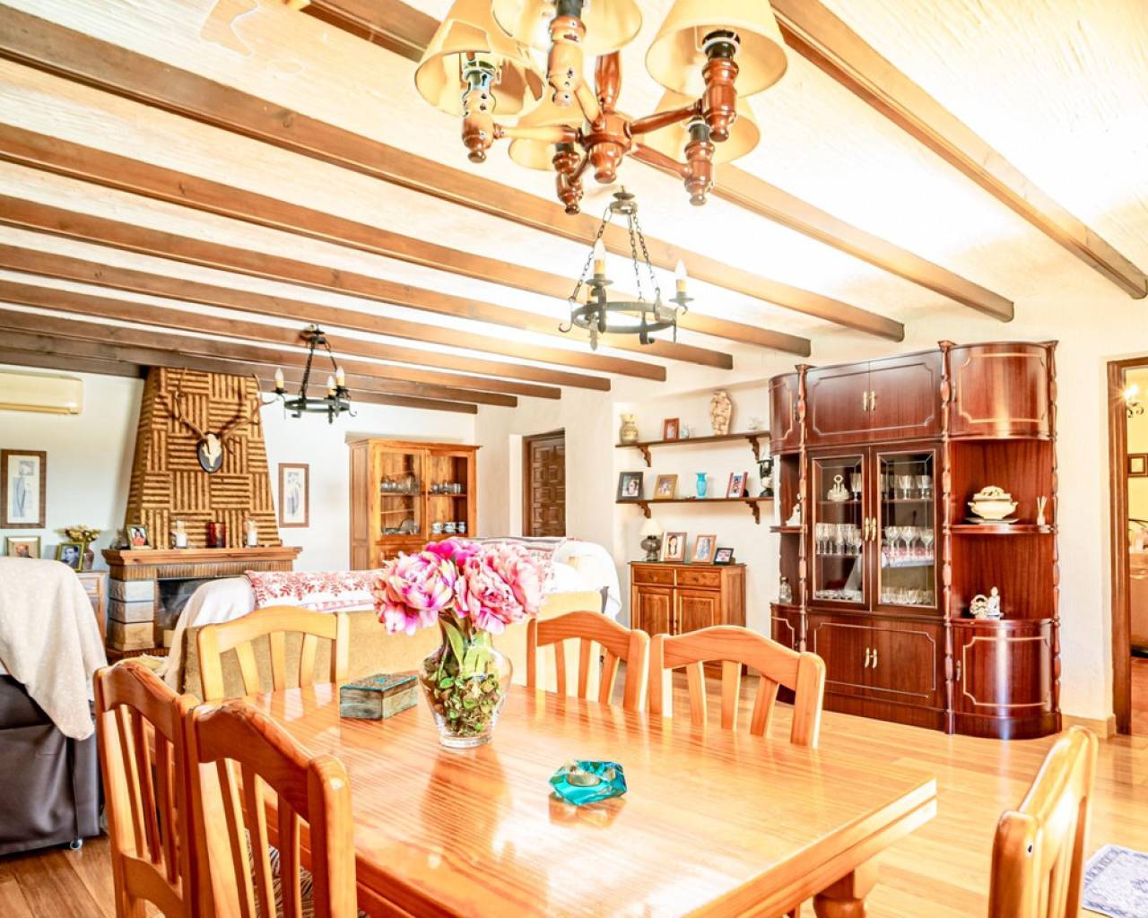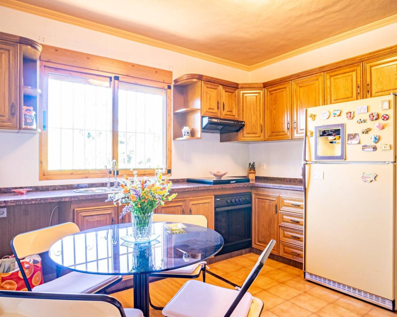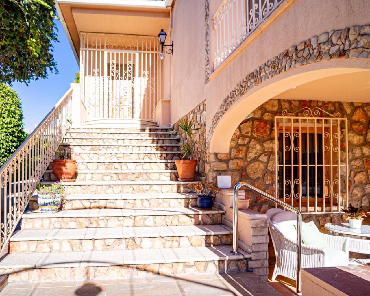 Este chalet es una casa grande y perfecta para una familia. En la planta baja hay dos dormitorios, un salón grande con chimenea, un baño con ducha y cocina. Esta planta tiene su propia entrada y se puede utilizar como apartamento independente. En esta planta también hay un garaje grande. En la segunda planta, comunicada con la inferior mediante una escalera interior, tiene también su propia entrada. Dispone de recibidor, cocina, un salón grande con chimenea, 3 dormitorios, uno se utiliza como vestidor, y 2 baños. El dormitorio principal es amplio con baño en-suite. Desde el dormitorio principal y el salón se puede salir a un balcón grande cubierto, con vistas panorámicas al mar, Benidorm y la montaña. Desde el balcón se puede subir a un solarium con vistas aún mejores si cabe. Alrededor de la casa hay un jardín llano, con una cocina exterior, parking para varios coches y piscina. En la vivienda hay varias máquinas de aire acondicionado con frío y calor. La propiedad pertenece a una urbanización tranquila, con una zona comunitaria que incluye piscina, jardín, 2 pistas de tenis y sala para fiestas y celebraciones. A tan solo un par de minutos en coche se llega a Benidorm y a todos los servicios.