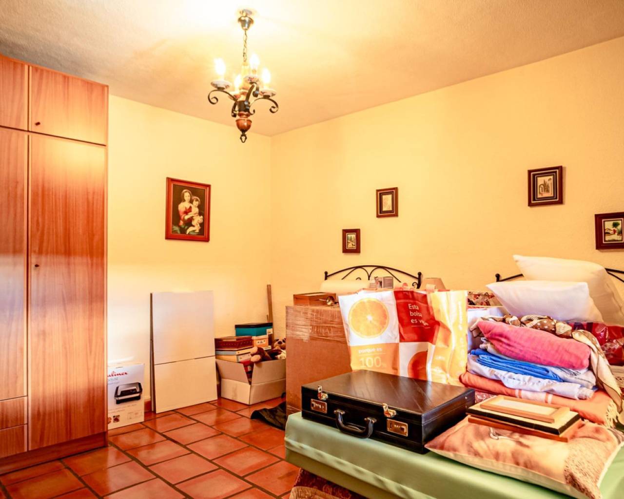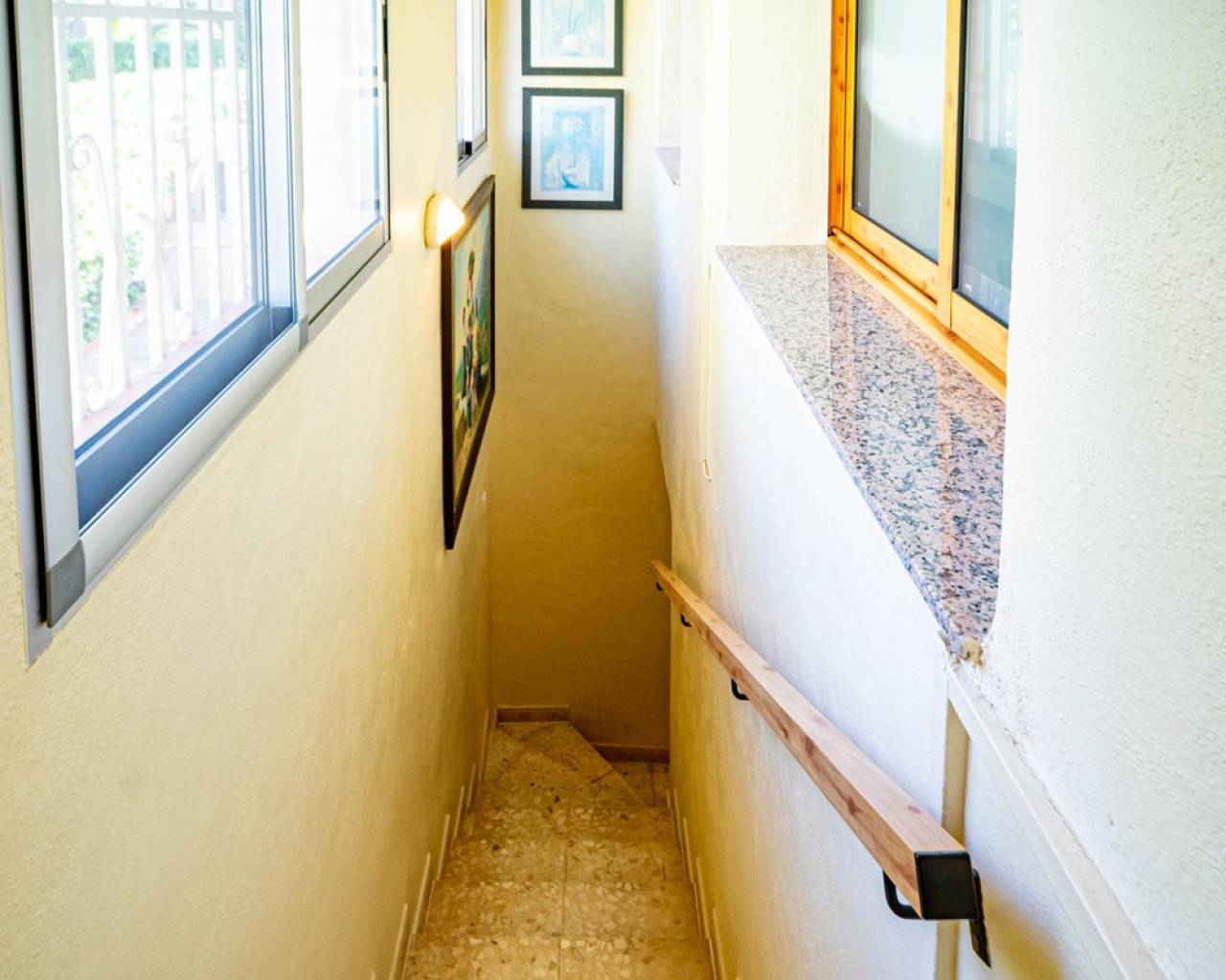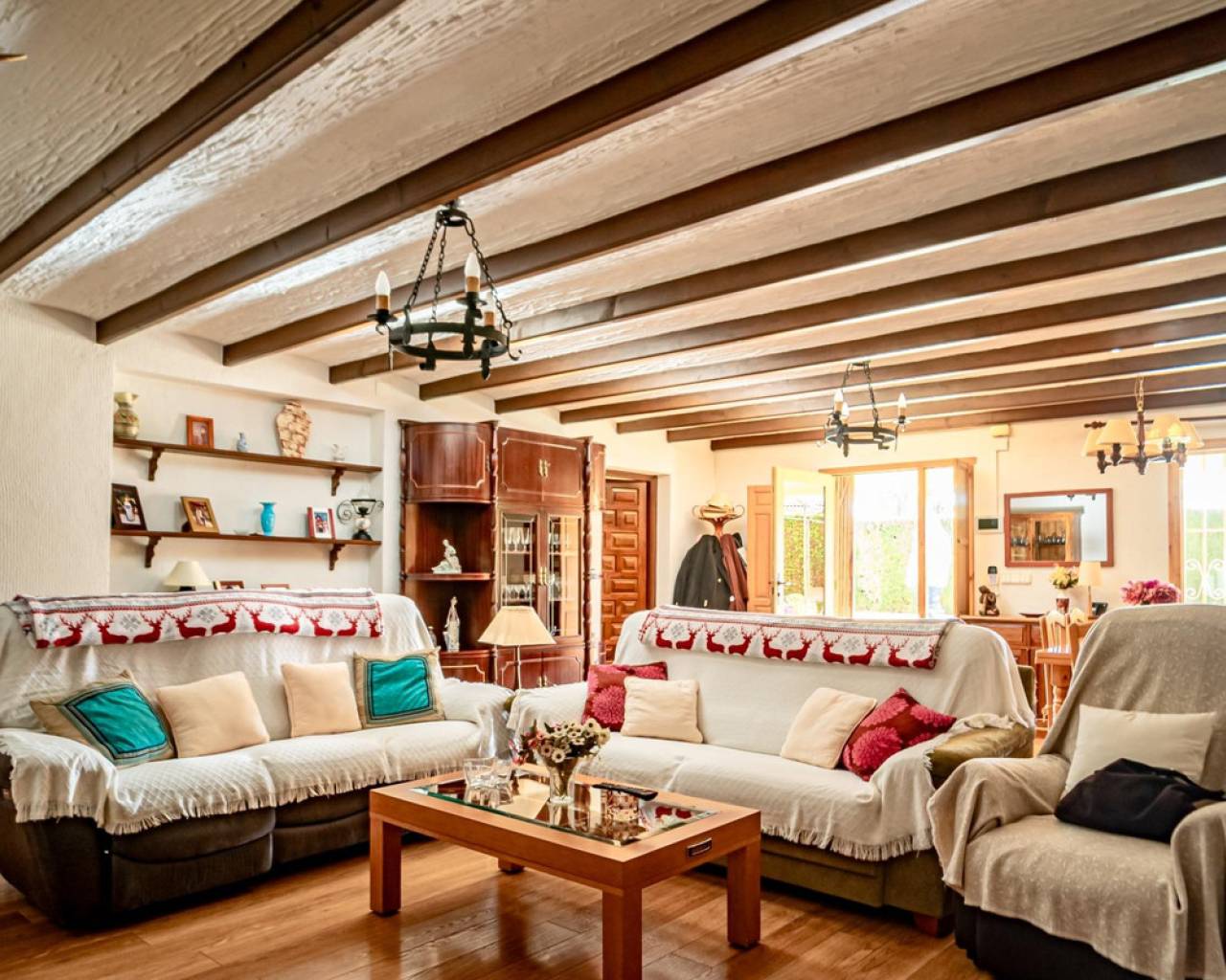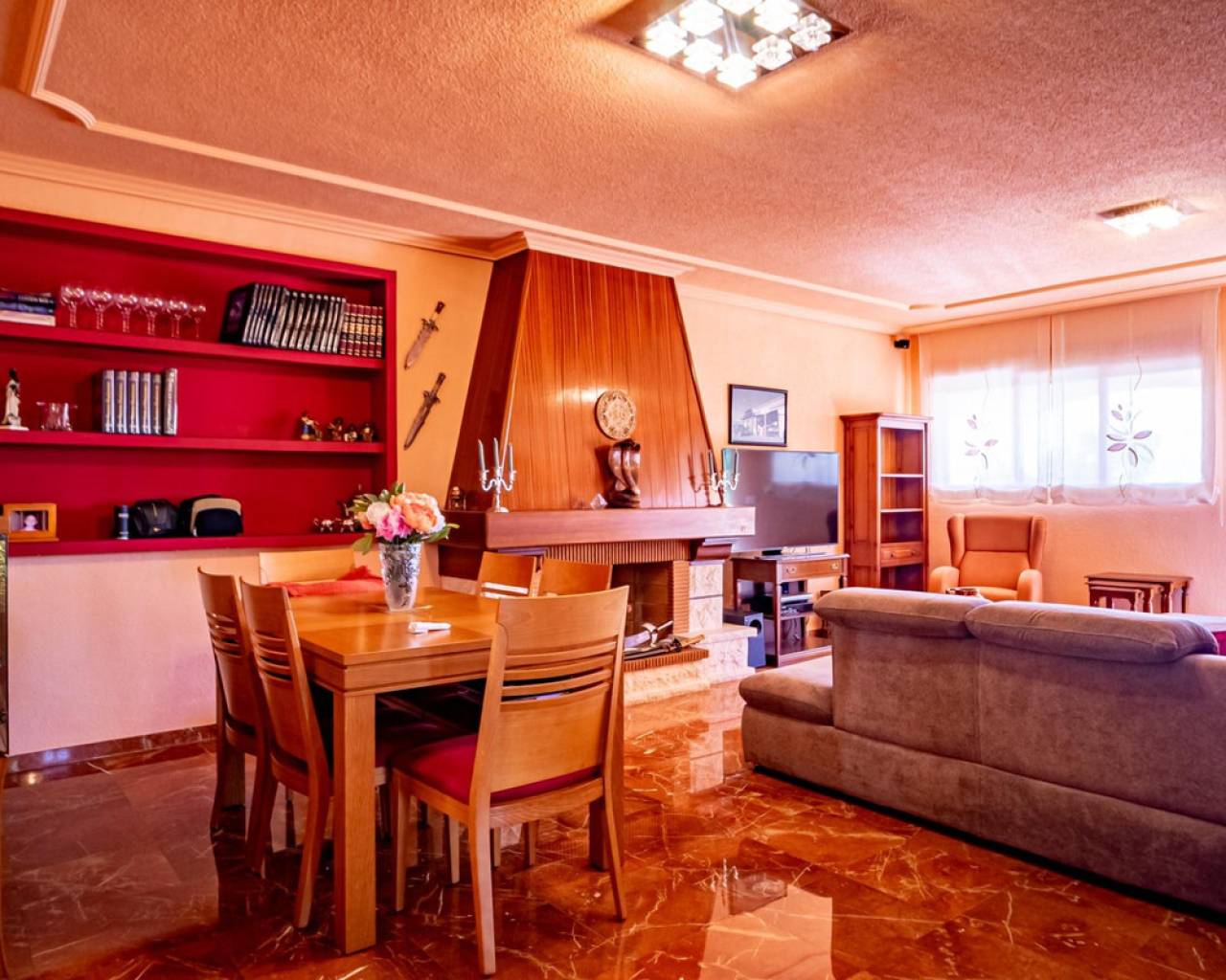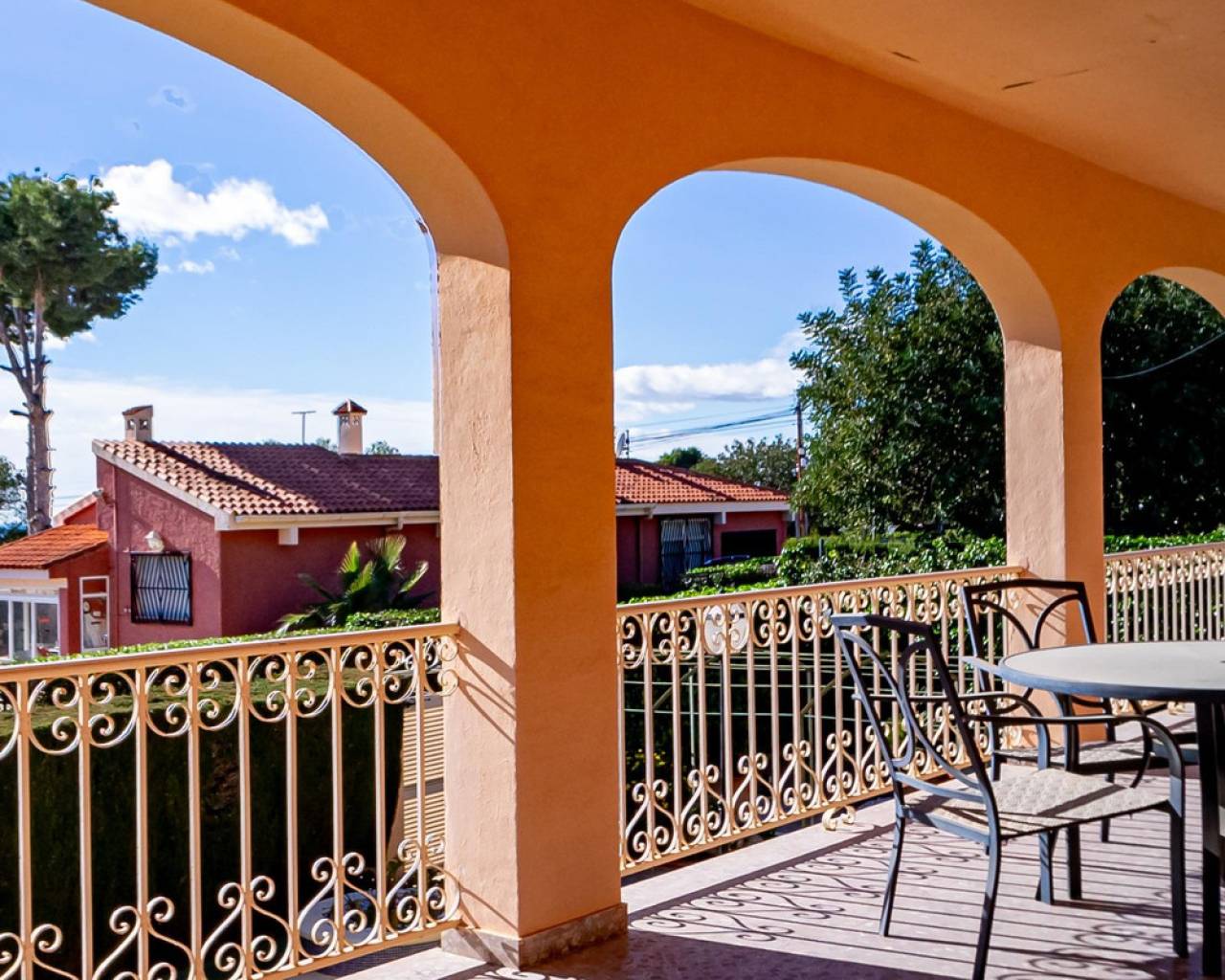 Este chalet es una casa grande y perfecta para una familia. En la planta baja hay dos dormitorios, un salón grande con chimenea, un baño con ducha y cocina. Esta planta tiene su propia entrada y se puede utilizar como apartamento independente. En esta planta también hay un garaje grande. En la segunda planta, comunicada con la inferior mediante una escalera interior, tiene también su propia entrada. Dispone de recibidor, cocina, un salón grande con chimenea, 3 dormitorios, uno se utiliza como vestidor, y 2 baños. El dormitorio principal es amplio con baño en-suite. Desde el dormitorio principal y el salón se puede salir a un balcón grande cubierto, con vistas panorámicas al mar, Benidorm y la montaña. Desde el balcón se puede subir a un solarium con vistas aún mejores si cabe. Alrededor de la casa hay un jardín llano, con una cocina exterior, parking para varios coches y piscina. En la vivienda hay varias máquinas de aire acondicionado con frío y calor. La propiedad pertenece a una urbanización tranquila, con una zona comunitaria que incluye piscina, jardín, 2 pistas de tenis y sala para fiestas y celebraciones. A tan solo un par de minutos en coche se llega a Benidorm y a todos los servicios.
