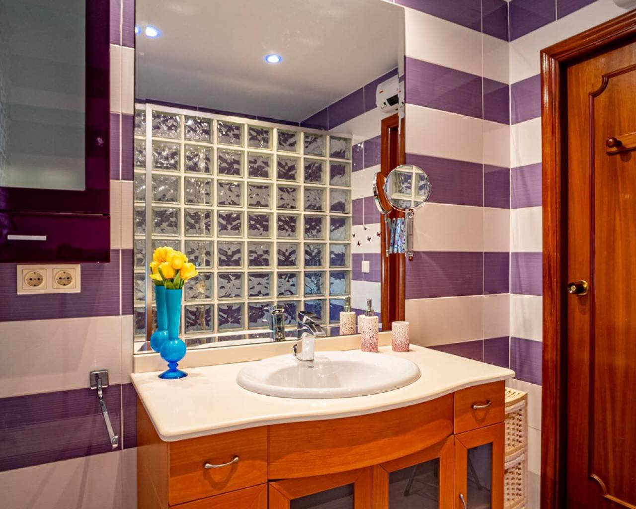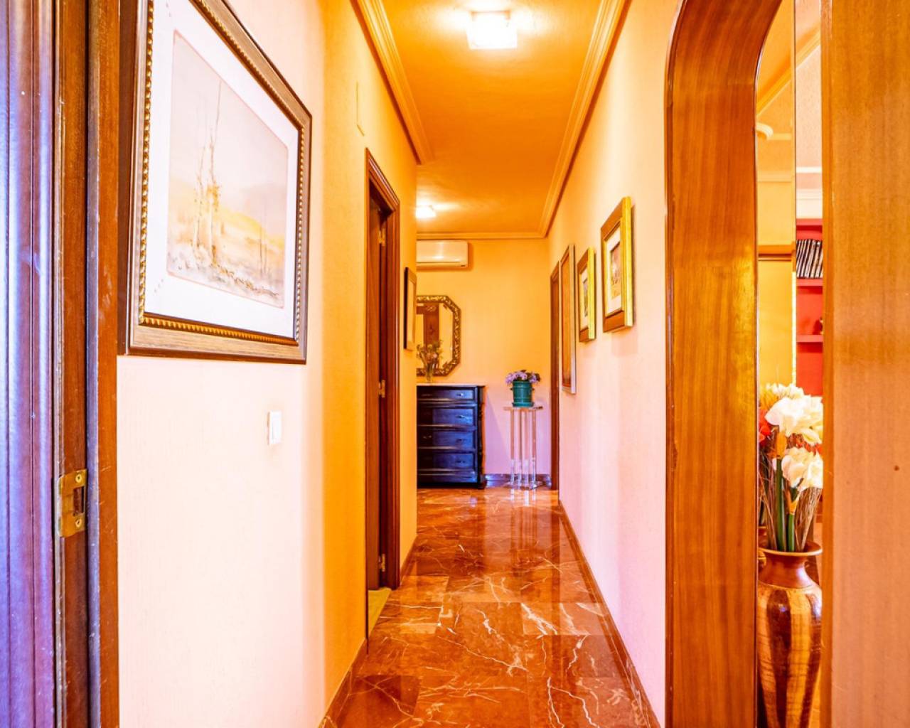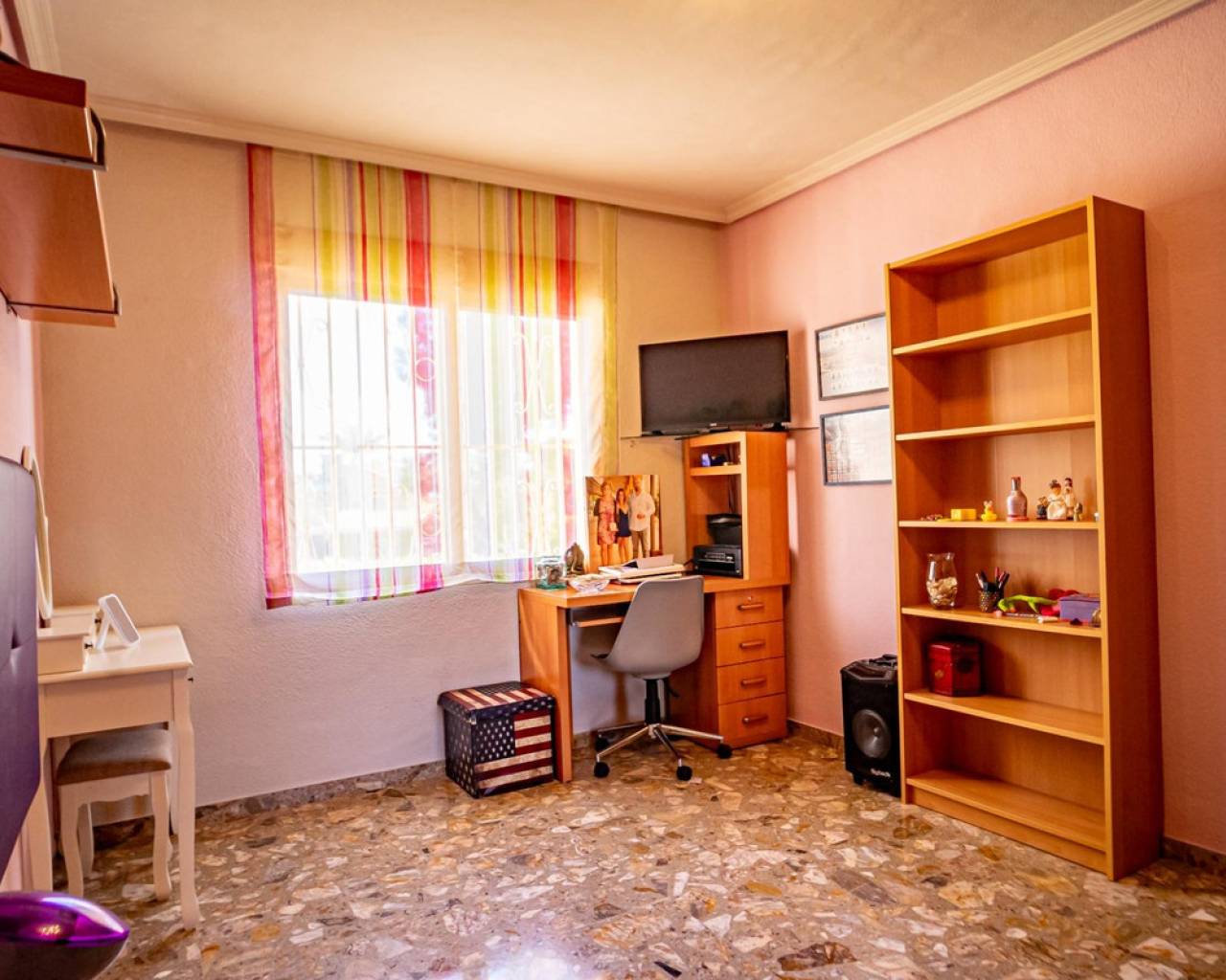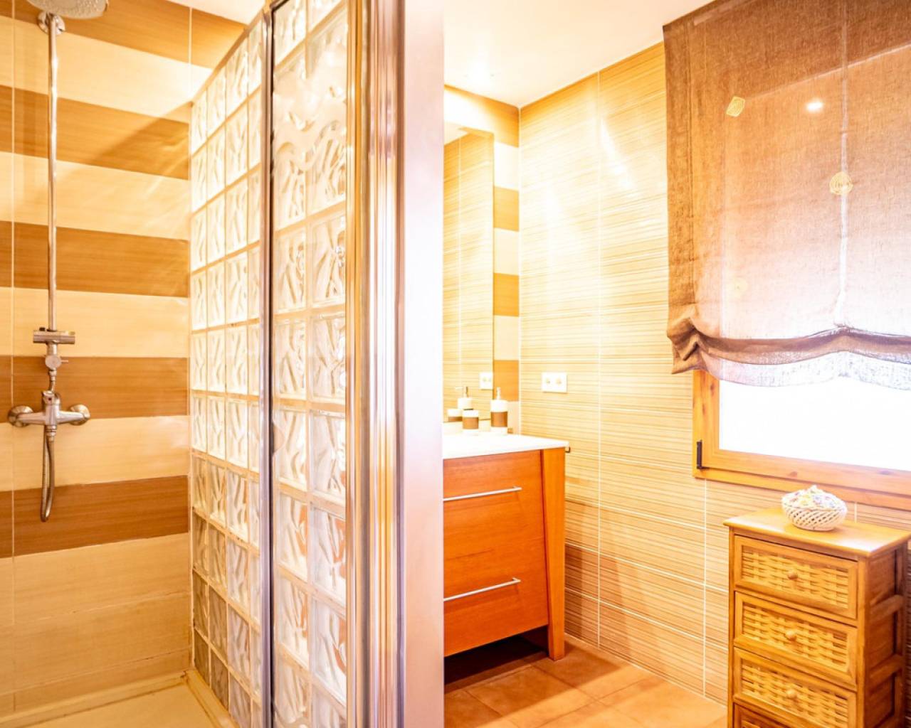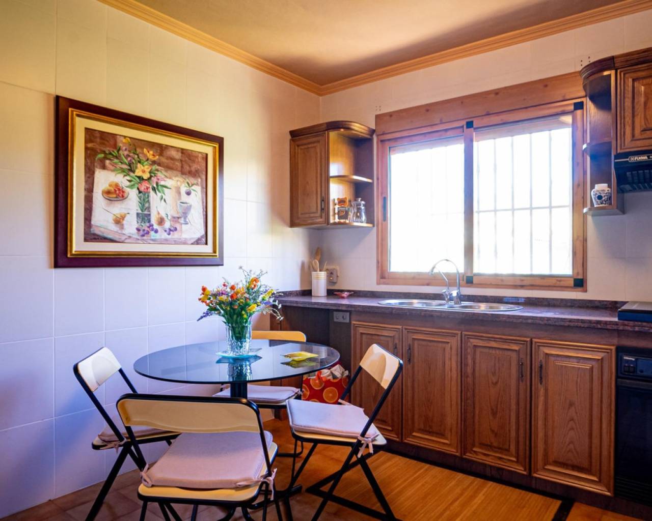 Este chalet es una casa grande y perfecta para una familia. En la planta baja hay dos dormitorios, un salón grande con chimenea, un baño con ducha y cocina. Esta planta tiene su propia entrada y se puede utilizar como apartamento independente. En esta planta también hay un garaje grande. En la segunda planta, comunicada con la inferior mediante una escalera interior, tiene también su propia entrada. Dispone de recibidor, cocina, un salón grande con chimenea, 3 dormitorios, uno se utiliza como vestidor, y 2 baños. El dormitorio principal es amplio con baño en-suite. Desde el dormitorio principal y el salón se puede salir a un balcón grande cubierto, con vistas panorámicas al mar, Benidorm y la montaña. Desde el balcón se puede subir a un solarium con vistas aún mejores si cabe. Alrededor de la casa hay un jardín llano, con una cocina exterior, parking para varios coches y piscina. En la vivienda hay varias máquinas de aire acondicionado con frío y calor. La propiedad pertenece a una urbanización tranquila, con una zona comunitaria que incluye piscina, jardín, 2 pistas de tenis y sala para fiestas y celebraciones. A tan solo un par de minutos en coche se llega a Benidorm y a todos los servicios.