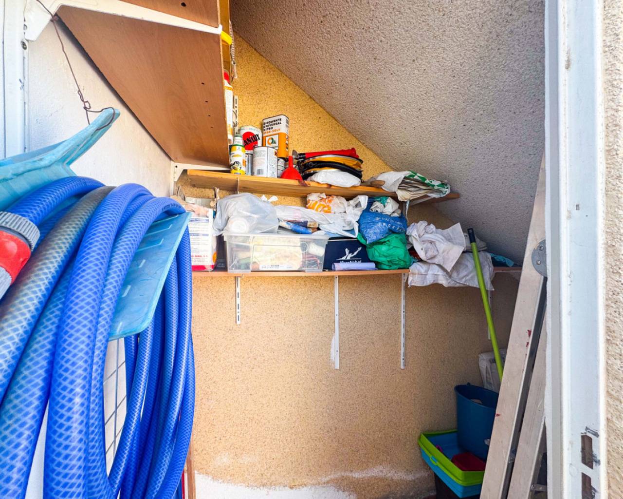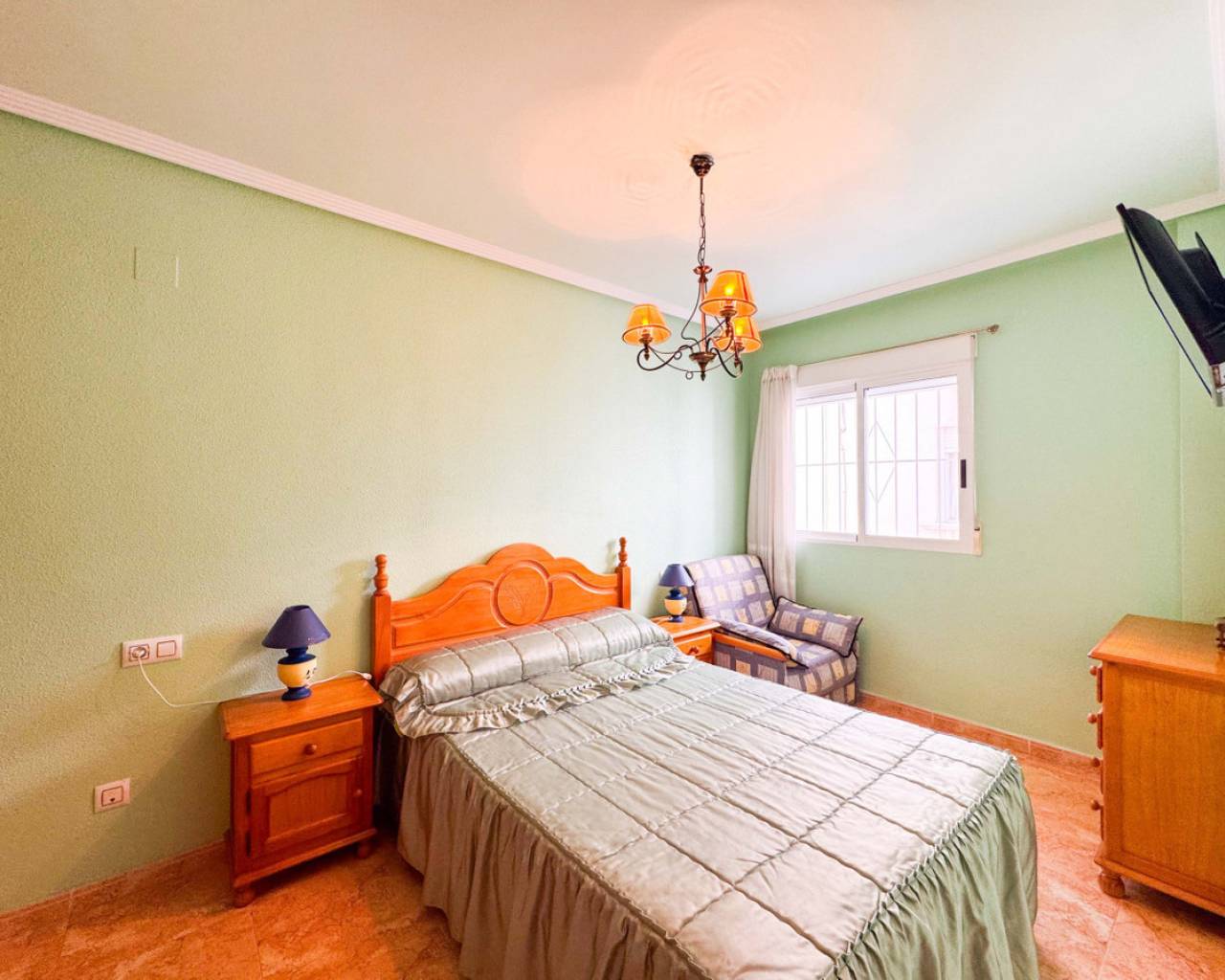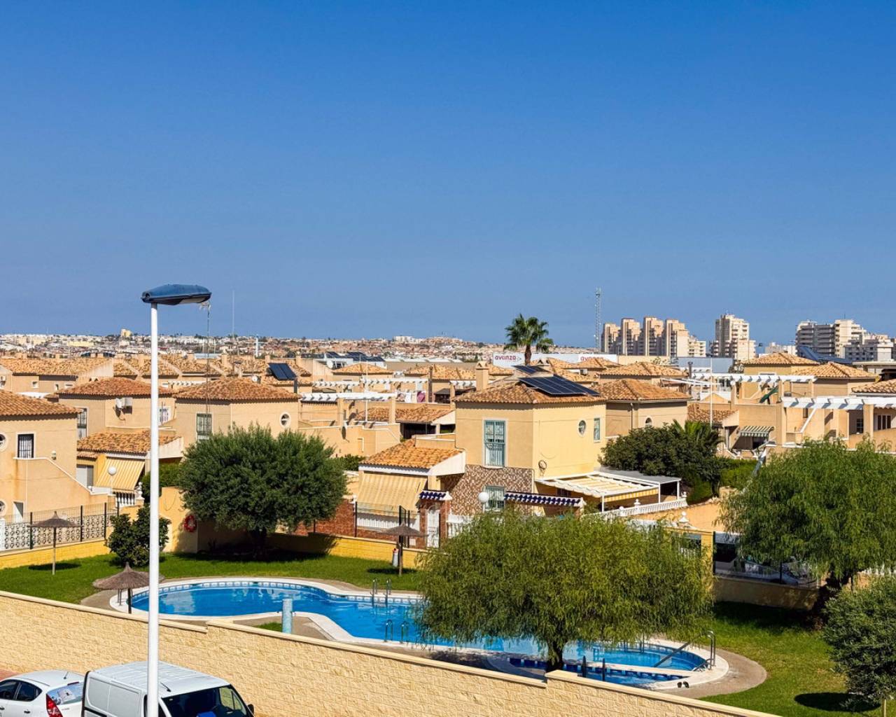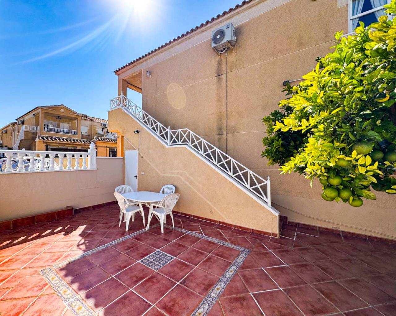 Este bungalow planta alta ubicado en la Urbanización Parque de las Naciones ofrece una amplia terraza de 50 m², un solárium privado de 26 m² y una plaza de garaje incluida. La propiedad se distribuye en un salón-comedor luminoso, una cocina independiente totalmente equipada, dos dormitorios con armarios empotrados y un baño completo con bañera. Además, dispone de un porche privado de 10 m² y acceso a un solárium de 26 m² mediante una escalera exterior. La urbanización cuenta con una piscina comunitaria y está situada en un entorno tranquilo con todos los servicios cercanos: comercios, zonas verdes, transporte público y áreas de ocio. Esta casa es ideal tanto para residencia como para inversión, con opciones de alquiler por temporada. Contáctenos para programar una visita presencial o virtual y solicitar planos detallados.