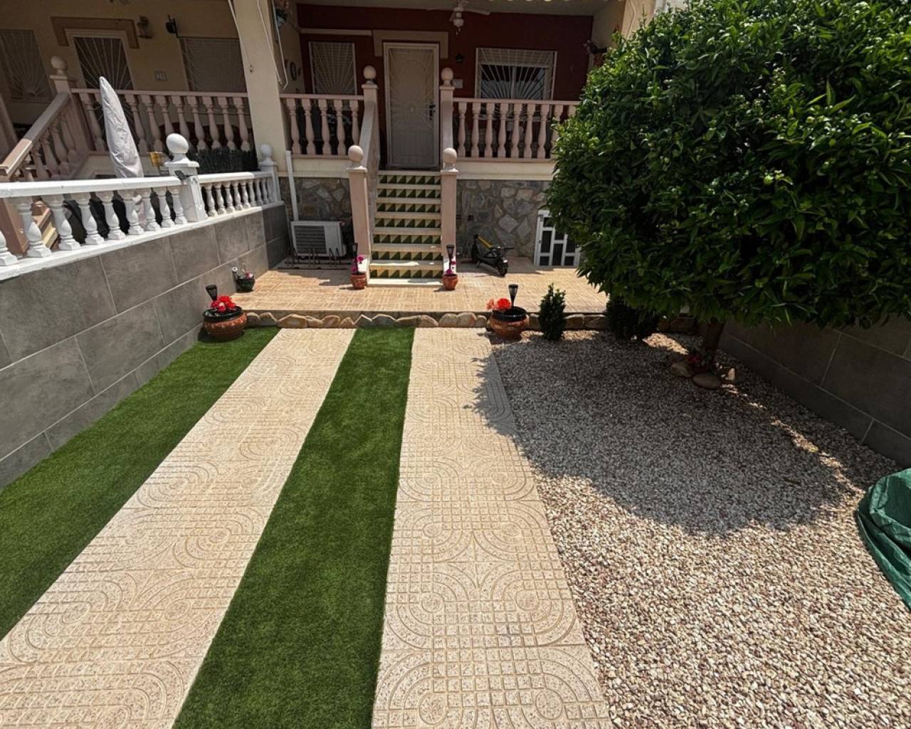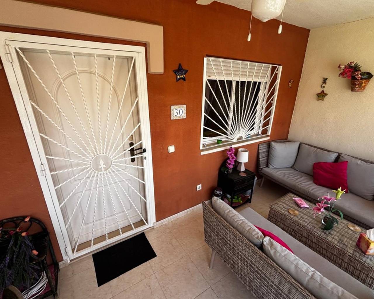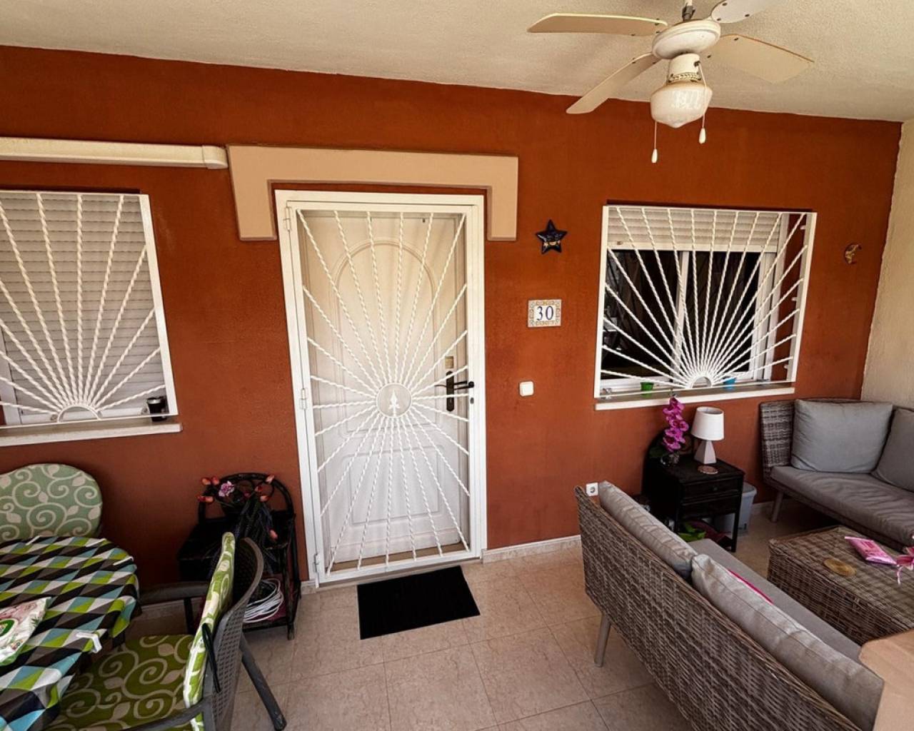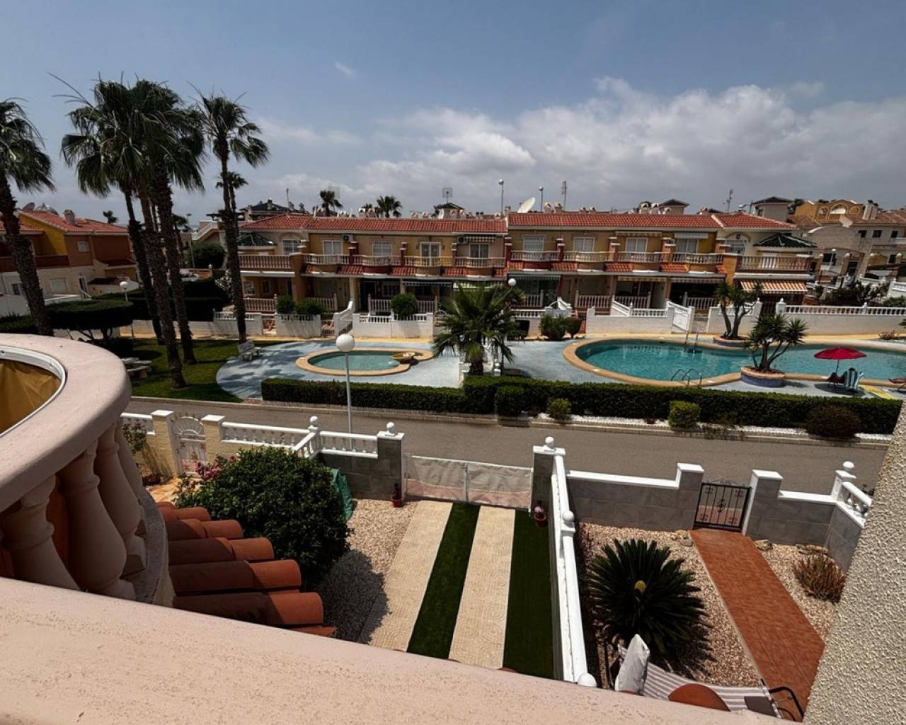 We have a beautiful 3 bedroom 2 bathroom west facing Lola style house for sale in the very popular area of Dona Pepa, part of Ciudad Quesada on the Costa Blanca. It is located close to many amenities including bars, restaurants, supermarkets and the long sandy beaches at Guardamar del Segura are just a 7 minute drive. The property is found inside a well established gated community and overlooks the beautiful swimming pool. The current owner has kept the home maintained to a high standard.The front of the property has a covered terrace with plenty of garden space and drive for car.