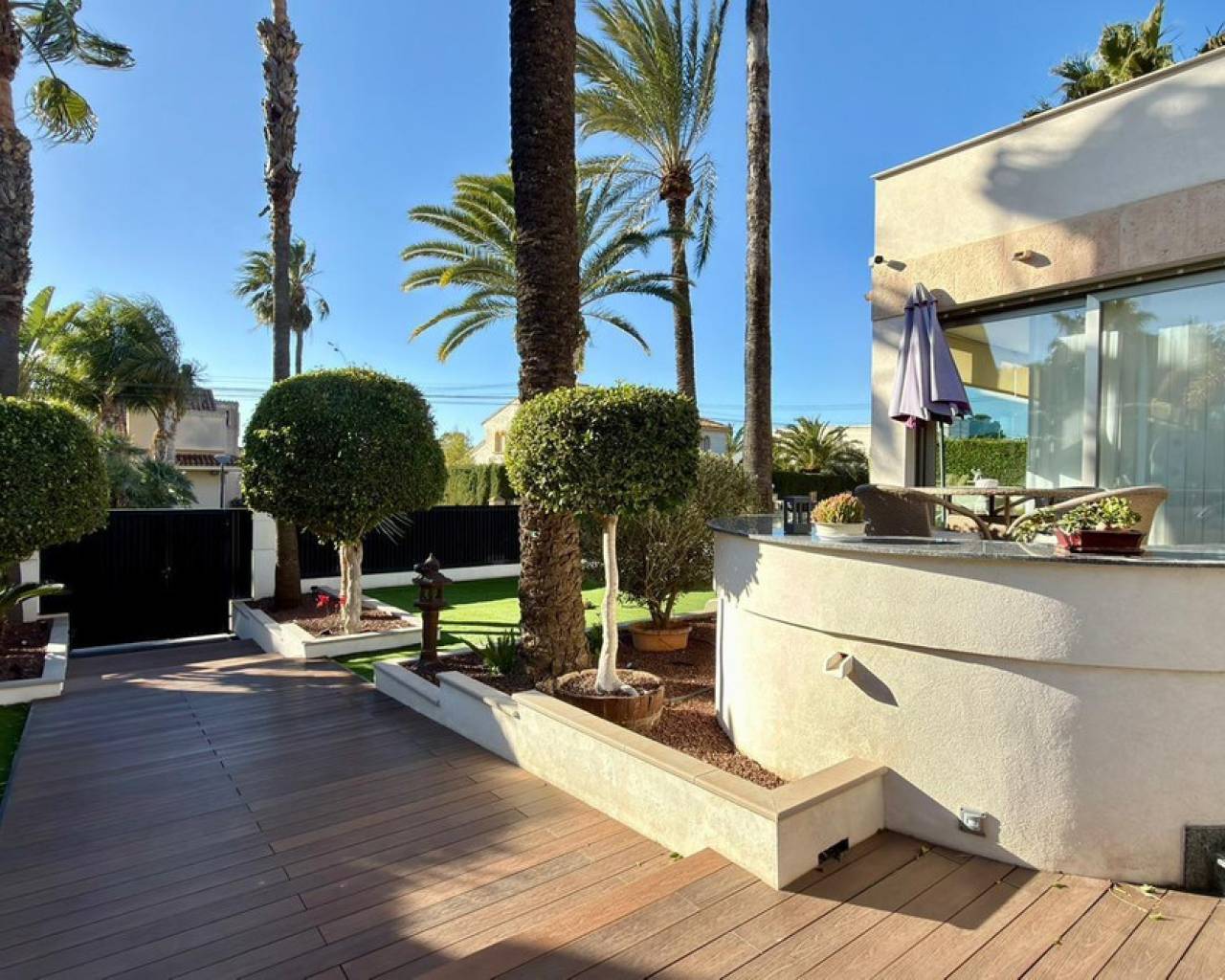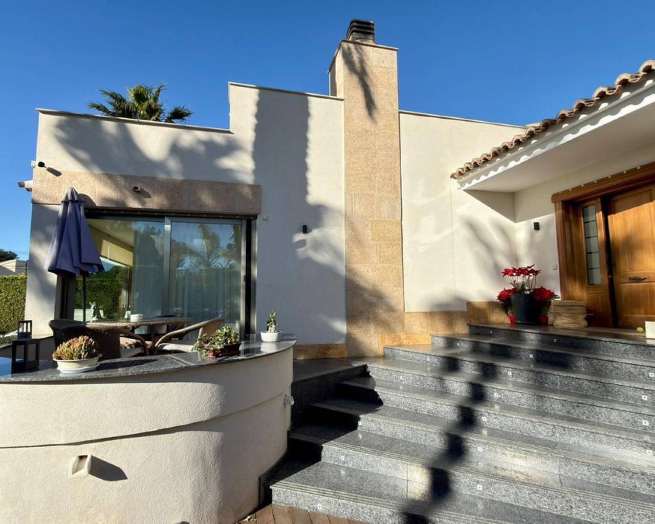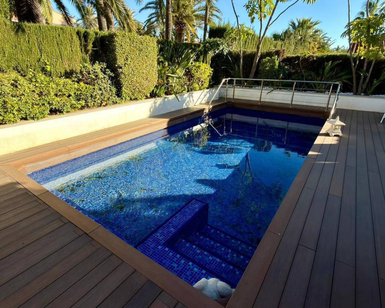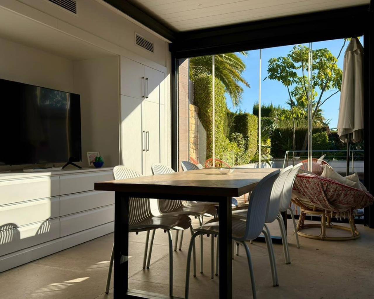We present to you an exclusive luxury villa located in a prestigious residential area between Benidorm and La Nucía. The property is situated on a spacious plot of 984 m² and has a built area of 258 m², distributed over two floors that perfectly combine elegance, comfort, and functionality.Upon entering the house, a cozy hallway leads to a spacious and bright living room, an elegant dining room, and a charming glazed terrace with marble floors, from where you can enjoy beautiful views of the well-tended garden surrounding the house.The home has been completely renovated using high-quality natural materials, including premium wooden floors. The resting area has two comfortable bedrooms that share a complete bathroom, in addition to a large master suite with a spacious dressing room and a bright en-suite bathroom with natural light, equipped with a bathtub, independent shower, and double sink.Additionally, the home features an independent bedroom with a private bathroom, ideal for guests or family members, offering maximum comfort and independence. This space is conveniently connected to the fully equipped kitchen and the laundry area.The kitchen has direct access to a side terrace, perfect for outdoor dining. From there, you can access an impressive glazed barbecue area with a courtesy bathroom and direct access, through an elegant wooden deck, to the pool and solarium.On the plot, there is also a space designated for the storage of sports and nautical equipment. The upper floor has a spacious multifunctional room that can be used as an office, game room, or leisure area, in addition to two cozy guest bedrooms that share a complete bathroom.The garden, carefully designed, combines different shades of green with majestic palm trees and abundant vegetation, creating an intimate, relaxing, and very exclusive atmosphere.The urbanization offers 24-hour private security, a communal pool, tennis courts, and a social club.A unique opportunity to acquire a truly exclusive property in one of the most sought-after areas of the Costa Blanca. Contact us to arrange a private visit.