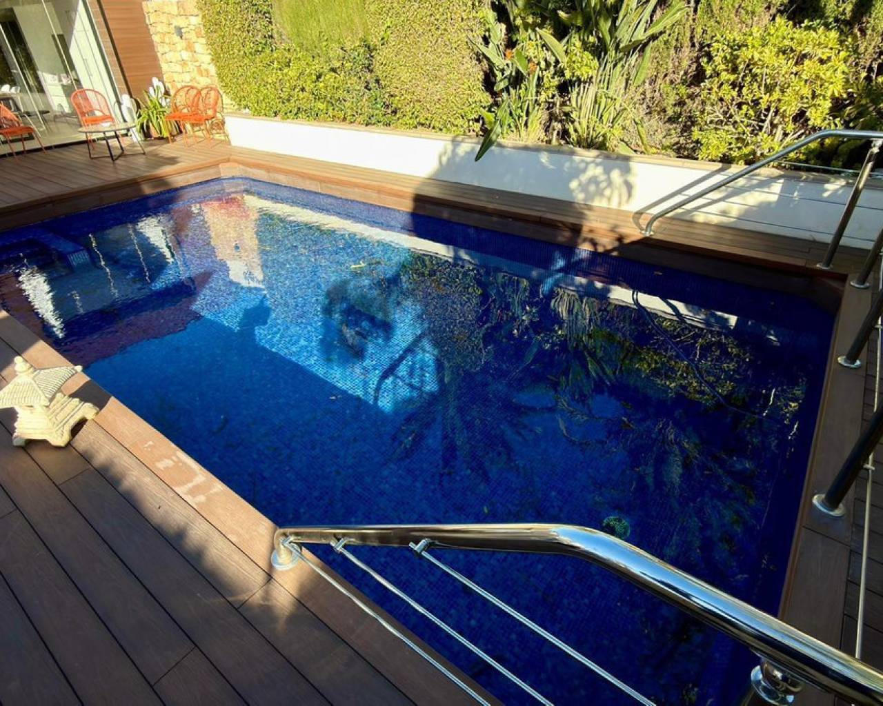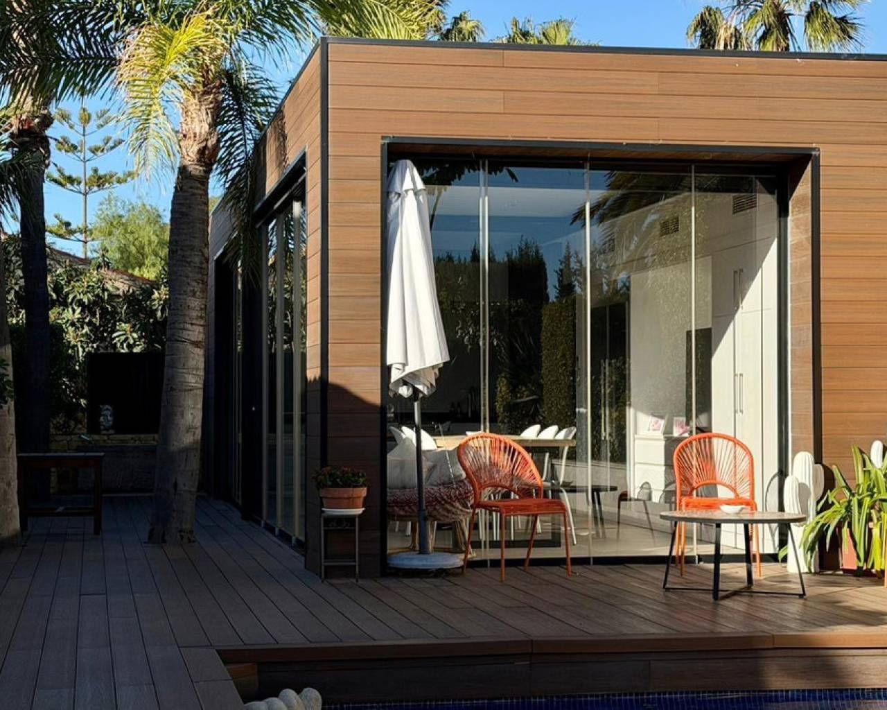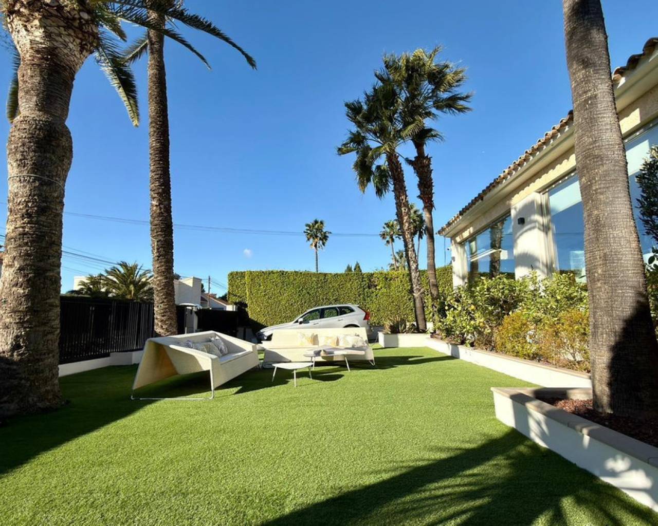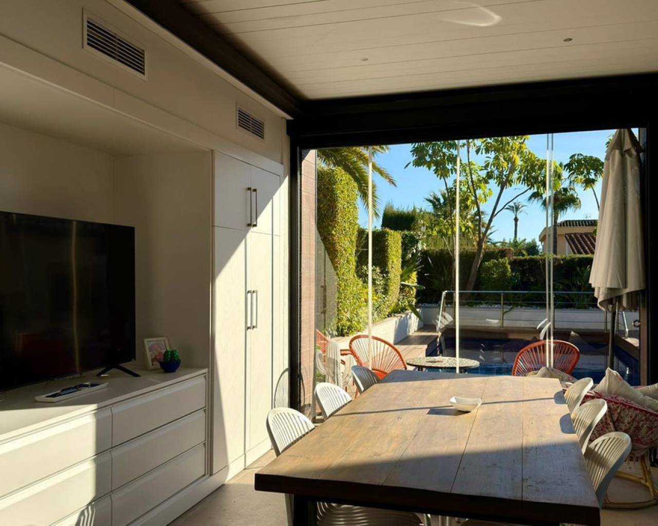 We present to you an exclusive luxury villa located in a prestigious residential area between Benidorm and La Nucía. The property is situated on a spacious plot of 984 m² and has a built area of 258 m², distributed over two floors that perfectly combine elegance, comfort, and functionality.Upon entering the house, a cozy hallway leads to a spacious and bright living room, an elegant dining room, and a charming glazed terrace with marble floors, from where you can enjoy beautiful views of the well-tended garden surrounding the house.The home has been completely renovated using high-quality natural materials, including premium wooden floors. The resting area has two comfortable bedrooms that share a complete bathroom, in addition to a large master suite with a spacious dressing room and a bright en-suite bathroom with natural light, equipped with a bathtub, independent shower, and double sink.Additionally, the home features an independent bedroom with a private bathroom, ideal for guests or family members, offering maximum comfort and independence. This space is conveniently connected to the fully equipped kitchen and the laundry area.The kitchen has direct access to a side terrace, perfect for outdoor dining. From there, you can access an impressive glazed barbecue area with a courtesy bathroom and direct access, through an elegant wooden deck, to the pool and solarium.On the plot, there is also a space designated for the storage of sports and nautical equipment. The upper floor has a spacious multifunctional room that can be used as an office, game room, or leisure area, in addition to two cozy guest bedrooms that share a complete bathroom.The garden, carefully designed, combines different shades of green with majestic palm trees and abundant vegetation, creating an intimate, relaxing, and very exclusive atmosphere.The urbanization offers 24-hour private security, a communal pool, tennis courts, and a social club.A unique opportunity to acquire a truly exclusive property in one of the most sought-after areas of the Costa Blanca. Contact us to arrange a private visit.