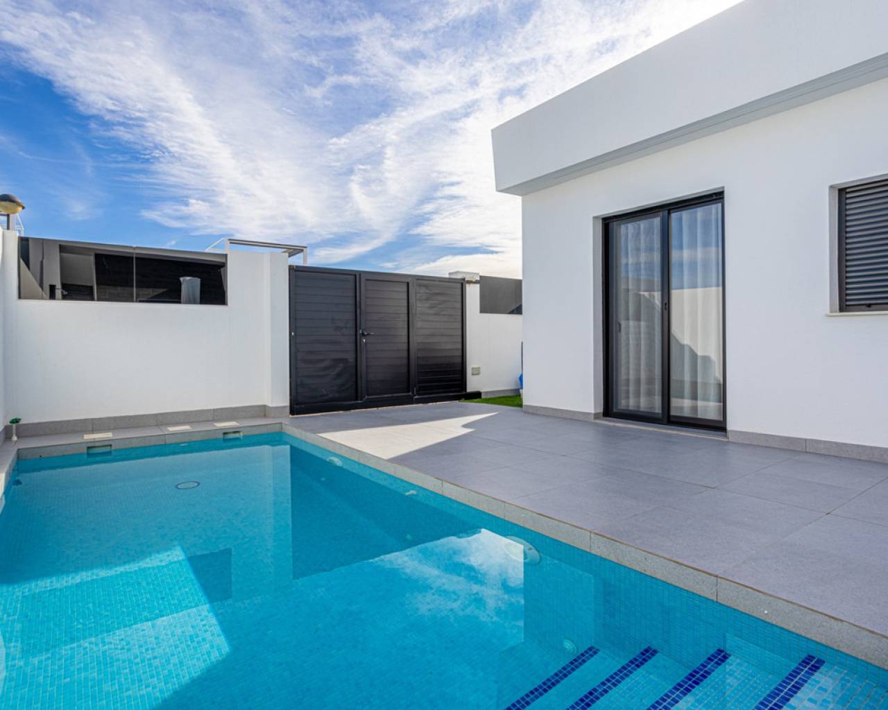 This charming detached villa offers the perfect balance of comfort, privacy, and Mediterranean living, situated in a quiet residential area of Torre-Pacheco, just minutes from all amenities. Built on a private plot of 151.71 m², the property has a built area of 85 m², all on one level. This makes the villa practical, accessible, and easy to maintain. Thanks to its east-facing orientation, the villa benefits from optimal natural light, making the interior bright throughout the day. Interiors, the property boasts three spacious bedrooms, all with fitted wardrobes, and two modern bathrooms, one of which is en-suite to the master bedroom. There is also a small laundry cupboard, both practical and discreet. The open-plan kitchen flows seamlessly into the living and dining area, creating a welcoming and functional space, ideal for both daily living and entertaining. The property is in excellent condition, ready to move into, and is sold fully furnished, including appliances and air conditioning for year-round comfort. Outdoors, this villa truly shines. The property boasts a private swimming pool surrounded by a well-proportioned garden, perfect for relaxing, sunbathing, or al fresco dining. A covered porch provides a shaded seating area, while the terrace and solarium offer additional space to soak up the sun, entertain, or simply unwind with unobstructed views and privacy. There is a shaded area on the upper level of the solarium, along with an outdoor kitchen, ideal for barbecues. The property also includes a private parking space on the plot and an intercom system for added security. Prime LocationBeaches: 20 minutesMurcia International Airport: 15 minutesLeisure areas, shops, and restaurants: 5 minutesGolf courses: 5 minutes This property is ideal as a permanent residence, holiday home, or investment property, thanks to its excellent location, outdoor space, and ready-to-move-in condition. A fantastic opportunity to enjoy the Costa Cálida lifestyle with comfort, sun and privacy.