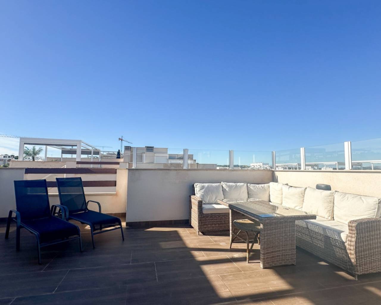 Modern Top-Floor Bungalow with Private Roof Terrace in Los Balcones, Torrevieja This stylish top-floor bungalow is located in the highly sought-after area of Los Balcones, Torrevieja, just a short distance from the sea and prestigious golf courses, offering the perfect balance between coastal living and leisure. The property features three spacious bedrooms and two modern bathrooms, designed with comfort and functionality in mind. The interior showcases a contemporary design, with clean lines, open-plan living spaces, and high-quality finishes that create a bright and welcoming atmosphere. One of the highlights of this home is the private roof terrace, ideal for enjoying the Mediterranean climate, relaxing in the sun, or entertaining guests while taking in open views of the surrounding area. The bungalow also includes a private garage space and a storage room, providing convenience and additional storage capacity. Situated in a quiet yet well-connected area, the property is close to all essential services, restaurants, shops, beaches, and golf courses, making it an excellent option as a permanent residence, holiday home, or investment opportunity on the Costa Blanca.