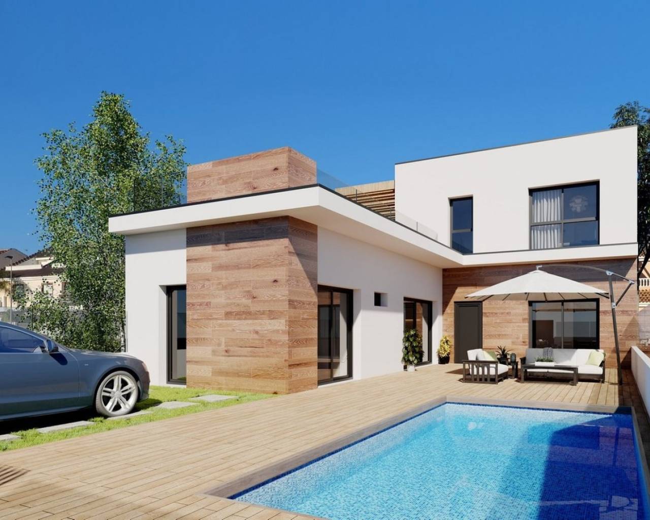 TOWNHOUSES IN SAN JAVIER luxury complex of 24 one level villas or on 2 floors with private pool, terraced area and solarium with Summer kitchen that allows you to enjoy all hours of sunshine, every day of the year. Each villa has 2 or 3 bedrooms and 2 fitted bathrooms on one level or 3 bedrooms and 3 fitted bathrooms on two levels. Designed with a contemporary style and open planned concept, comprising a fully-fitted kitchen and lounge-dining room. The development is located in San Javier (Murcia), near the beach, surrounded by services, parks, sports facilities and several Golf Courses. The property will meet the highest standards and will be equipped with: Private swimming pool with shower. Kitchen completely furnished and equipped with oven, microwave, fridge, integrated dishwasher, hob and extractor fan. Lighting: inside the property (dining room, kitchen, corridors and bathrooms) as well as in outdoor areas. Lined wardrobes with drawers. Fully fitted bathrooms with toilet, vanity unit, mirror and shower with screen panels. Pre-installation for ducted air conditioning. Solarium with Summer kitchen. Parking space on the plot. San Javier is close to all amenities with easy access to the beach, water sports, shops and the transport network. Here you can enjoy all of the facilities that San Javier has to offer such as the local shops, bars and restaurants as well as being near to shopping centres, the airport of Murcia and all of the beautiful places to be found along the Mar Menor. Corvera/Murcia airport is 30 minutes away and Alicante airport is 45 minutes away.
