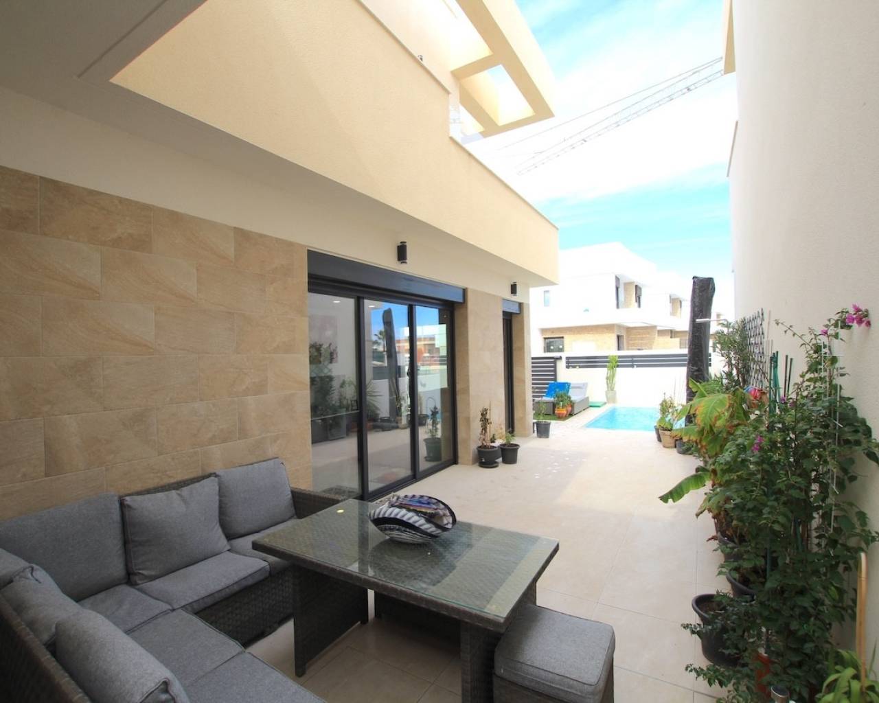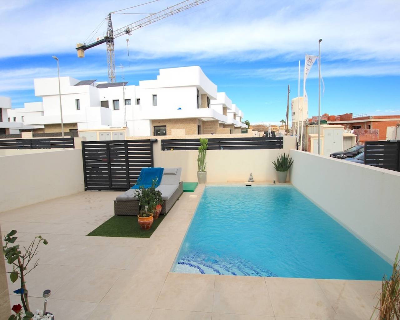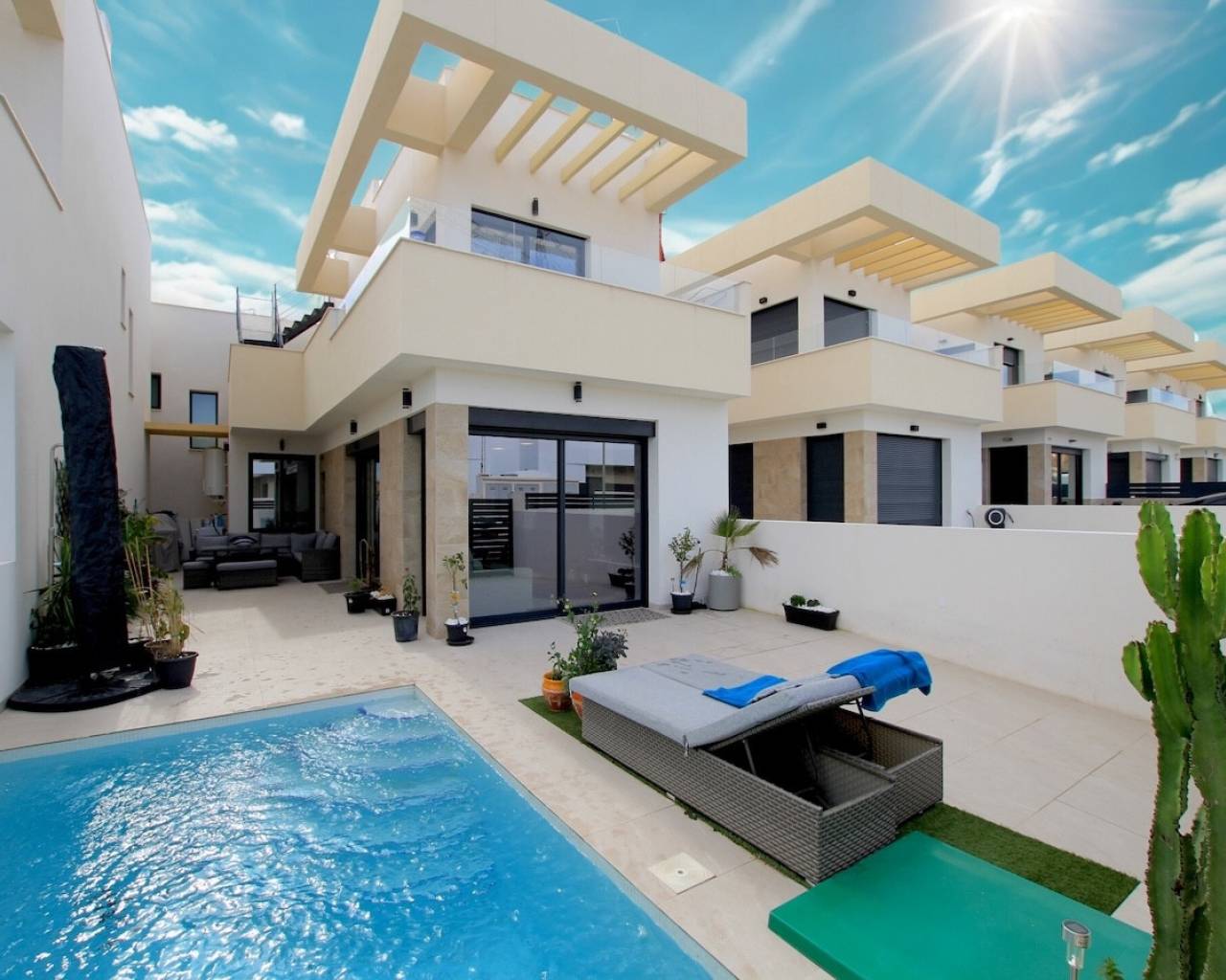 Stylish and Contemporary 3-Bedroom Villa in La Herrada, Los Montesinos Introducing a stunning modern villa for sale in the sought-after residential area of La Herrada, Los Montesinos — a charming and well-established development offering a relaxed lifestyle with convenient amenities. The development features its own commercial centre with a easteries, and a supermarket, all within easy reach. Completed early 2025, this elegant 3-bedroom villa has been used sparingly by its current owners and is presented in immaculate condition. Every detail has been carefully considered, with high-quality furnishings and tasteful décor throughout. The property sits on a private plot with off-road parking accessed via a motorised gate, a private swimming pool, and a beautifully designed outdoor dining and seating area — perfect for entertaining or simply enjoying the Mediterranean sunshine. There is ample space for both relaxation and sunbathing. Inside, the villa offers two floors of bright and spacious living accommodation. The ground floor comprises a generous lounge-diner with large sliding patio doors that open directly onto the pool area, creating a seamless indoor-outdoor flow. The designer kitchen is fully equipped with top-of-the-range appliances, abundant storage, and sleek work surfaces. This floor also includes a double bedroom with fitted wardrobes and a private en-suite shower room, along with a guest toilet and a utility room. An elegant staircase leads to the first floor, where there are two additional double bedrooms served by a large family bathroom. From this floor, access is provided to a spacious sun terrace, ideal for morning coffee or evening relaxation. External stairs lead up to a magnificent solarium, offering panoramic views across the development and towards the picturesque Salt Lakes. This sun-drenched space provides the perfect setting for sunbathing, entertaining, or simply taking in the views. The villa has been equipped to an exceptional standard, with numerous upgrades and extras chosen at the time of purchase. Key Features: Motorised window blinds Ducted air conditioning Private swimming pool Off-road parking Direct pool views Fitted wardrobes External night lighting Underfloor heating in bathrooms Spacious solarium High-quality finishes throughout This magnificent villa in La Herrada offers the perfect blend of style, comfort, and convenience — an ideal choice for both permanent living and luxury holidays on Spain's beautiful Costa Blanca. Los Montesinos has a rich history dating back to the Moorish era, with its legacy imbued in the narrow streets and traditional architecture that characterise the village. Over the centuries, it has evolved while retaining its cultural roots, reflected in its historic buildings and the annual fiestas that celebrate local traditions. The village enjoys a strategic location, making it easily accessible for travellers. It lies approximately 35 kilometres from Alicante Airport and about 50 kilometres from Murcia Airport, providing convenient options for international flights. Moreover, the stunning beaches of the Costa Blanca, such as Torrevieja and La Mata, are a mere 15 to 20-minute drive away, perfect for sun-seekers. Golf enthusiasts will also find plenty of opportunities nearby, with several top-notch courses, including Vistabella, Villamartín Golf Club and La Finca Golf, just a short drive from the village. Los Montesinos offers a range of local amenities to cater to the needs of its residents. The village features supermarkets, local markets, shops, and a good selection of bars and restaurants, serving everything from traditional Spanish fare to international cuisine. The local health centre ensures residents have access to quality healthcare services, while various educational facilities accommodate families living in the area. Community spirit thrives in Los Montesinos, with a lively calendar of events and local fiestas that bring people together. One of the highlights is the annual fiesta in August, celebrating the village's patron saint, which features processions, music, dancing, and a host of activities that showcase the local culture. Additionally, the local farmers' market offers fresh produce and artisanal products, fostering connections within the community. Whether you're contemplating a visit or considering a more permanent stay, Los Montesinos is a delightful destination worthy of exploration. Disclaimer: The information provided within the sales particulars, while regarded as correct, serves as a general reference and does not create any offer or contractual obligations. Prospective buyers should not rely on the particulars as statements of representation of fact and should verify through personal inspections and legal checks. Any furniture, electrical appliances, white goods, or air conditioning units that accompany the sale are offered as pre-owned items without warranties. Images included are for informational purposes only, and it should not be assumed that any depicted items are part of the sale with the property.