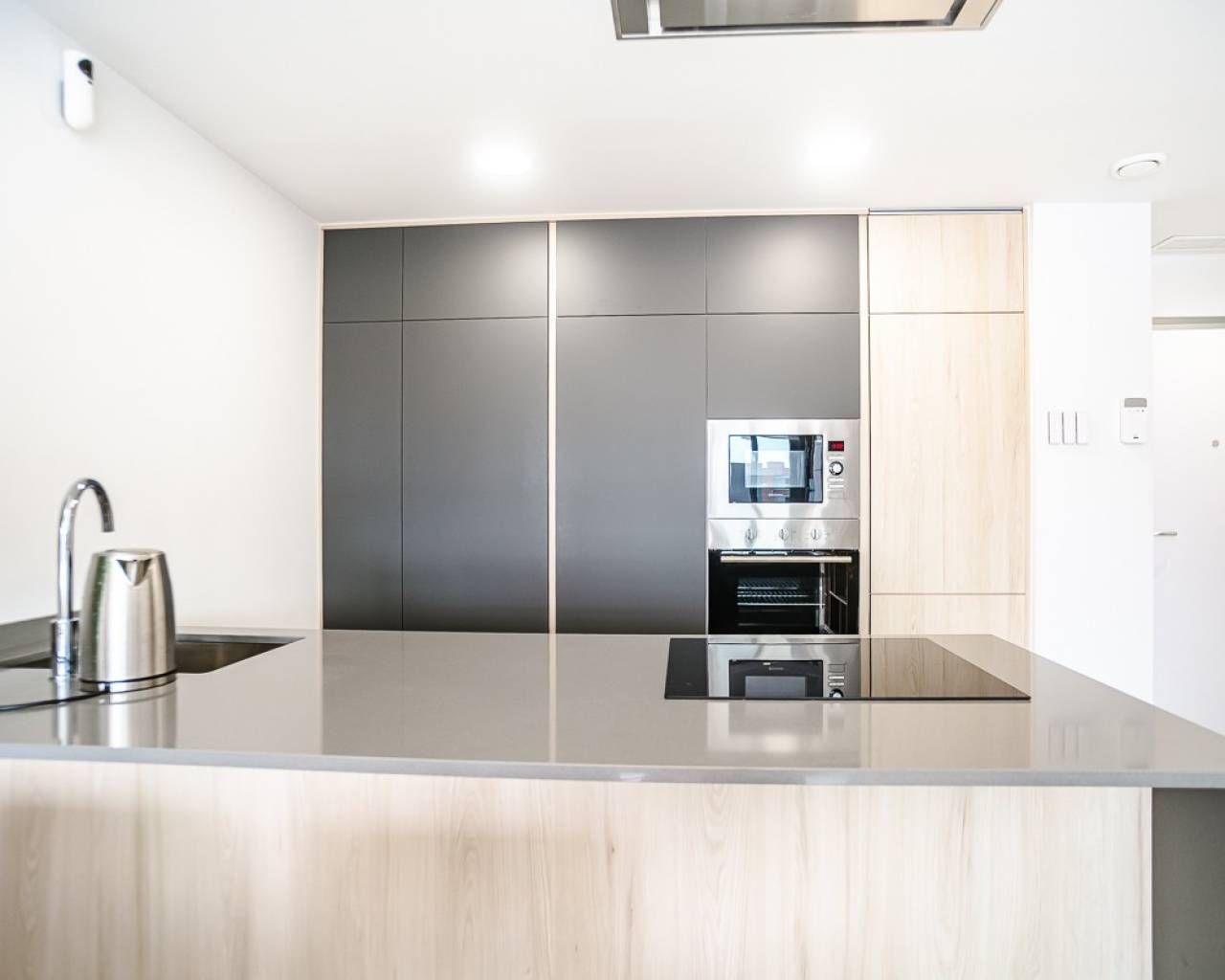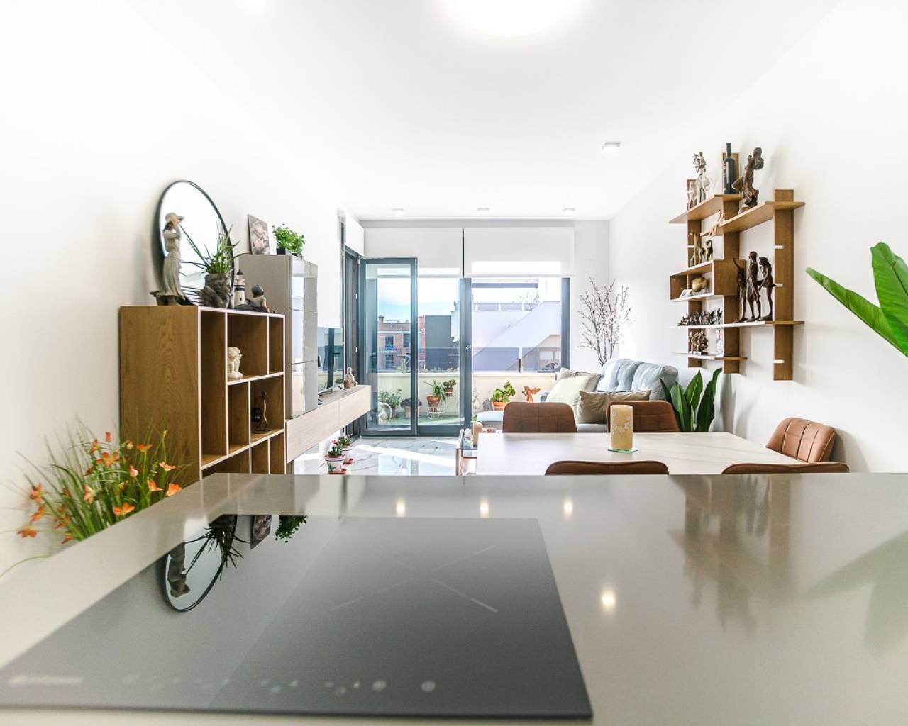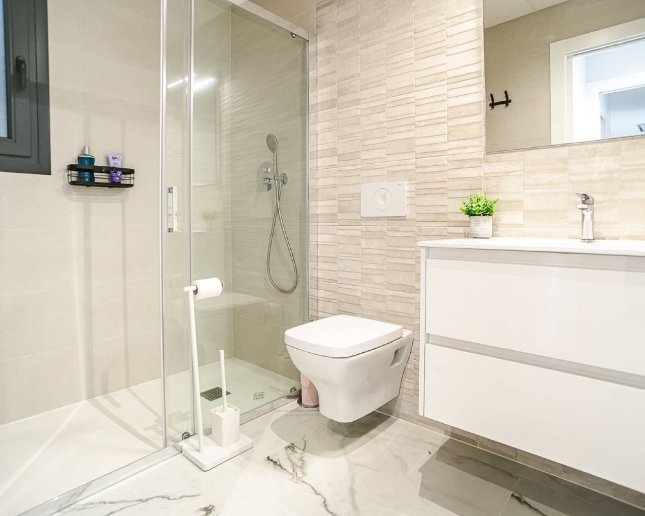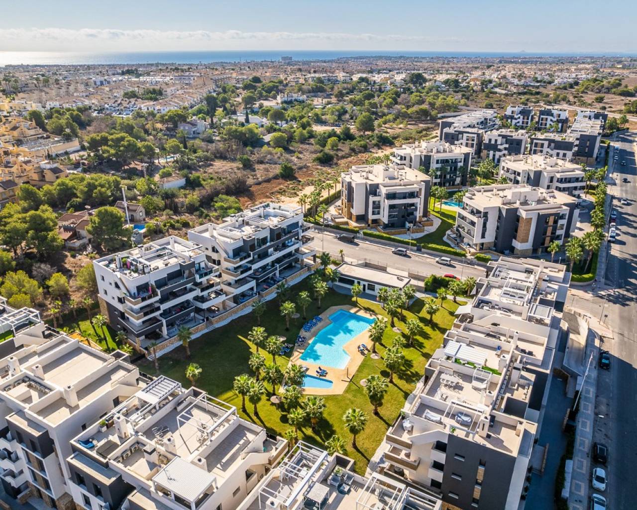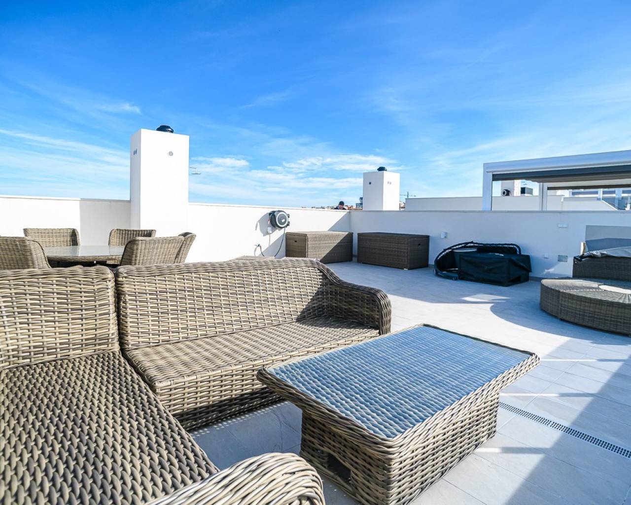 This practically new penthouse in Orihuela Costa combines modern comfort with a prime location on the Costa Blanca . The property features two bedrooms and spacious terraces, spread across several blocks within a gated community with swimming pools for adults and children and beautifully landscaped green areas. The location is exceptionally convenient: within walking distance of amenities and just 3 km from the beaches of Torrevieja and Orihuela Costa. Golf enthusiasts can reach the Villamartín courses within 7 km. The Zenia Boulevard shopping center is 9 km away. Alicante (50 km) and Murcia Corvera (55 km) airports offer easy international connections. The apartment features high-quality finishes and a fully equipped kitchen with appliances, motorized shutters, a secure entrance door, an aerothermal hot water system, and fully installed air conditioning. It includes a private parking space and storage space, and all furnishings are included.