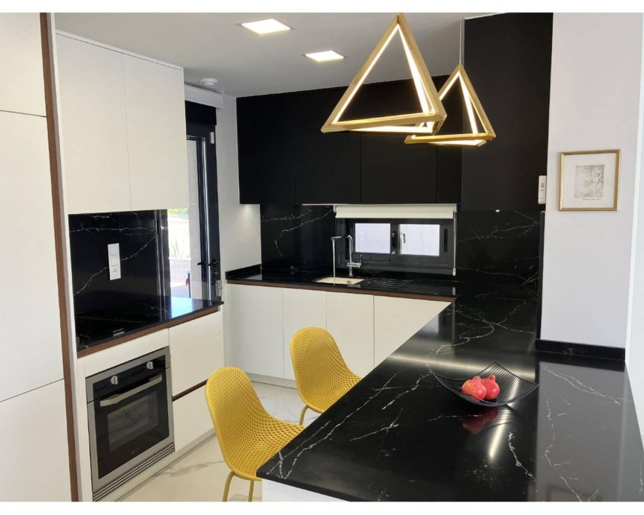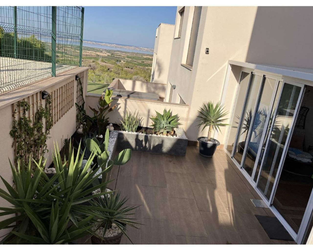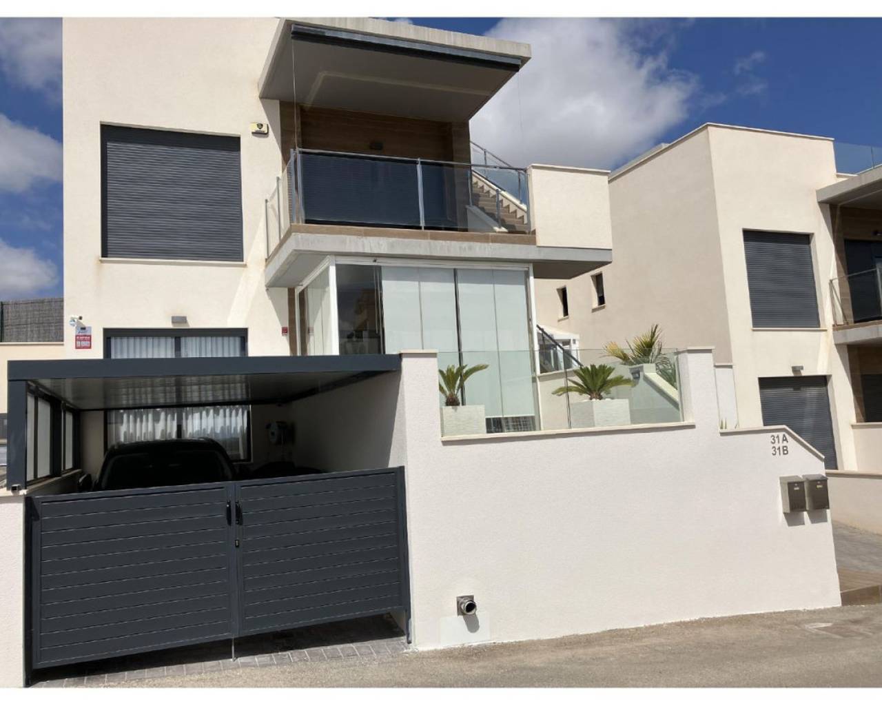 New ground-floor bungalow located in a quiet neighborhood. The property features two bedrooms and two bathrooms, with partially enclosed front and rear terraces. Additional highlights include a summer kitchen, storage room, and a covered garage. Residents also benefit from access to a community swimming pool. Conveniently situated just 2.5 km from the town center.