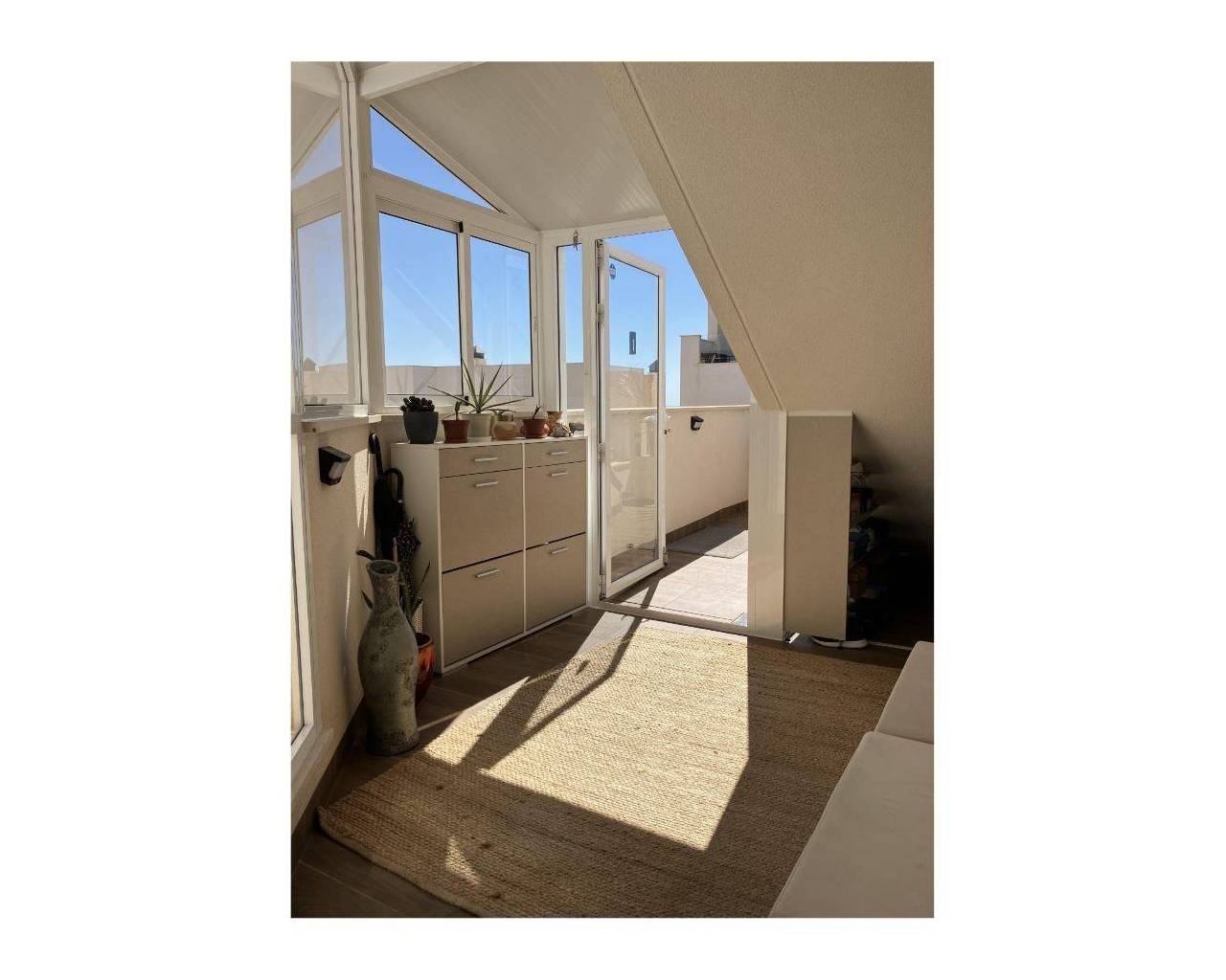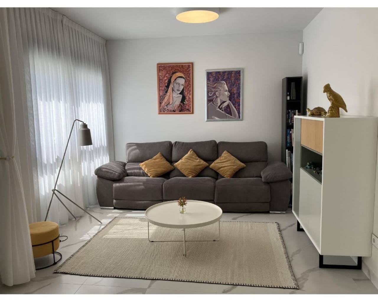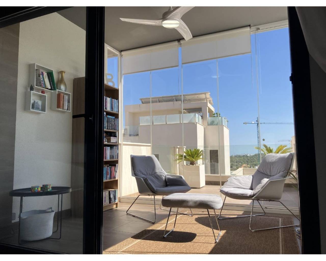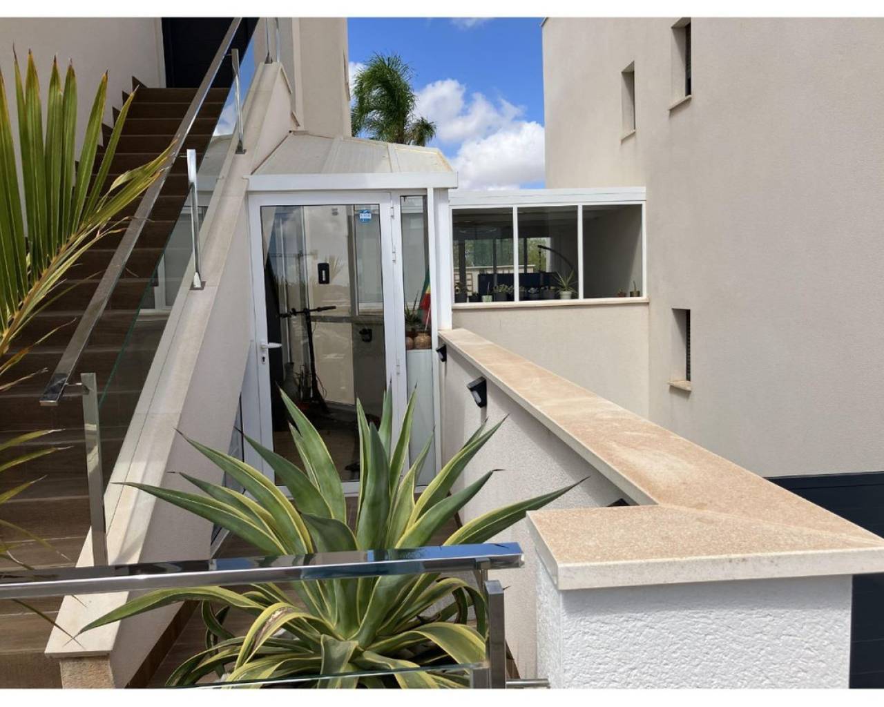 New ground-floor bungalow located in a quiet neighborhood. The property features two bedrooms and two bathrooms, with partially enclosed front and rear terraces. Additional highlights include a summer kitchen, storage room, and a covered garage. Residents also benefit from access to a community swimming pool. Conveniently situated just 2.5 km from the town center.