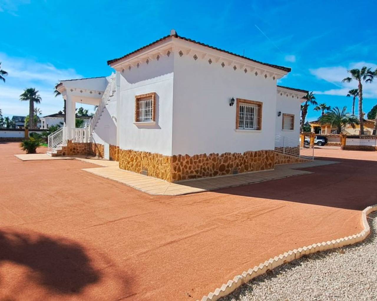 This Fantastic, Three Bedroom, Detached Country Villa in Catral is located amidst beautiful open countryside, offering peace, privacy, and stunning surroundings, yet just a 5 minute drive to the town for all amenities. The property benefits from an excellent road network along the coast, with the beaches and La Finca golf course both reachable within approximately 20 minutes, making this an ideal Costa Blanca South location. This impressive 163m² villa is all on one level and set within a beautifully landscaped and fully walled 2,329m² plot. The interior features a unique curved lounge area with air conditioning and a feature fireplace, along with two sets of opening glazed doors leading out to a covered terrace—perfect for indoor-outdoor living. The open plan fitted kitchen includes a breakfast bar and a door leading outside, while a wide archway leads into a versatile area that can be used as a dining or additional sitting space. There are three double bedrooms, all with built-in wardrobes, along with a family bathroom and two shower rooms, one of which is en suite. Externally, the property offers access to a private solarium where you can enjoy panoramic countryside views, along with the benefit of solar panels. The expansive plot is designed for easy maintenance, featuring paved areas, sections of artificial grass, and mature palm trees. A large 10 x 5 private swimming pool provides the perfect space to relax and entertain, while there is ample off-road parking and a garage for two cars with additional storage. The villa benefits from mains water and electricity, a water reserve system, and four solar panels, enhancing efficiency and sustainability. This exceptional country property combines space, comfort, and tranquillity, making it a perfect permanent residence or luxurious retreat in the heart of the Costa Blanca South.