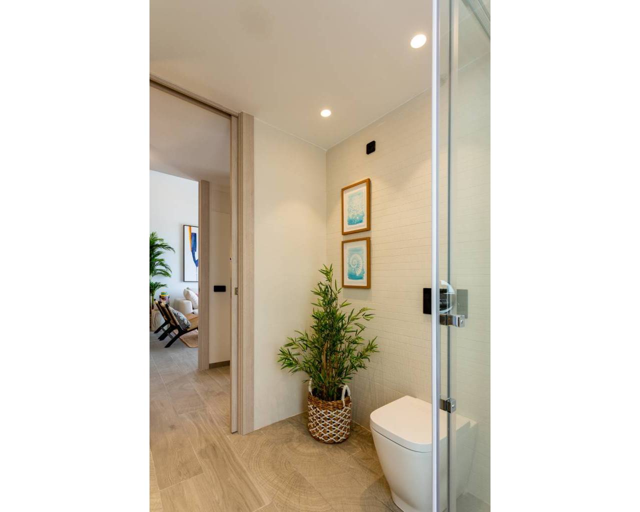 These modern 3 bedroom semi-detached houses are distributed on a single floor with 2 bathrooms, kitchen with breakfast bar and living room with access to the outdoor area with pool, parking and private garden. They also have a communal area equipped with swimming pool, garden and hammock area.