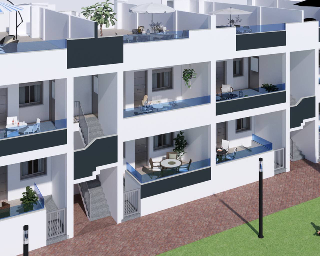 The residential is located in a prime area, currently under expansion, close to the beaches of Torrevieja, Punta Prima, and Playa Flamenca. It is also very close to the Laguna Rosa of Torrevieja, which is part of the Natural Park of Las Lagunas de La Mata and Torrevieja. This area is ideal for walking and enjoying its beautiful and unique landscape. The residential is surrounded by all the necessary services, leisure areas, and amenities. Supermarkets are just a few minutes away, La Zenia Shopping Center is 8 minutes away, and Torrevieja Hospital is 7 minutes away. Villamartin Golf Course is only 7 minutes from the residential, and there are numerous restaurants and cafés nearby. In addition, the residential is very close to the Mediterranean Highway, allowing easy access to Alicante's Altet Airport in just 40 minutes and Murcia International Airport in approximately 42 minutes. The residential will be a private, gated community, with different areas for the enjoyment of its owners. Access will be through two pedestrian gates and a vehicle gate with automatic opening via remote control. The residential will have a swimming pool with separate areas for adults and children, a garden area around the pool with a pergola, toilets next to the pool, an open and covered social area and an enclosed gym and social area with toilets and showers. The project will have 50 apartments, distributed across four blocks. Apartments in Blocks 1 and 2 have already been sold and handed over. Block 3 consisting of a total of 14 apartments: 7 on the ground-floor and semi-basement apartments with two bedrooms, three bathrooms, and two terraces (Type G), as well as seven upper-floor apartments with two bedrooms, two bathrooms, and a solarium (Type H). Block 4 consists of a total of 12 apartments: six on the ground floor with two or three bedrooms (Type J), and six on the upper floor with solarium—five with two bedrooms and one with three bedrooms (Type K).