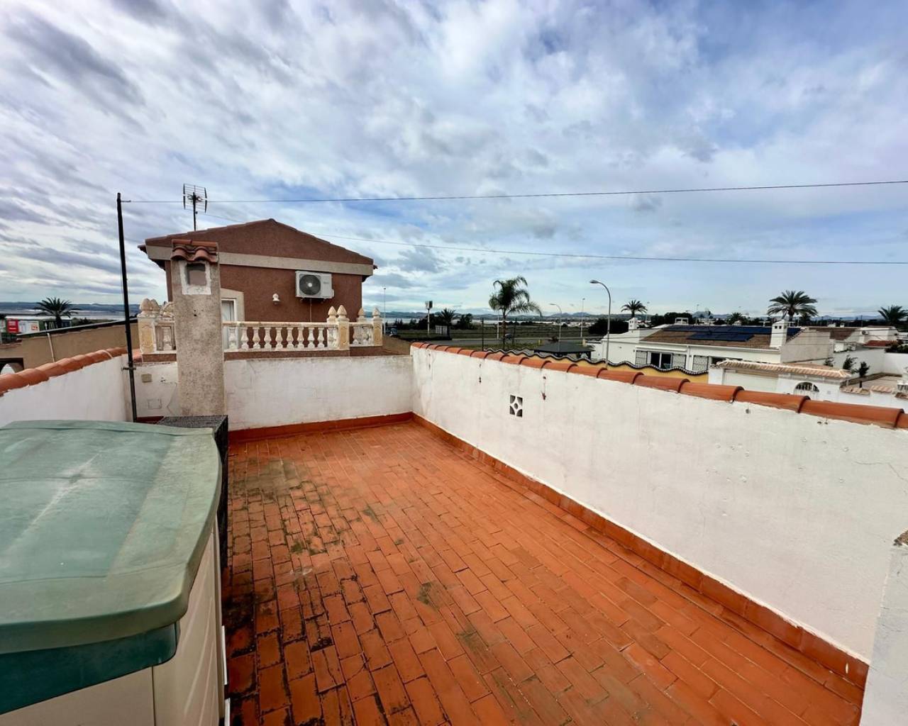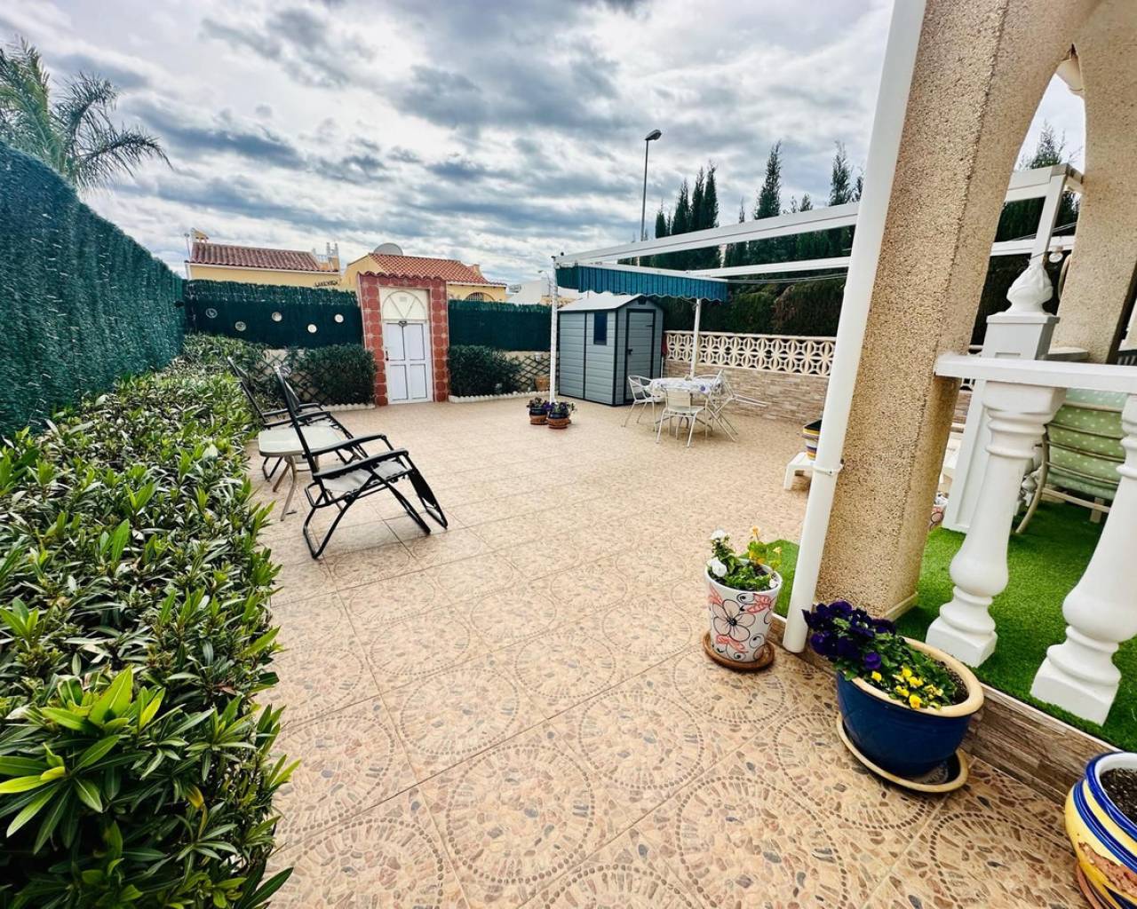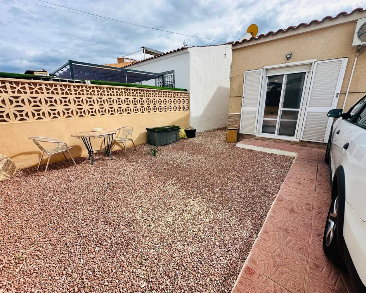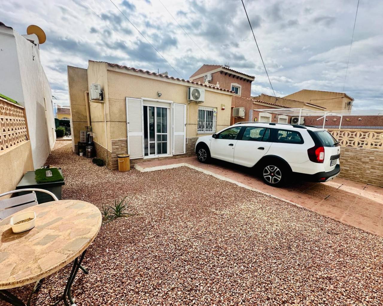 Charming and well presented one level Villa situated in a quiet location on the sought after urbanisation of La Siesta. This low maintenance South Facing Villa has been internally renovated to a modern and high standard and is beautifully presented. Sitting on a very spacious plot this home uniquely offers both front and rear access from quiet residential streets with Pedestrian access to the front and driveway access from the rear. The driveway currently provides parking for one large vehicle but there is scope to accommodate a second vehicle. Either the front or rear provide ample space to put in a private pool. The front tiled garden offers high walls and privacy with passageway access to the rear and a garden gate for separation. External stairs lead to the solarium with views toward the Pink Lake. A spacious covered terrace provides an ideal area for relaxing or el fresco dining. The Villa offers a large, bright Living / Dining room with a lovely feel good factor. Corner fireplace with real flame electric fire and working chimney for optional real fire. Well appointment kitchen with separated area for washing up and large fridge/freezer. Door access to the hallway offering a modern walk in shower with unit and wash basin and separate toilet with small hand wash basin. Large spacious master bedroom with fitted wardrobes and patio door access to the rear garden. Twin bedroom with fitted wardrobes large enough for the alternative of a double bed. Ideally situated within walking distance to a large choice of bars and restaurants and The Oasis with pool access. Walking distance to large supermarket and bus stops with regular running service. Habaneras Shopping Centre and beaches within a short drive. Hot and cold air conditioning throughout. Sold furnished.