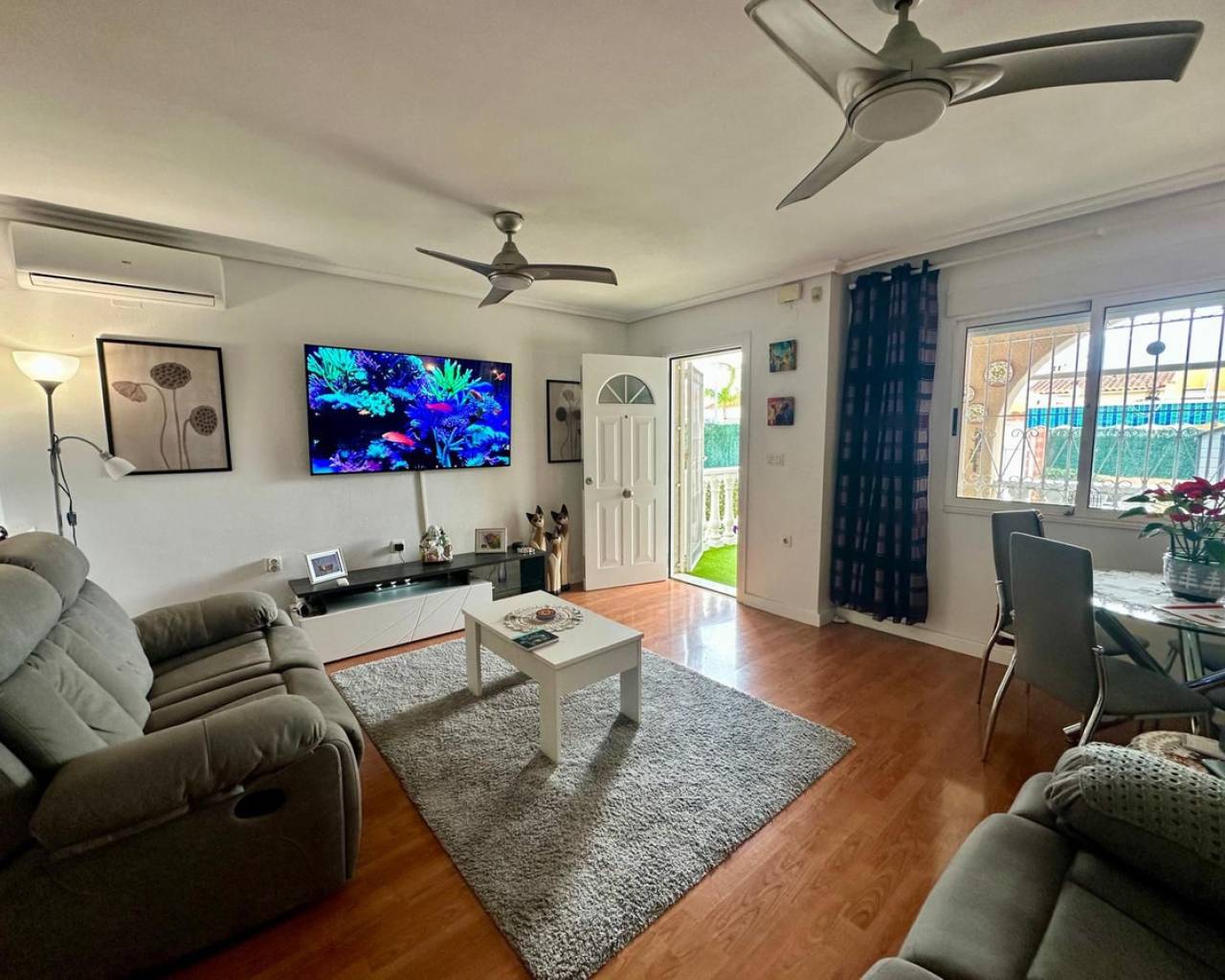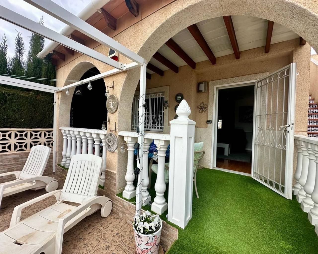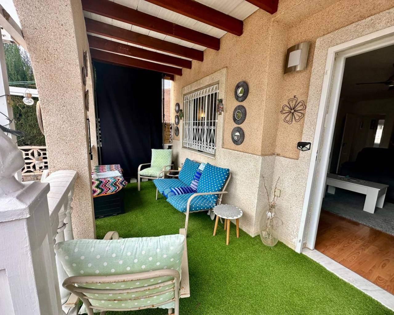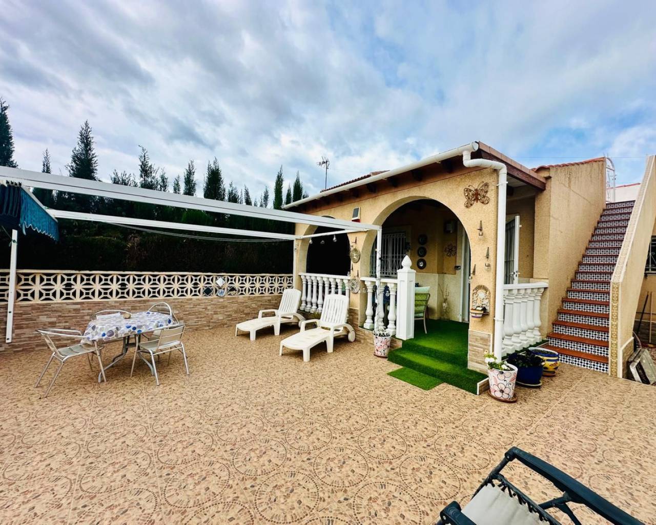 Charming and well presented one level Villa situated in a quiet location on the sought after urbanisation of La Siesta. This low maintenance South Facing Villa has been internally renovated to a modern and high standard and is beautifully presented. Sitting on a very spacious plot this home uniquely offers both front and rear access from quiet residential streets with Pedestrian access to the front and driveway access from the rear. The driveway currently provides parking for one large vehicle but there is scope to accommodate a second vehicle. Either the front or rear provide ample space to put in a private pool. The front tiled garden offers high walls and privacy with passageway access to the rear and a garden gate for separation. External stairs lead to the solarium with views toward the Pink Lake. A spacious covered terrace provides an ideal area for relaxing or el fresco dining. The Villa offers a large, bright Living / Dining room with a lovely feel good factor. Corner fireplace with real flame electric fire and working chimney for optional real fire. Well appointment kitchen with separated area for washing up and large fridge/freezer. Door access to the hallway offering a modern walk in shower with unit and wash basin and separate toilet with small hand wash basin. Large spacious master bedroom with fitted wardrobes and patio door access to the rear garden. Twin bedroom with fitted wardrobes large enough for the alternative of a double bed. Ideally situated within walking distance to a large choice of bars and restaurants and The Oasis with pool access. Walking distance to large supermarket and bus stops with regular running service. Habaneras Shopping Centre and beaches within a short drive. Hot and cold air conditioning throughout. Sold furnished.