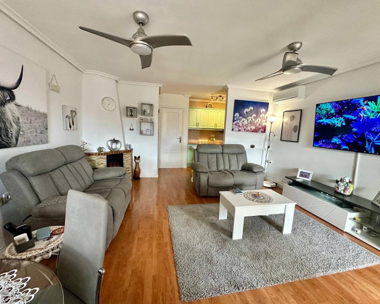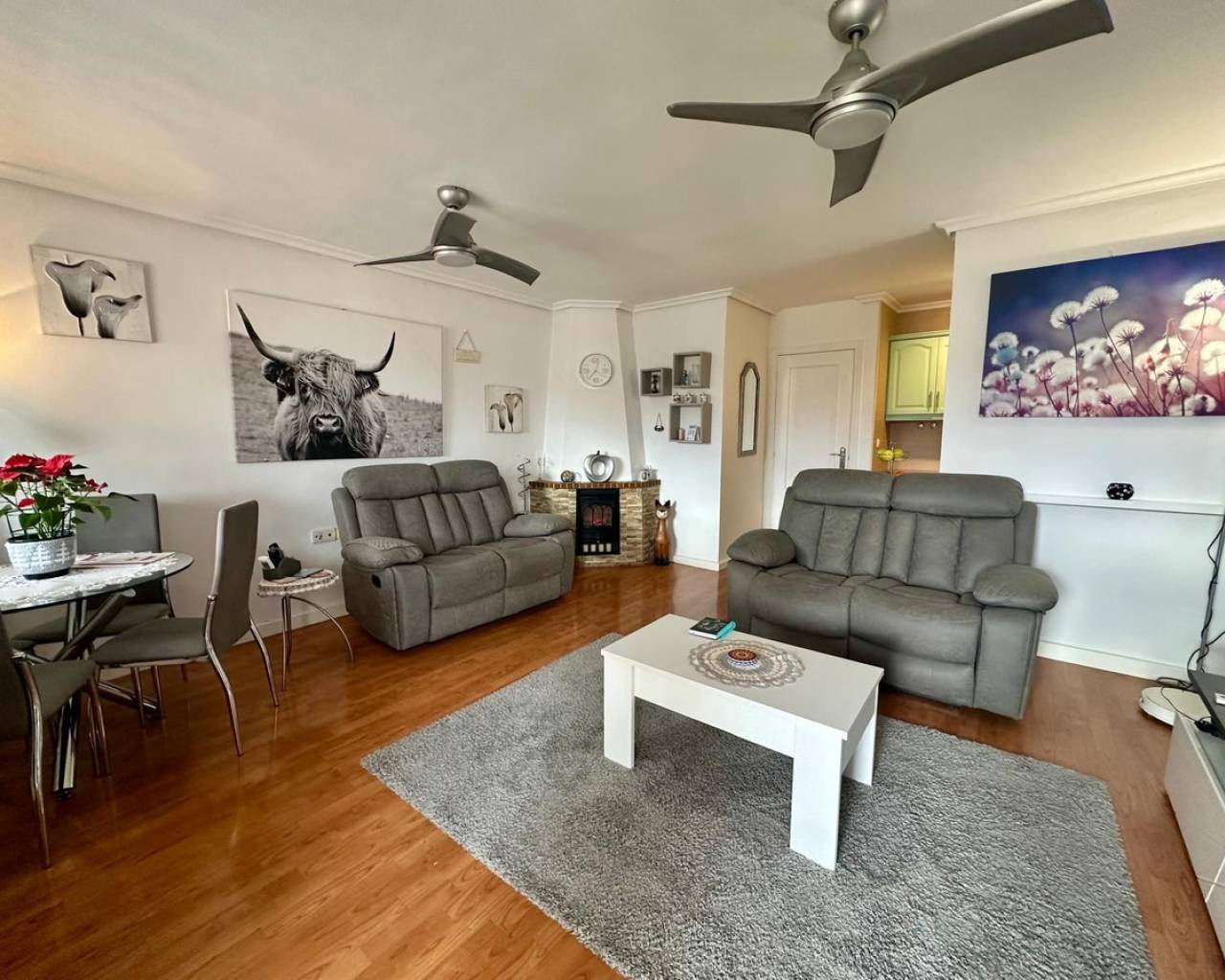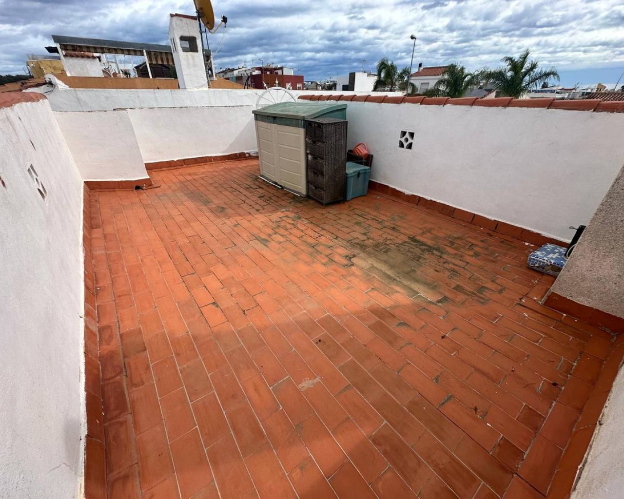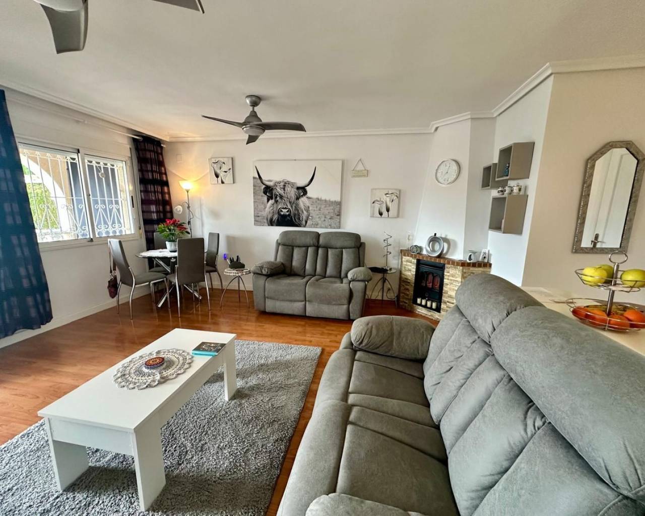 Charming and well presented one level Villa situated in a quiet location on the sought after urbanisation of La Siesta. This low maintenance South Facing Villa has been internally renovated to a modern and high standard and is beautifully presented. Sitting on a very spacious plot this home uniquely offers both front and rear access from quiet residential streets with Pedestrian access to the front and driveway access from the rear. The driveway currently provides parking for one large vehicle but there is scope to accommodate a second vehicle. Either the front or rear provide ample space to put in a private pool. The front tiled garden offers high walls and privacy with passageway access to the rear and a garden gate for separation. External stairs lead to the solarium with views toward the Pink Lake. A spacious covered terrace provides an ideal area for relaxing or el fresco dining. The Villa offers a large, bright Living / Dining room with a lovely feel good factor. Corner fireplace with real flame electric fire and working chimney for optional real fire. Well appointment kitchen with separated area for washing up and large fridge/freezer. Door access to the hallway offering a modern walk in shower with unit and wash basin and separate toilet with small hand wash basin. Large spacious master bedroom with fitted wardrobes and patio door access to the rear garden. Twin bedroom with fitted wardrobes large enough for the alternative of a double bed. Ideally situated within walking distance to a large choice of bars and restaurants and The Oasis with pool access. Walking distance to large supermarket and bus stops with regular running service. Habaneras Shopping Centre and beaches within a short drive. Hot and cold air conditioning throughout. Sold furnished.
