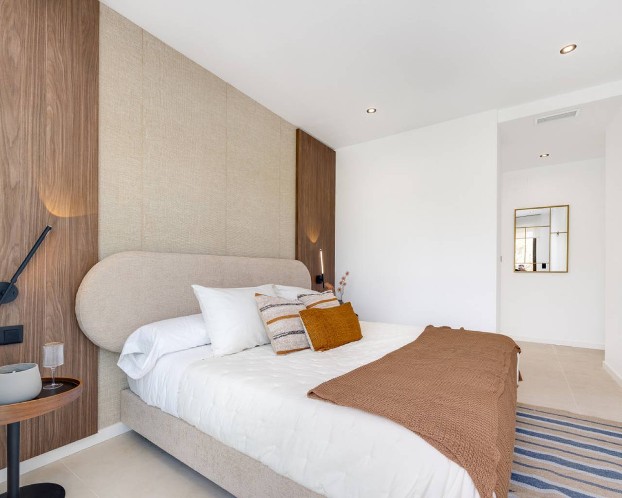 This modern development features a reinforced concrete structure with a flat roof insulated with 6 cm extruded polystyrene. The facade consists of a double-leaf ceramic brick system, also insulated with 6 cm extruded polystyrene for enhanced energy efficiency. Exterior aluminum carpentry in color 7016 (or similar) includes thermal break and Climalit double-glazed windows, while terraces are adorned with sleek glass railings. Inside, white-lacquered wood carpentry complements built-in wardrobes with internal lining and drawers in every room. The development is equipped with pre-installed ducted air conditioning, electric blinds, and an 8 kWp photovoltaic system with a 6 kWp inverter. A private underground garage and a private swimming pool add exclusivity. The kitchen boasts high and low lacquered cabinets with grey interiors and matte white doors, a Neolith (or similar) countertop (color TBD), an undermount sink with a single-lever faucet, and an aerothermal system with a 150-liter hot water tank. Bathrooms feature resin shower trays, glass screens, black built-in shower fittings, suspended porcelain washbasins with cabinets, mirrors, and black single-lever faucets. Flooring throughout the home is porcelain stoneware, with porcelain wall tiles in the bathrooms, both in colors yet to be defined.