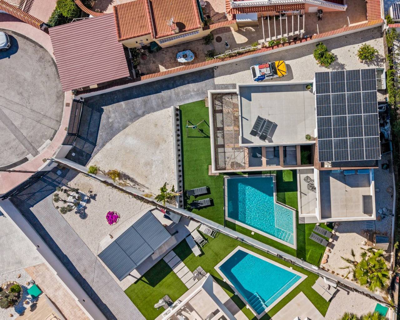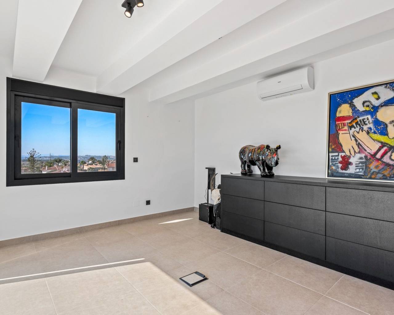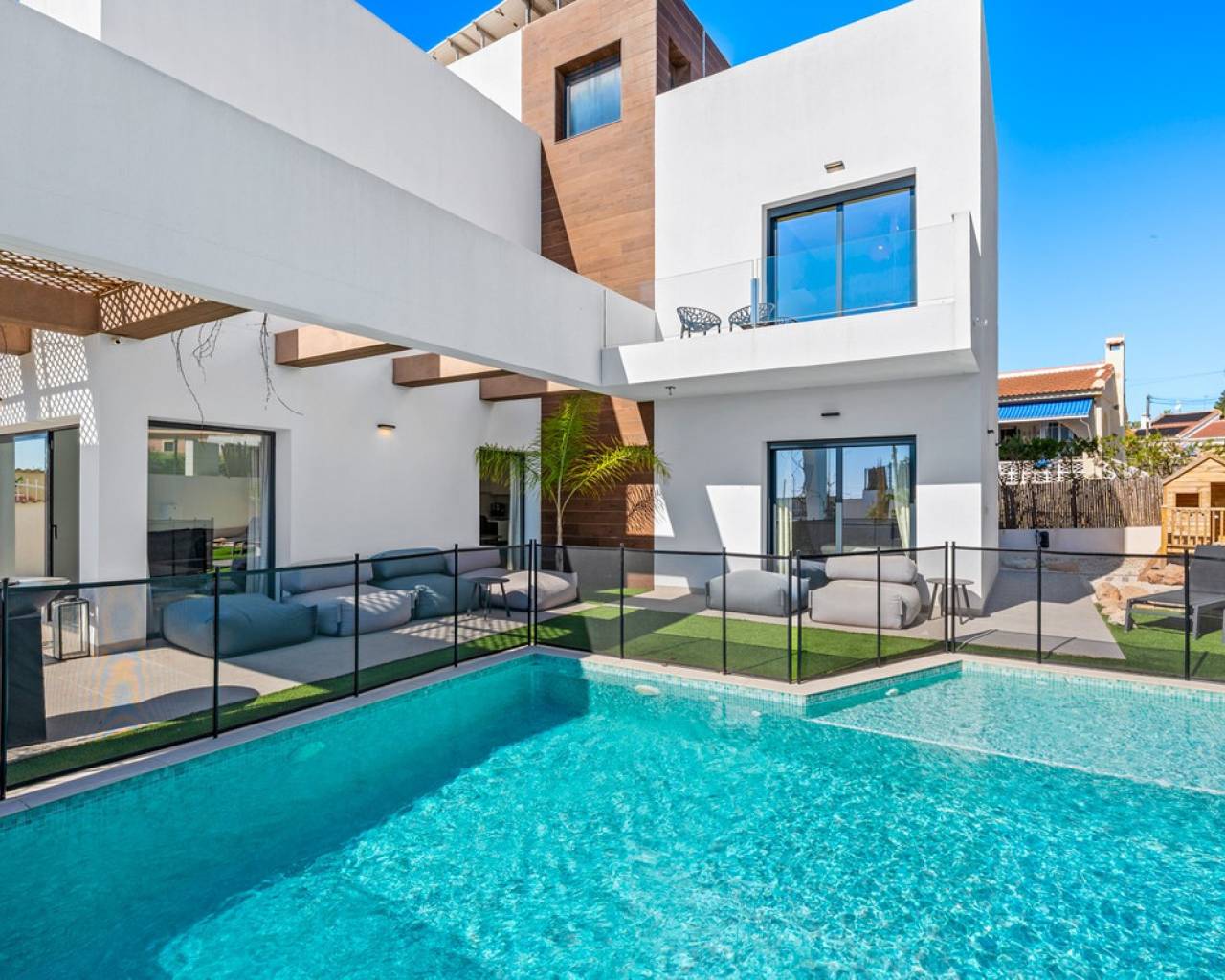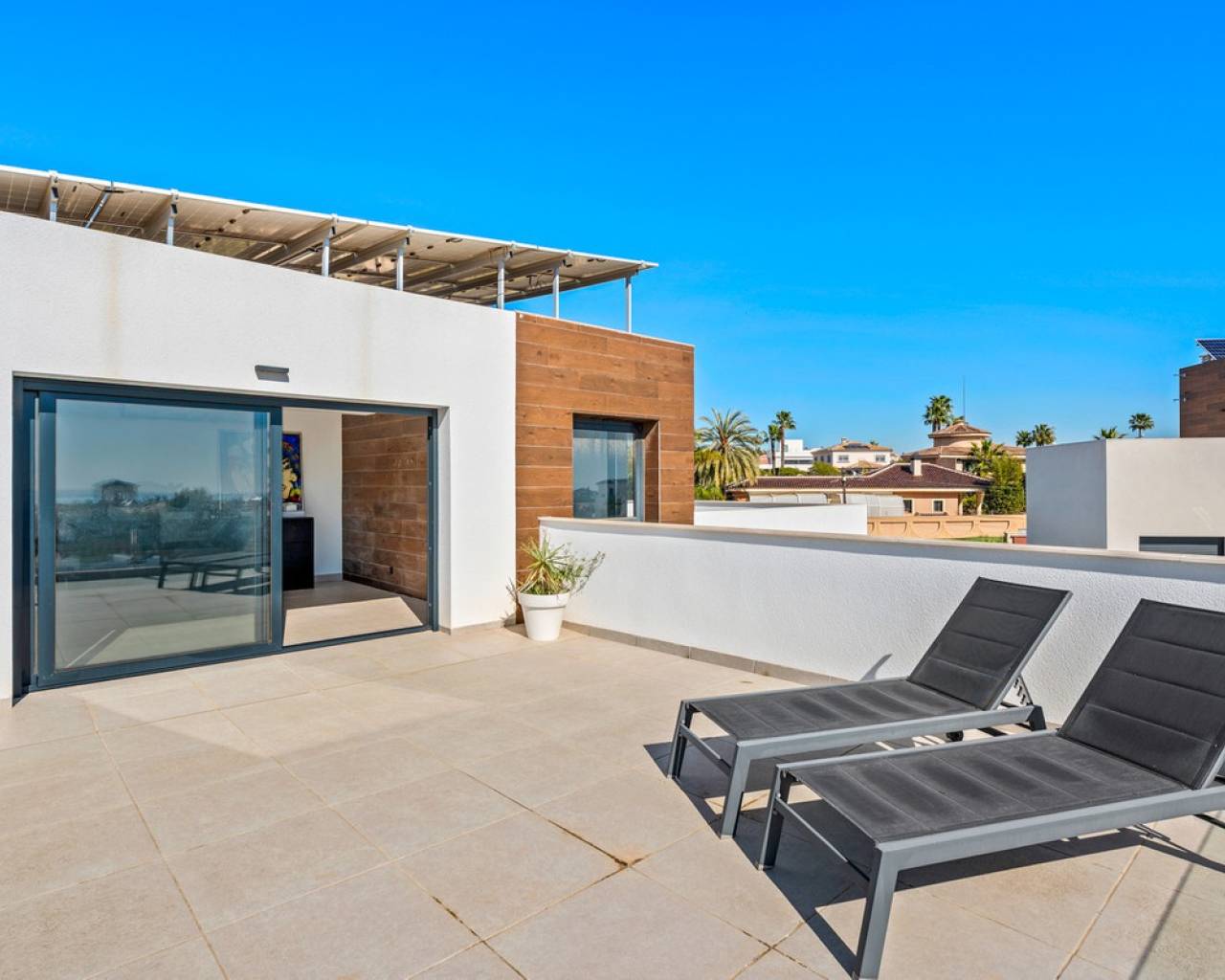 This modern, south-facing villa for sale in Ciudad Quesada on the Costa Blanca was built in 2020 and is in excellent condition. The property combines contemporary architecture with comfort and functionality, making it perfect as a permanent residence, a luxury holiday home, or an attractive rental investment. Thanks to its central yet peaceful location, within easy reach of all amenities, you'll enjoy an ideal balance between privacy and accessibility. The villa stands on a private plot of 533 m² and offers 153 m² of living space spread over three levels. Upon entering, you'll immediately notice the bright and open living space, where the living room, dining area, and modern open-plan kitchen seamlessly flow together. Large windows provide abundant natural light and create a direct connection to the garden and private saltwater pool. The kitchen is equipped with high-quality built-in appliances and connects to a practical separate laundry room. This floor also features a stylish guest bedroom and a fully equipped bathroom, offering additional comfort for visitors or ground-floor living. The first floor features two spacious bedrooms, both with en-suite bathrooms. One bedroom boasts a walk-in closet, while the other has direct access to a private balcony overlooking the garden and pool. The top floor offers a versatile additional space that would be perfect as an office, studio, or fourth bedroom. From here, you can access two generous terraces with panoramic views of Ciudad Quesada, the surrounding countryside, the salt lakes, and even a partial view of the Mediterranean Sea. The outdoor area is designed to optimally enjoy the Mediterranean climate and requires little maintenance. The L-shaped saltwater pool is the focal point of the garden and is surrounded by several terraces where you can relax or dine al fresco. The fully enclosed plot also includes a private driveway with secure parking. Additional comfort is provided by hot and cold air conditioning, underfloor heating in the bathrooms, solar panels, double glazing, and a favorable energy label B, which contributes to energy-efficient living. The villa is situated in a quiet cul-de-sac just minutes from the center of Ciudad Quesada, where you'll find a wide range of restaurants, cafes, shops, and supermarkets. This popular residential area is known for its international atmosphere and excellent amenities, including golf courses, hiking trails, and recreational opportunities for the whole family. The beaches of Guardamar del Segura are about a ten-minute drive away, while La Marquesa Golf is a short distance away for golf enthusiasts. Alicante Airport is also easily accessible, making this location particularly attractive for both permanent residence and holiday use. This move-in ready modern villa in Ciudad Quesada offers a combination of luxury, space, privacy and a prime location on the Costa Blanca, making it a unique opportunity for those seeking comfortable living under the Spanish sun.