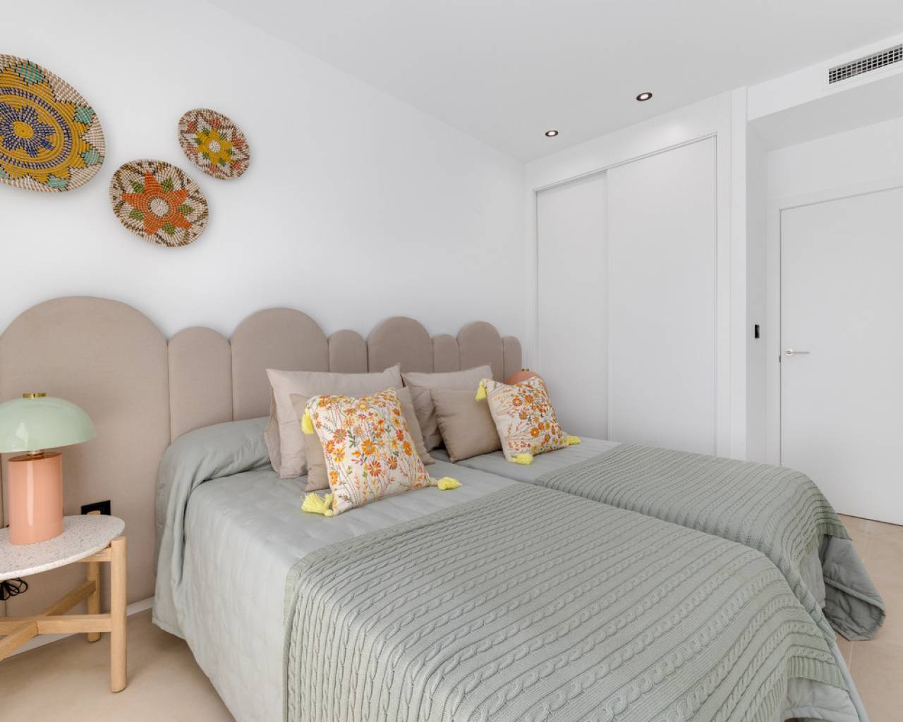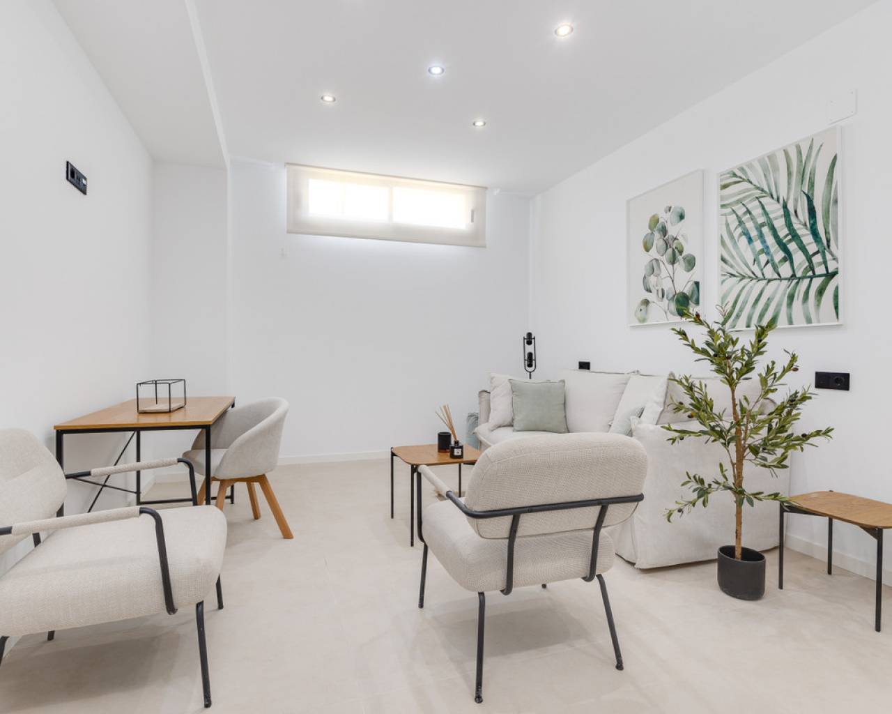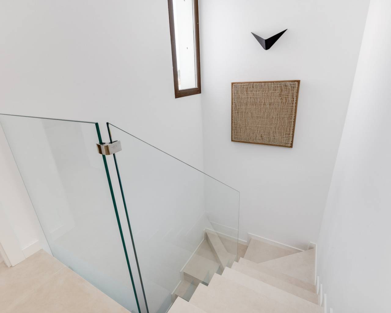 This modern development features a reinforced concrete structure with a flat roof insulated with 6 cm extruded polystyrene. The facade consists of a double-leaf ceramic brick system, also insulated with 6 cm extruded polystyrene for enhanced energy efficiency. Exterior aluminum carpentry in color 7016 (or similar) includes thermal break and Climalit double-glazed windows, while terraces are adorned with sleek glass railings. Inside, white-lacquered wood carpentry complements built-in wardrobes with internal lining and drawers in every room. The development is equipped with pre-installed ducted air conditioning, electric blinds, and an 8 kWp photovoltaic system with a 6 kWp inverter. A private underground garage and a private swimming pool add exclusivity. The kitchen boasts high and low lacquered cabinets with grey interiors and matte white doors, a Neolith (or similar) countertop (color TBD), an undermount sink with a single-lever faucet, and an aerothermal system with a 150-liter hot water tank. Bathrooms feature resin shower trays, glass screens, black built-in shower fittings, suspended porcelain washbasins with cabinets, mirrors, and black single-lever faucets. Flooring throughout the home is porcelain stoneware, with porcelain wall tiles in the bathrooms, both in colors yet to be defined.