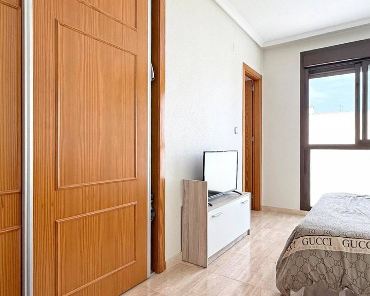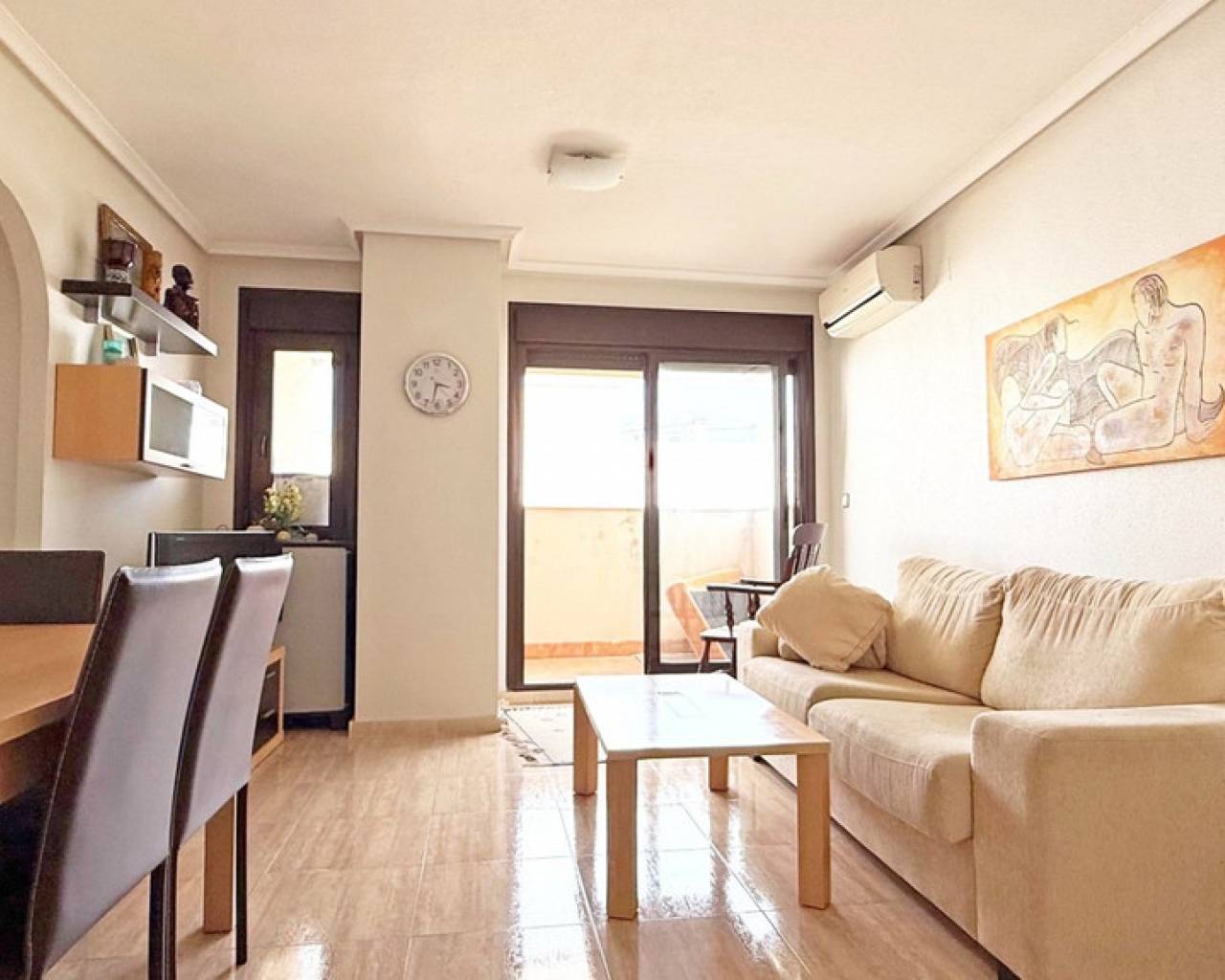 Welcome to this bright and spacious 4th floor apartment located in the heart of Torrevieja, just a short stroll from the promenade, shops, and all local amenities. This east-facing apartment offers 3 bedrooms, 2 bathrooms, and a generous balcony with views of the communal pool – the perfect place to enjoy your morning coffee in the sun. The open-plan living and dining area is equipped with air conditioning and comes fully furnished, ready for immediate use. Located in a well-maintained building with lift access and a large communal pool, this apartment is ideal as a holiday home, permanent residence, or rental investment in one of Costa Blanca's most vibrant coastal towns.