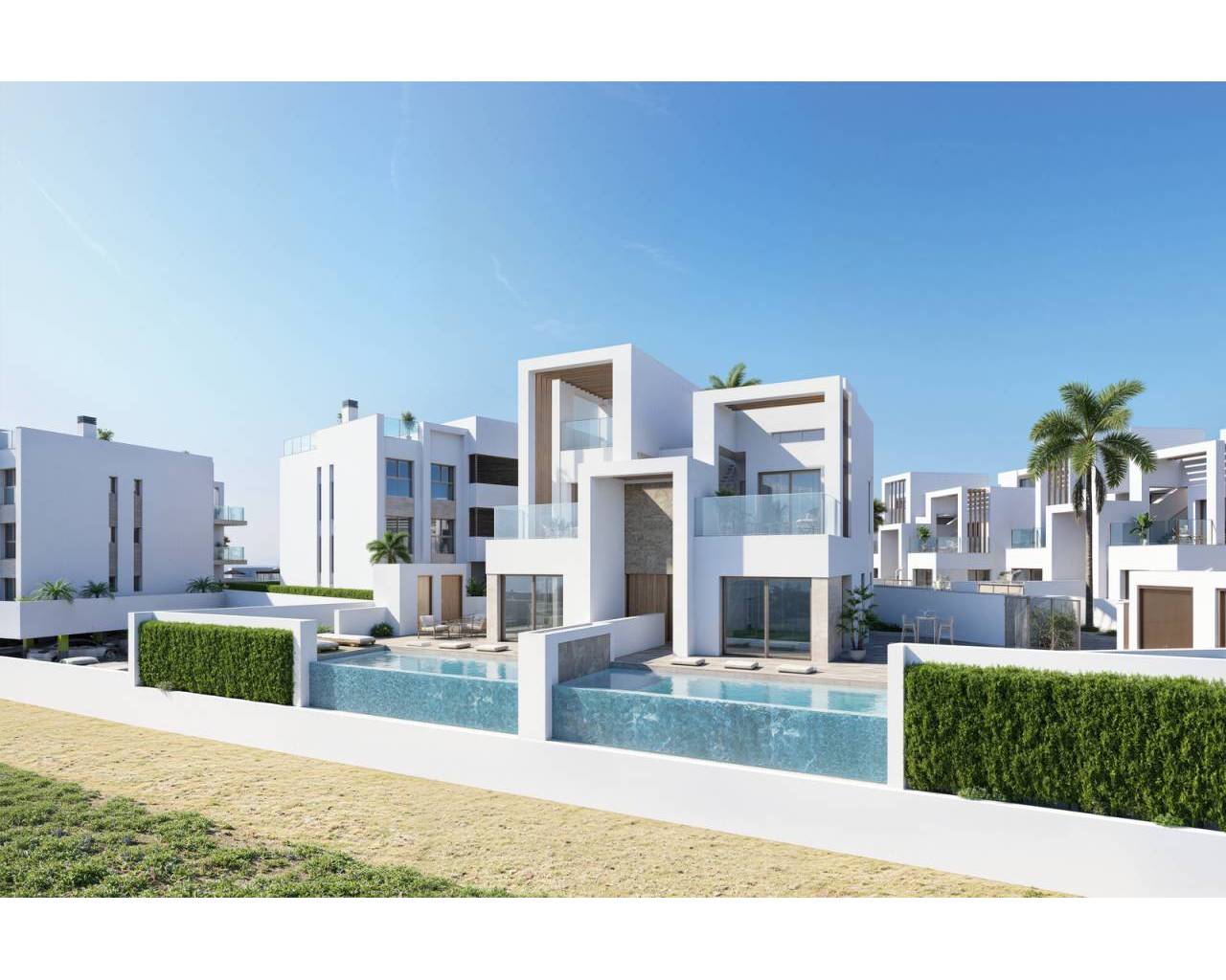 This exclusive residential complex features 66 homes with 2 or 3 bedrooms and 2 bathrooms, designed in a minimalist style with high-quality finishes. Its modern architecture integrates open spaces, nature, and swimming pools, creating a tranquil and elegant environment with unparalleled views.