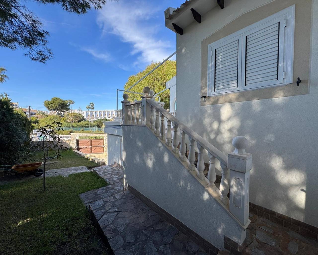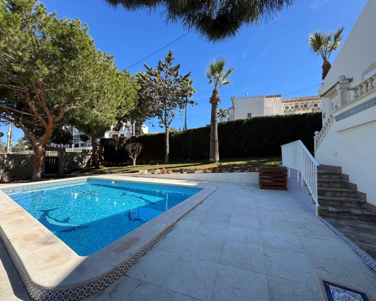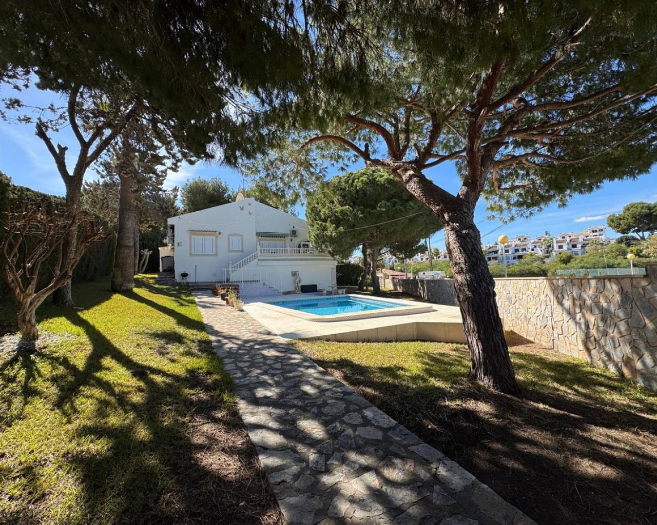 For sale Villa. Location Cabo Roig (ALICANTE). Total area 172.00 m2. Number of rooms – 3. Number of bedrooms 3. Number of bathrooms 2. Year of construction 1986. Distance to the sea 800 m. Plot area 890 m2. Orientation South-East. Features: - Private pool - Air conditioning - Barbecue area