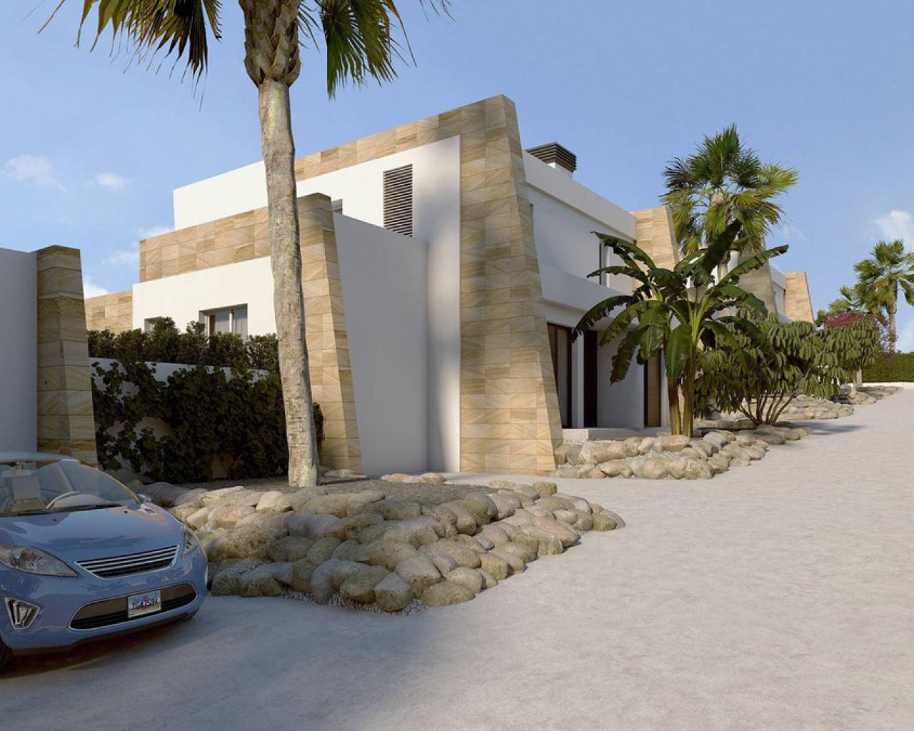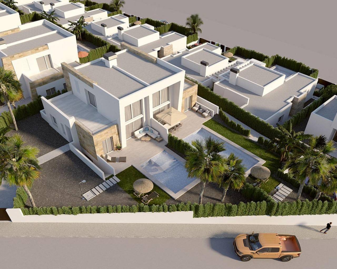 For sale Villa. Location Algorfa (ALICANTE). Total area 108.00 m2. Number of rooms – 3. Number of bedrooms 3. Number of bathrooms 2. Year of construction 2025. Distance to the sea 15.00 km. Plot area 260 m2. Features: - Private pool - Air conditioning - Barbecue area