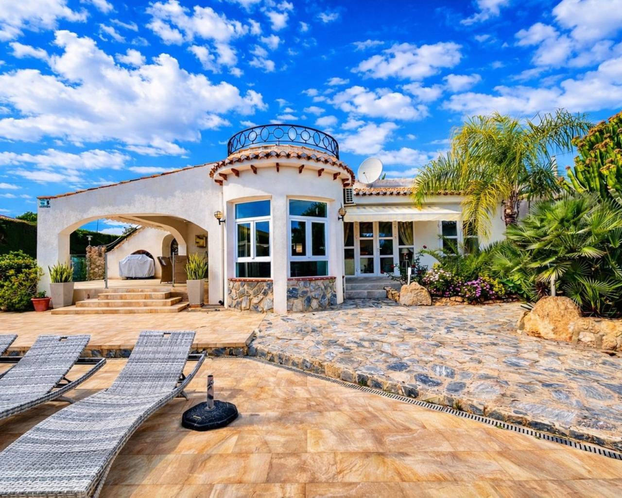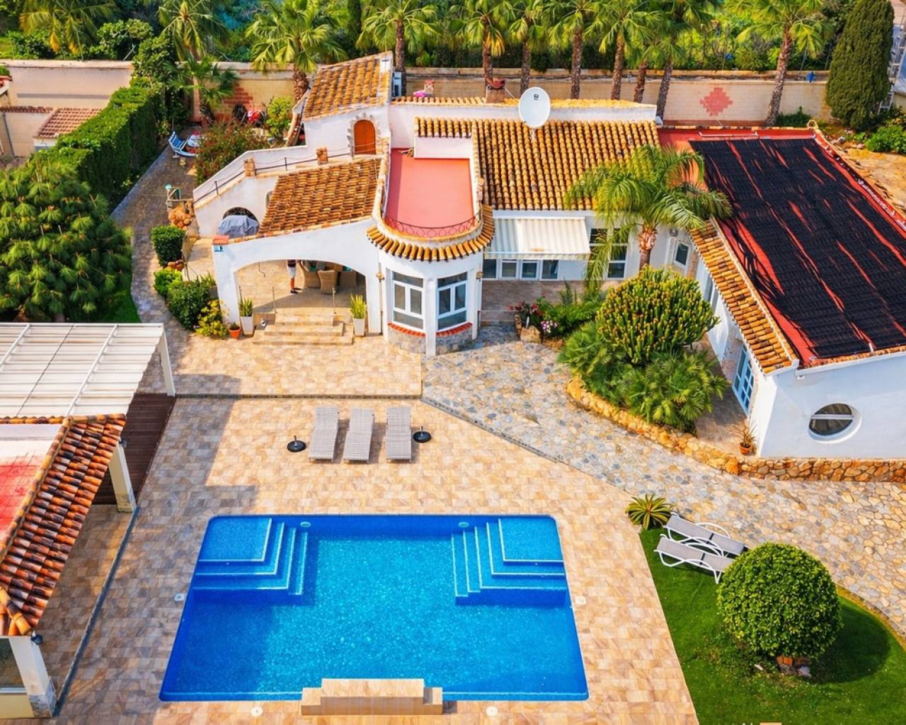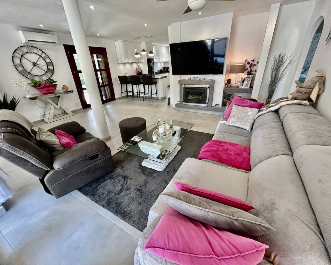 Introducing this exceptional fully renovated 6-bedroom, 4-bathroom detached villa, perfectly combining modern luxury with charming original character. Set on a generous 1,300 m² private plot with a constructed area of 344 m², this impressive single-level home is located in the peaceful and highly desirable area of Lomas de Cabo Roig, offering privacy while remaining within walking distance of restaurants, bars, cafés, and a supermarket. The beautiful beaches of Campoamor and Cabo Roig, as well as two renowned golf courses, are also just a short drive away. A spacious covered terrace welcomes you into the heart of the home, where an expansive open-plan living, dining, and kitchen area creates a bright and inviting space filled with natural light. The renovated kitchen is finished to a high standard and fully equipped with premium appliances including an American-style fridge freezer and double oven, making it ideal for both everyday living and entertaining. The property offers six versatile bedrooms, designed to adapt to a variety of needs. One en-suite bedroom is accessed directly from the main living area and is currently used as a stylish sports lounge. Along the main hallway you will find three additional bedrooms with fitted wardrobes and French doors, one of which is presently used as a home office. The final two spacious bedrooms overlook the pool and gardens and share a luxurious bathroom featuring a walk-in shower and freestanding bathtub, creating a relaxing retreat within the home. Outside, the villa truly shines as an entertainer's paradise. The beautifully landscaped rear garden features a large private swimming pool and a stunning stone-built gazebo complete with a bar area, glass windows, TV, and a generous awning for shaded relaxation. The mature gardens are designed to be attractive yet low maintenance, while the entire property is enclosed by a solid perimeter wall, ensuring excellent privacy and security. This impressive property also offers excellent flexibility, with the possibility to easily create a separate two-bedroom guest apartment with its own lounge and kitchen/utility area, thanks to convenient external access—ideal for guests, extended family, or rental potential. Additional features include independent air-conditioning in all rooms, a fireplace in the main lounge a double garage, alarm system, and two outdoor storage rooms, making this a highly functional and comfortable home all year round. This is a rare opportunity to own a beautifully upgraded, spacious villa in one of the Costa Blanca's most sought-after residential locations, perfectly suited for luxurious family living or as a high-end holiday retreat.