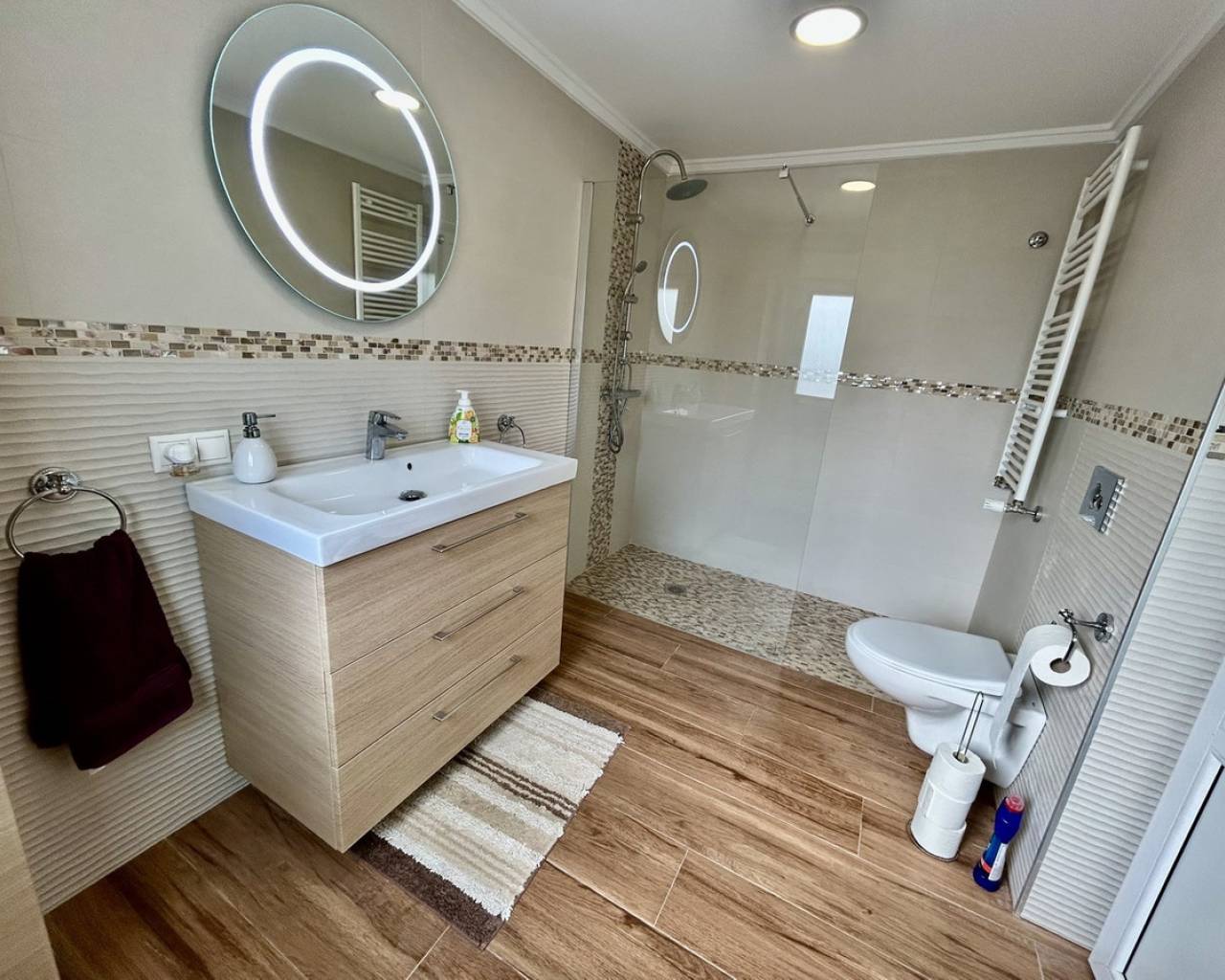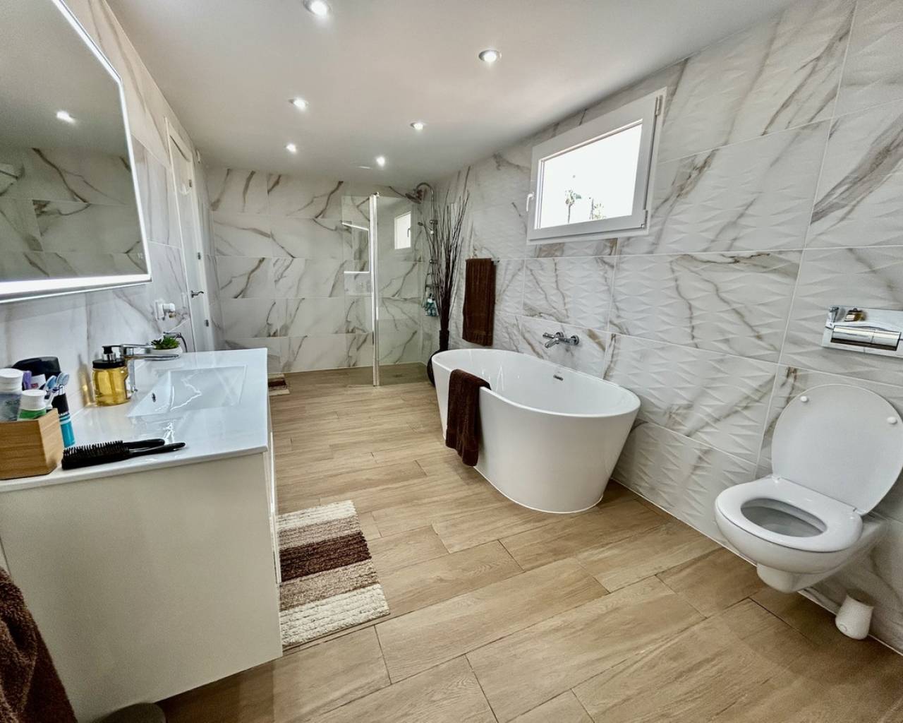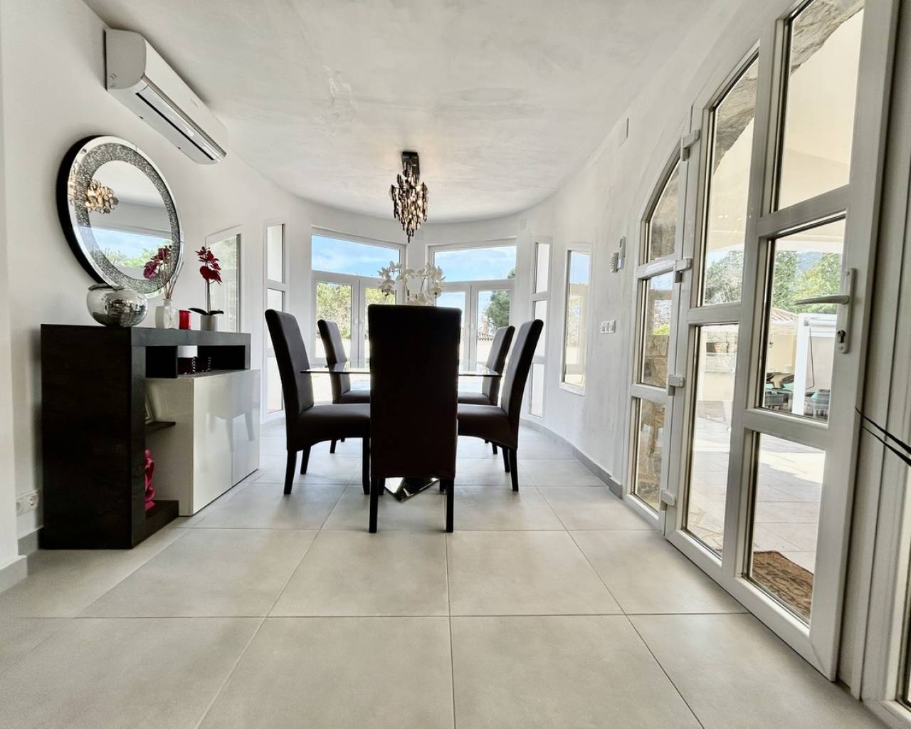 Introducing this exceptional fully renovated 6-bedroom, 4-bathroom detached villa, perfectly combining modern luxury with charming original character. Set on a generous 1,300 m² private plot with a constructed area of 344 m², this impressive single-level home is located in the peaceful and highly desirable area of Lomas de Cabo Roig, offering privacy while remaining within walking distance of restaurants, bars, cafés, and a supermarket. The beautiful beaches of Campoamor and Cabo Roig, as well as two renowned golf courses, are also just a short drive away. A spacious covered terrace welcomes you into the heart of the home, where an expansive open-plan living, dining, and kitchen area creates a bright and inviting space filled with natural light. The renovated kitchen is finished to a high standard and fully equipped with premium appliances including an American-style fridge freezer and double oven, making it ideal for both everyday living and entertaining. The property offers six versatile bedrooms, designed to adapt to a variety of needs. One en-suite bedroom is accessed directly from the main living area and is currently used as a stylish sports lounge. Along the main hallway you will find three additional bedrooms with fitted wardrobes and French doors, one of which is presently used as a home office. The final two spacious bedrooms overlook the pool and gardens and share a luxurious bathroom featuring a walk-in shower and freestanding bathtub, creating a relaxing retreat within the home. Outside, the villa truly shines as an entertainer's paradise. The beautifully landscaped rear garden features a large private swimming pool and a stunning stone-built gazebo complete with a bar area, glass windows, TV, and a generous awning for shaded relaxation. The mature gardens are designed to be attractive yet low maintenance, while the entire property is enclosed by a solid perimeter wall, ensuring excellent privacy and security. This impressive property also offers excellent flexibility, with the possibility to easily create a separate two-bedroom guest apartment with its own lounge and kitchen/utility area, thanks to convenient external access—ideal for guests, extended family, or rental potential. Additional features include independent air-conditioning in all rooms, a fireplace in the main lounge a double garage, alarm system, and two outdoor storage rooms, making this a highly functional and comfortable home all year round. This is a rare opportunity to own a beautifully upgraded, spacious villa in one of the Costa Blanca's most sought-after residential locations, perfectly suited for luxurious family living or as a high-end holiday retreat.