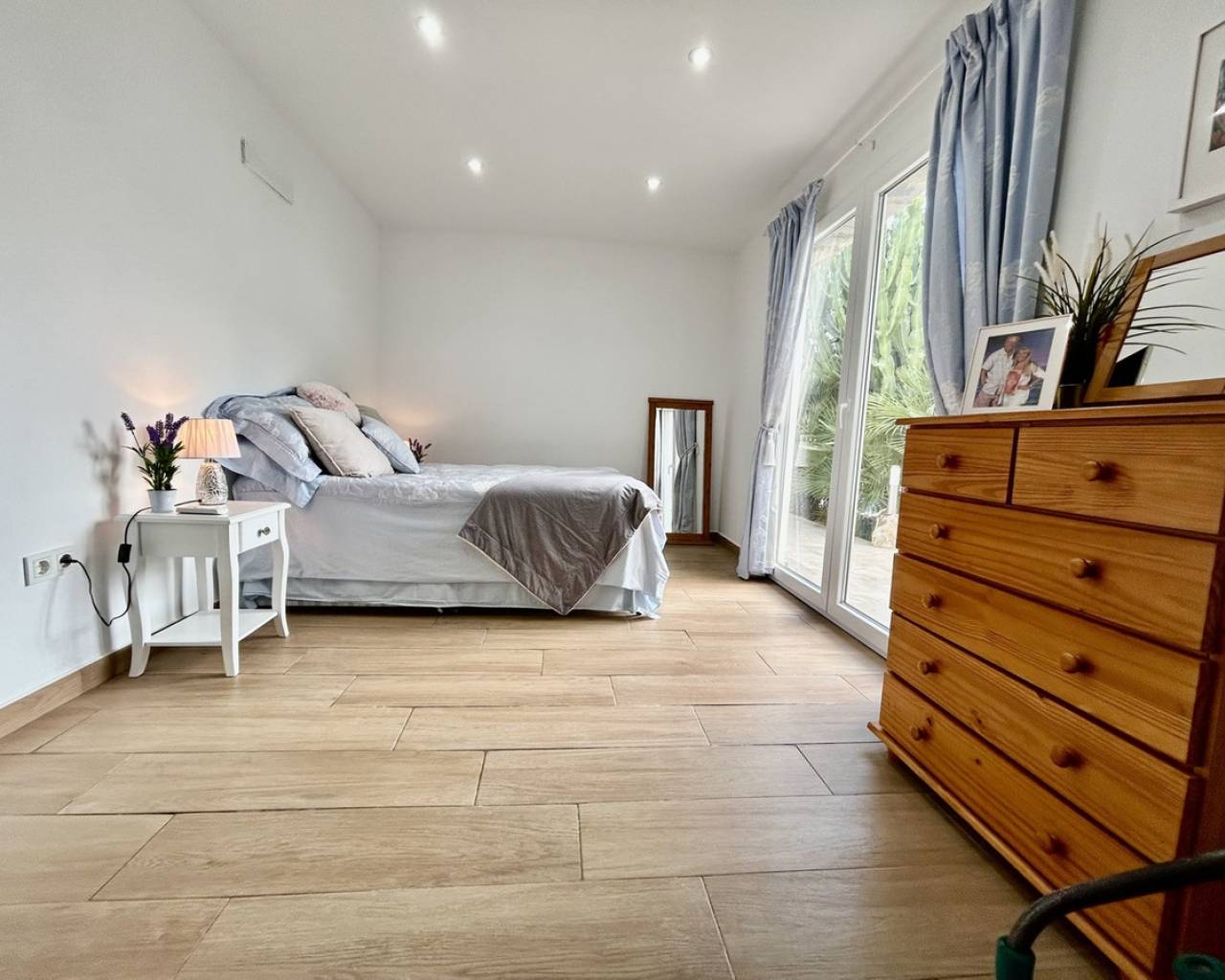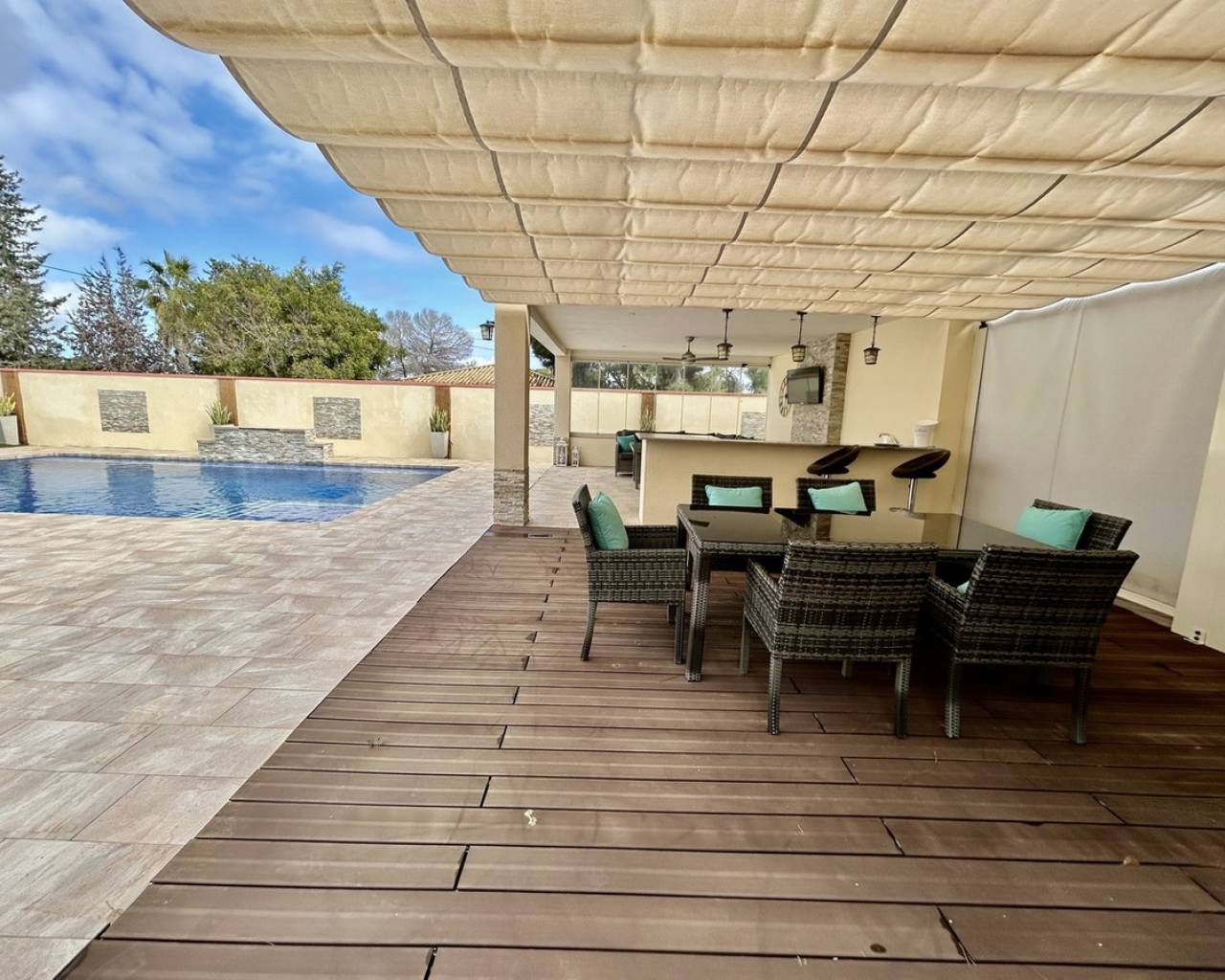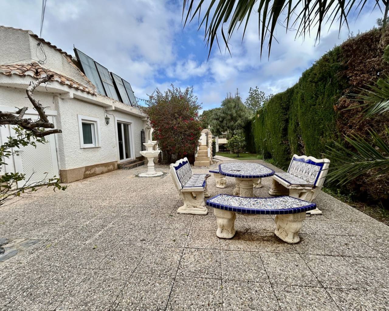 Introducing this exceptional fully renovated 6-bedroom, 4-bathroom detached villa, perfectly combining modern luxury with charming original character. Set on a generous 1,300 m² private plot with a constructed area of 344 m², this impressive single-level home is located in the peaceful and highly desirable area of Lomas de Cabo Roig, offering privacy while remaining within walking distance of restaurants, bars, cafés, and a supermarket. The beautiful beaches of Campoamor and Cabo Roig, as well as two renowned golf courses, are also just a short drive away. A spacious covered terrace welcomes you into the heart of the home, where an expansive open-plan living, dining, and kitchen area creates a bright and inviting space filled with natural light. The renovated kitchen is finished to a high standard and fully equipped with premium appliances including an American-style fridge freezer and double oven, making it ideal for both everyday living and entertaining. The property offers six versatile bedrooms, designed to adapt to a variety of needs. One en-suite bedroom is accessed directly from the main living area and is currently used as a stylish sports lounge. Along the main hallway you will find three additional bedrooms with fitted wardrobes and French doors, one of which is presently used as a home office. The final two spacious bedrooms overlook the pool and gardens and share a luxurious bathroom featuring a walk-in shower and freestanding bathtub, creating a relaxing retreat within the home. Outside, the villa truly shines as an entertainer's paradise. The beautifully landscaped rear garden features a large private swimming pool and a stunning stone-built gazebo complete with a bar area, glass windows, TV, and a generous awning for shaded relaxation. The mature gardens are designed to be attractive yet low maintenance, while the entire property is enclosed by a solid perimeter wall, ensuring excellent privacy and security. This impressive property also offers excellent flexibility, with the possibility to easily create a separate two-bedroom guest apartment with its own lounge and kitchen/utility area, thanks to convenient external access—ideal for guests, extended family, or rental potential. Additional features include independent air-conditioning in all rooms, a fireplace in the main lounge a double garage, alarm system, and two outdoor storage rooms, making this a highly functional and comfortable home all year round. This is a rare opportunity to own a beautifully upgraded, spacious villa in one of the Costa Blanca's most sought-after residential locations, perfectly suited for luxurious family living or as a high-end holiday retreat.