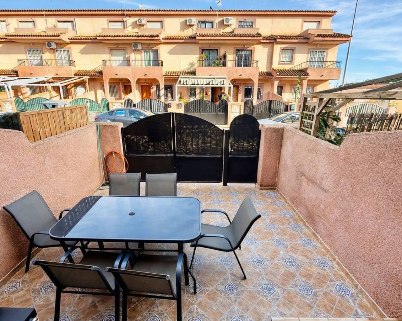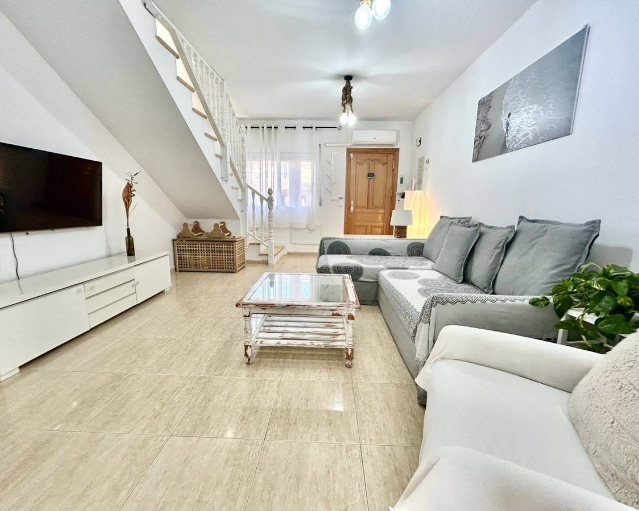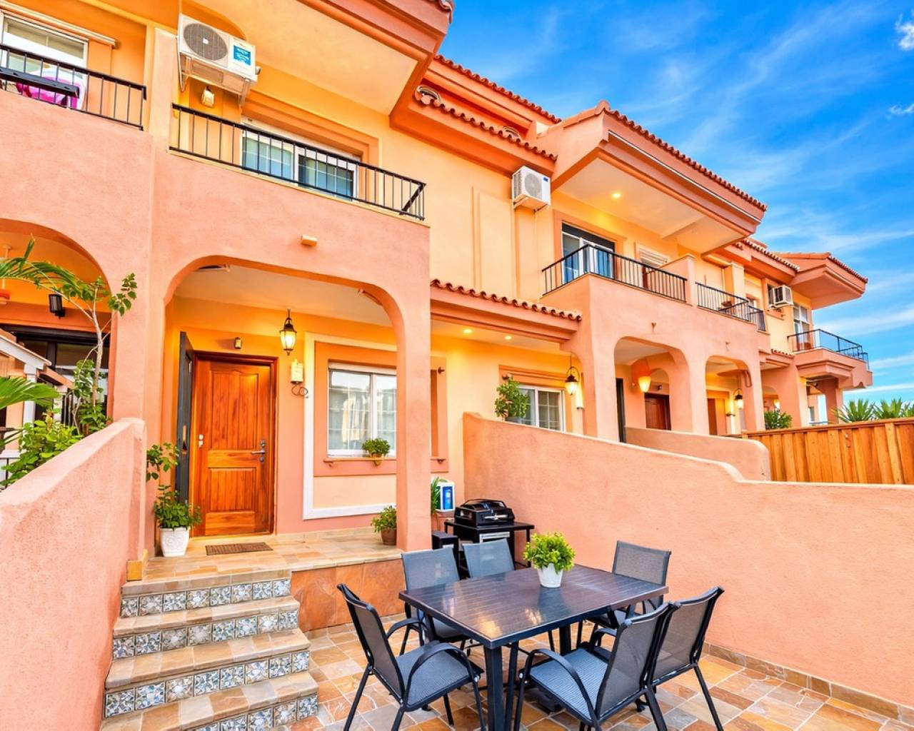 This spacious 4-bedroom townhouse offers the perfect combination of privacy, outdoor living, and convenience, ideally located on a quiet residential street just a short walk from Dos Mares Shopping Center and close to a wide range of shops, restaurants, and everyday amenities. The beautiful beaches of Mar Menor are also just a 5-minute drive away, making this an ideal home for both permanent living and holidays. As you enter the property, you are welcomed by a bright and spacious living room, offering plenty of natural light and a comfortable area for relaxing or entertaining. From here you move through to a large separate kitchen and dining area, providing generous space for family meals and gatherings. The kitchen leads out to the rear of the property where you will find a useful utility area with space for a washing machine, an outdoor toilet, and access to the private garden. The garden has been designed for low maintenance with artificial grass and features a private swimming pool, surrounded by high walls that provide excellent privacy, creating the perfect space to relax, sunbathe, or entertain friends and family. The home is arranged over three levels, offering plenty of space for family life. On the first floor there are two bedrooms and a family bathroom, while the top floor offers two additional bedrooms and another bathroom, making the layout ideal for larger families or hosting guests. One bedroom on each level enjoys its own private terrace, while the other bedrooms benefit from peaceful views over open green fields and towards the surrounding mountains, giving the property a wonderful sense of space and tranquillity. With its generous living space, private pool, quiet location, and close proximity to shops and the beach, this property represents a fantastic opportunity as a permanent home, holiday retreat, or rental investment.