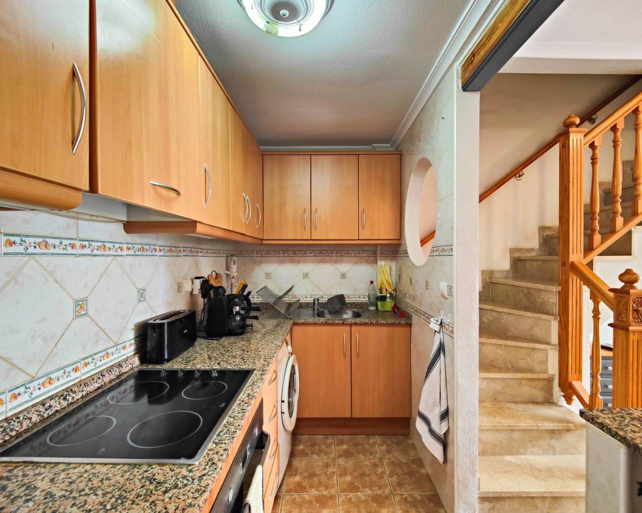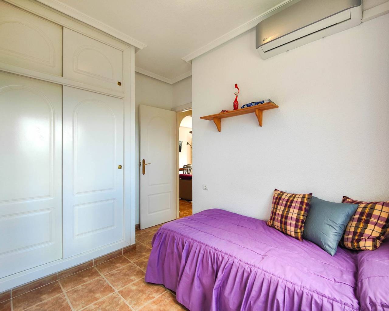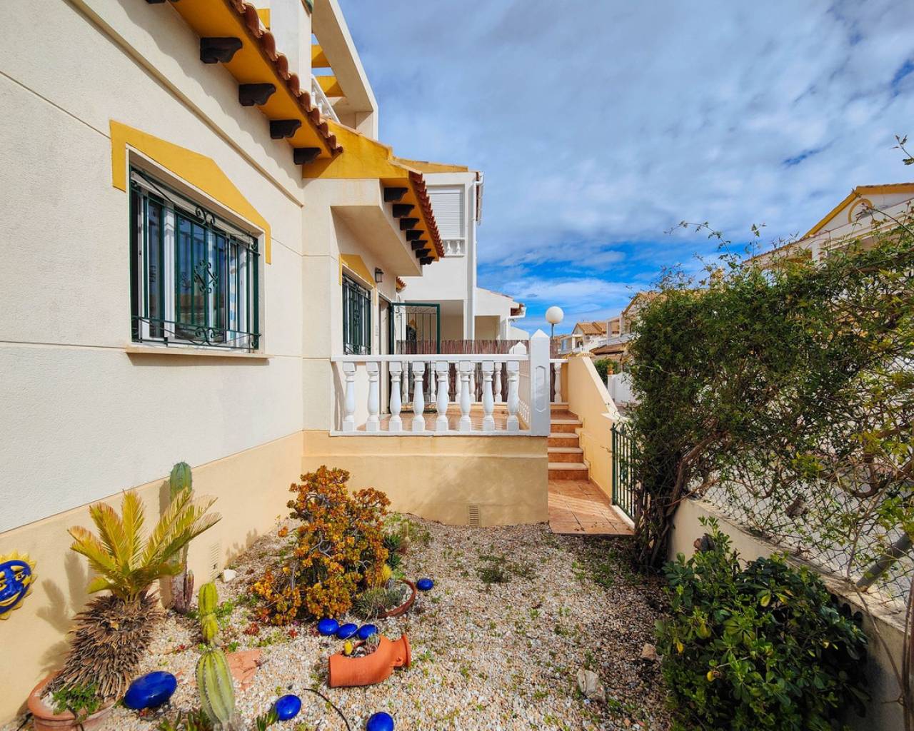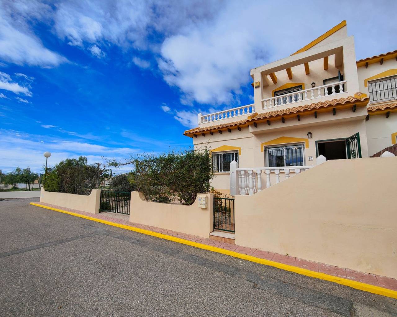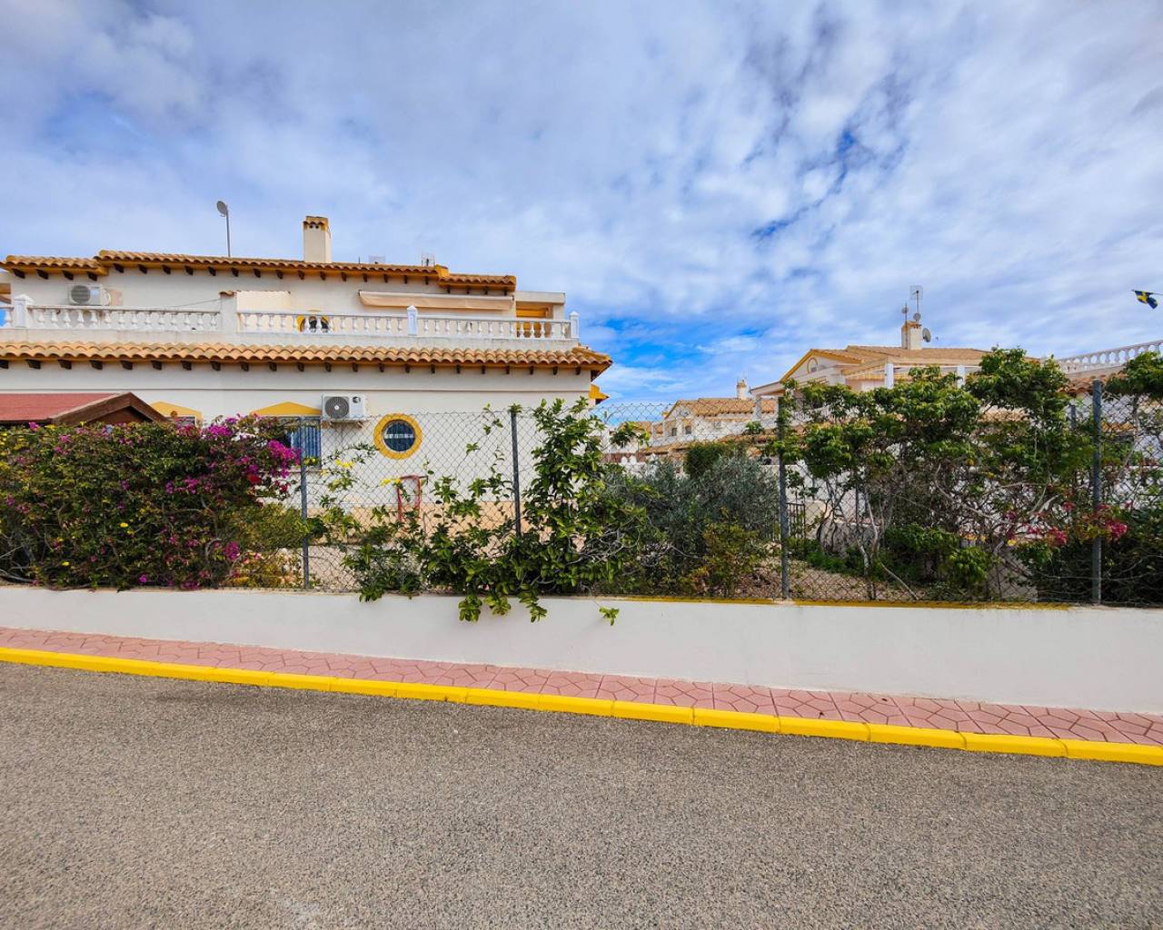 Beautiful corner quad house in Punta Prima, Orihuela Costa, located in a quiet area next to a green area and only minutes away from beaches and all amenities. The property benefits from a southwest orientation, providing plenty of natural light, and sits on a private corner plot of approximately 90 m² with off road garden and a private garden. It offers 3 bedrooms and 2 bathrooms distributed as follows: Ground Floor: Bright living-dining room Fully equipped kitchen 2 bedrooms 1 full bathroom Upper Floor: Master bedroom En-suite bathroom A major advantage is having bedrooms and a full bathroom on the ground floor, ideal for comfort and accessibility. The property is sold fully furnished and equipped, includes air conditioning in one bedroom, and is in very good overall condition. On the top level there is a spacious solarium with views over the green area and slight sea views. The residential complex features a communal swimming pool and is close to restaurants, bars, supermarkets, shopping areas, and all services.
