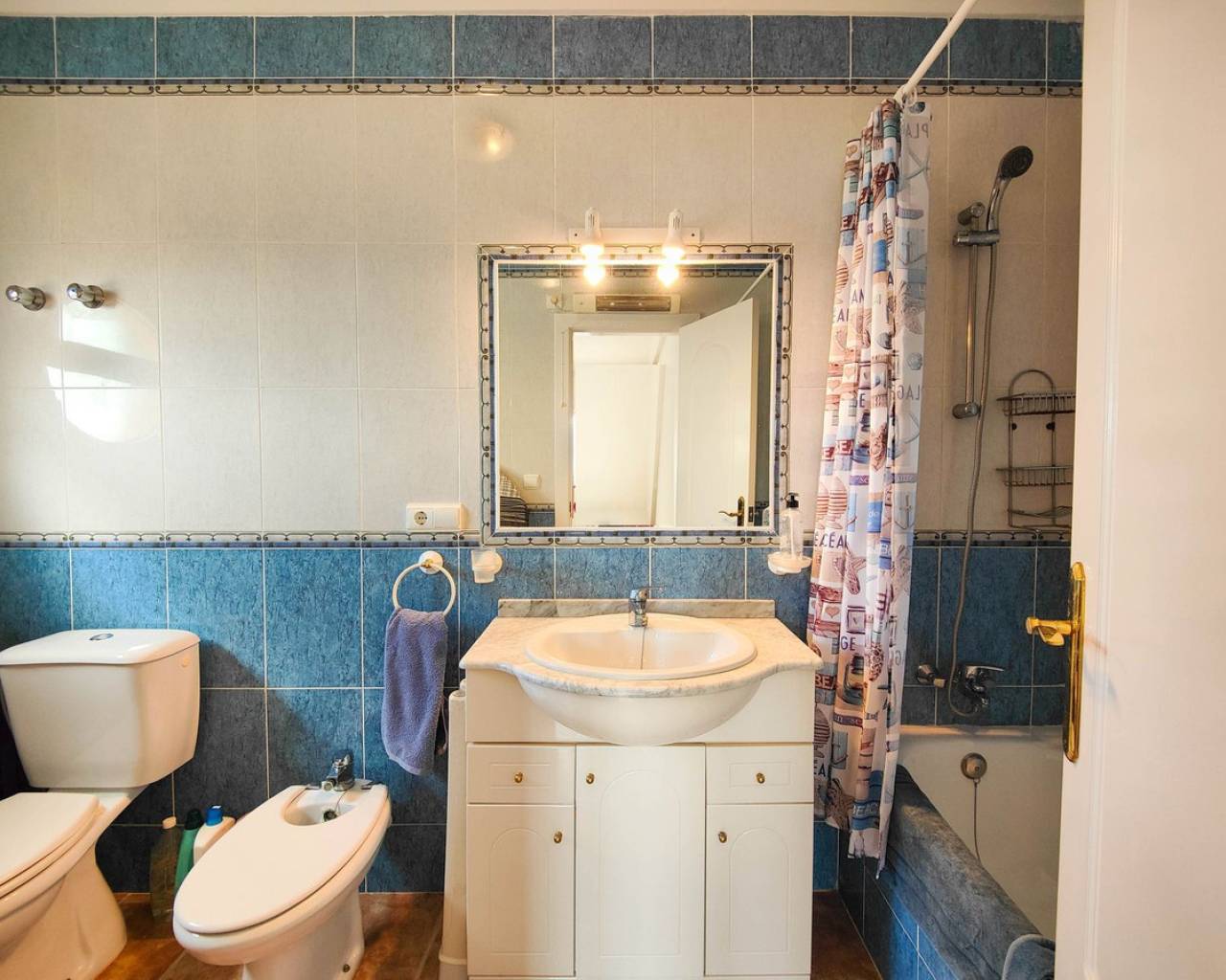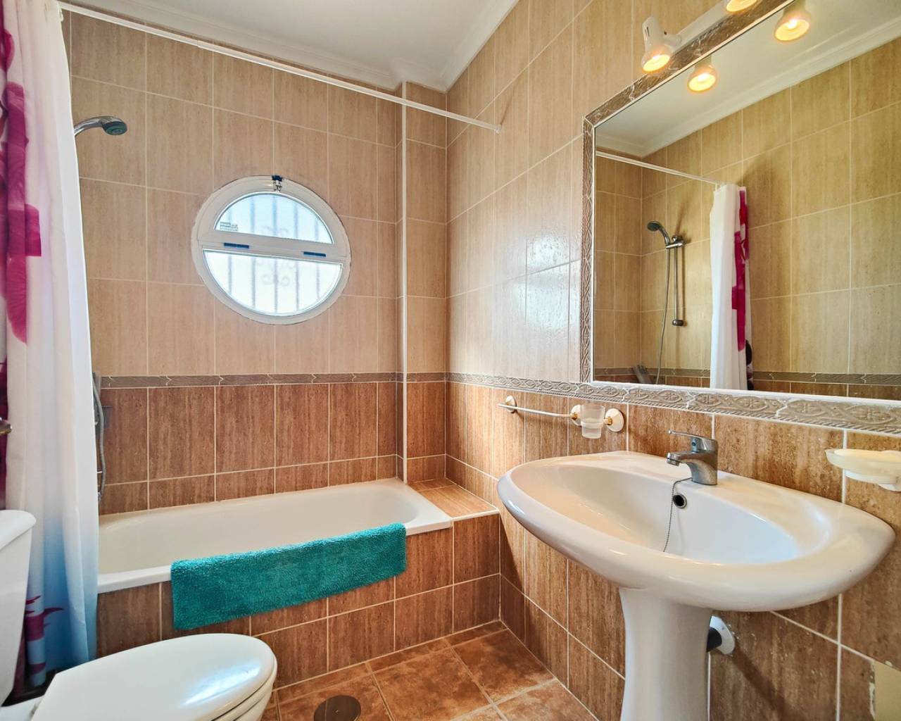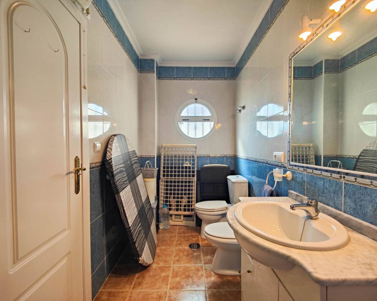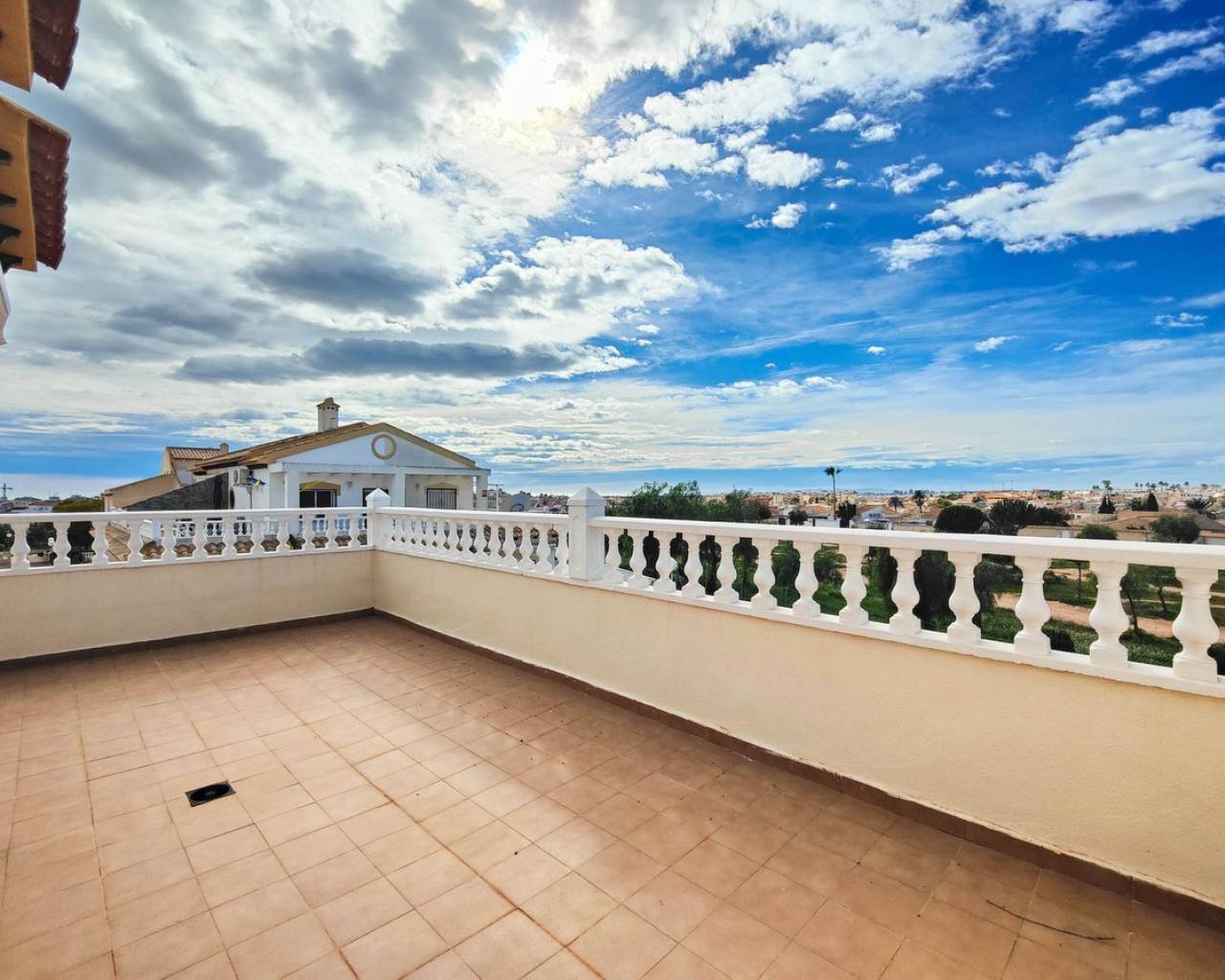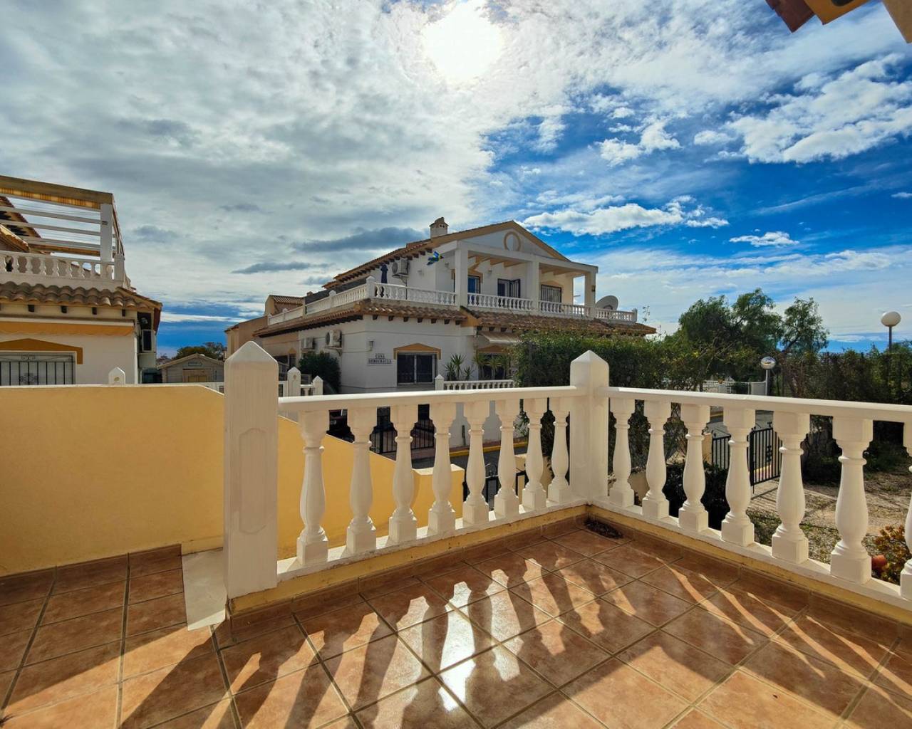 Beautiful corner quad house in Punta Prima, Orihuela Costa, located in a quiet area next to a green area and only minutes away from beaches and all amenities. The property benefits from a southwest orientation, providing plenty of natural light, and sits on a private corner plot of approximately 90 m² with off road garden and a private garden. It offers 3 bedrooms and 2 bathrooms distributed as follows: Ground Floor: Bright living-dining room Fully equipped kitchen 2 bedrooms 1 full bathroom Upper Floor: Master bedroom En-suite bathroom A major advantage is having bedrooms and a full bathroom on the ground floor, ideal for comfort and accessibility. The property is sold fully furnished and equipped, includes air conditioning in one bedroom, and is in very good overall condition. On the top level there is a spacious solarium with views over the green area and slight sea views. The residential complex features a communal swimming pool and is close to restaurants, bars, supermarkets, shopping areas, and all services.