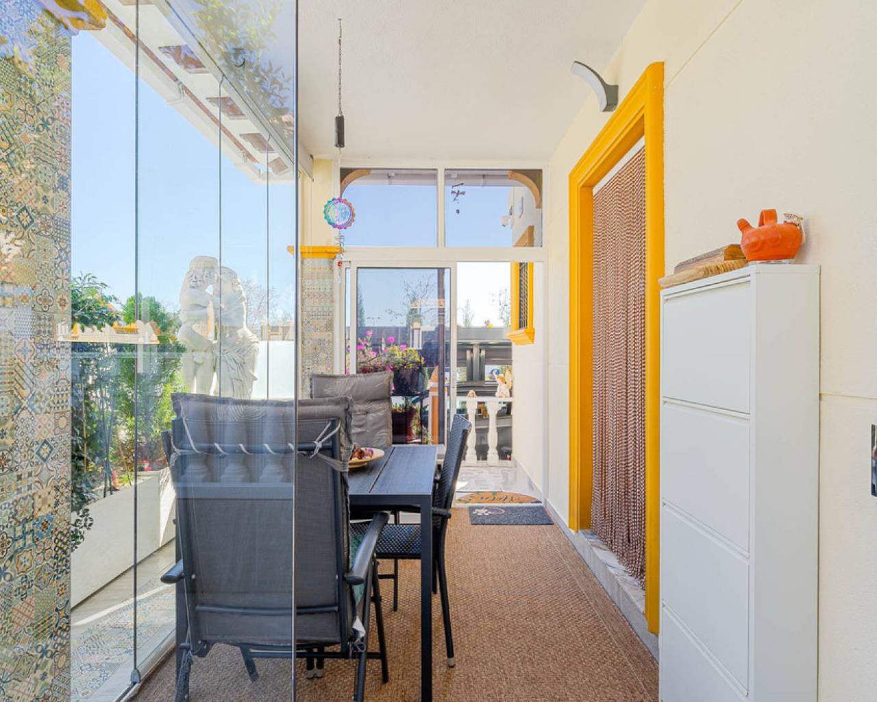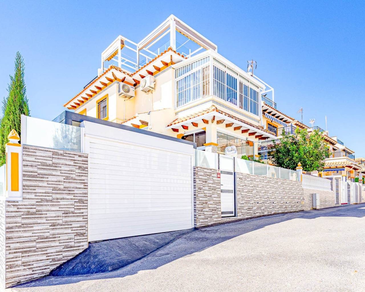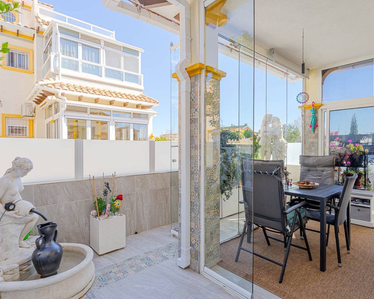 This stylish townhouse with modern renovation is located in the prestigious area of Punta Prima on the beautiful Costa Blanca, within walking distance to the sea and the beaches of Orihuela Costa. The area is well known for its developed infrastructure, pleasant atmosphere, and proximity to all essential amenities, including restaurants, shops, pharmacies, and scenic walking areas, making it perfect for both permanent living and holidays. The property has been recently refurbished to a high standard, offering a modern, elegant, and comfortable living space. The townhouse features a spacious plot with parking and a storage room, as well as a well-designed layout across two levels. Upon entering, you are welcomed by a glazed terrace leading into a bright living and dining area and a fully equipped kitchen. The home includes 2 cozy bedrooms, a modern bathroom, and a guest toilet. One of its standout features is the private rooftop solarium with sea views, an ideal space to relax and enjoy the sunshine all year round. Residents also benefit from access to a large communal swimming pool. Just a few minutes' drive away is the largest shopping center in the area, La Zenia Boulevard, offering a wide range of shops and entertainment options. This is an excellent opportunity for permanent residence, a holiday home, or a smart investment on Spain's sunny coast.