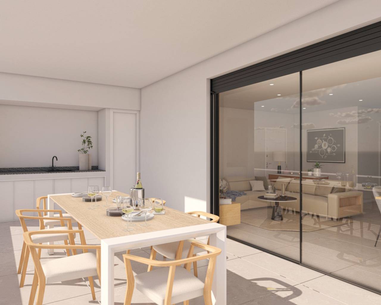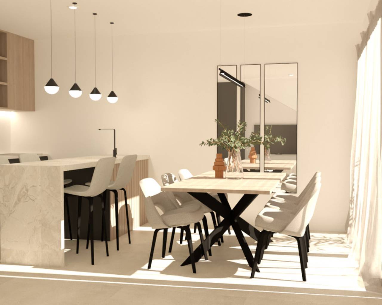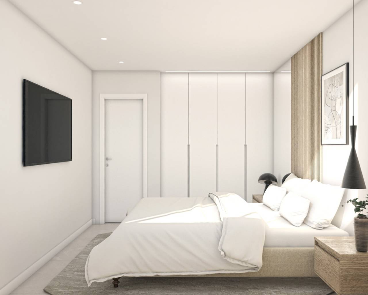 The properties are distributed over 4 floors, with 2 or 3 bedrooms and 2 bathrooms. The ground floors have 3 bedrooms (the third bedroom being an open studio without built-in wardrobe) and the upper floors have a large solarium.