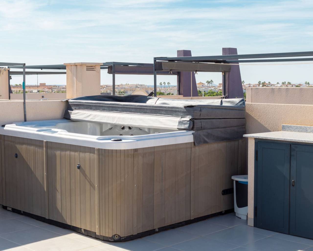 Welcome to this very nice apartment in new condition, located in a quiet and pleasant area with proximity to both the beach and restaurants. Here you live comfortably in a well-thought-out home that combines style, function and generous outdoor spaces. The home offers two spacious bedrooms and two modern bathrooms, making it ideal for both permanent residence and holiday home. The floor plan is open and social with the kitchen and living room directly adjacent to each other - perfect for both everyday life and socializing. The kitchen has full mechanical equipment with good work surfaces and storage, and connects naturally to the living room where large windows let in plenty of light. From the home you reach a large balcony with a view of the well-kept pool area and the nice courtyard - a nice place for morning coffee in the sun or a quiet moment in the shade in the afternoon. In addition to this, there is the real highlight of the home: the large private roof terrace. There is plenty of space for a dining group and sun loungers, there is already a conservatory, your own outdoor kitchen and your own jacuzzi for an extra edge to life. A perfect place for relaxation, social events or just enjoying the view. The area has both a large swimming pool for adults and a separate children's pool, making it pleasant for all ages. The location is quiet and pleasant, while you are within walking distance of the beach and a selection of restaurants. This is an accommodation that offers both comfort and quality of life in a harmonious environment.