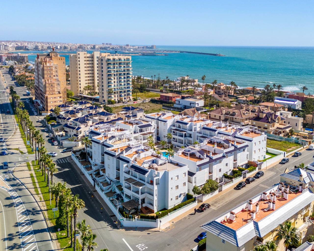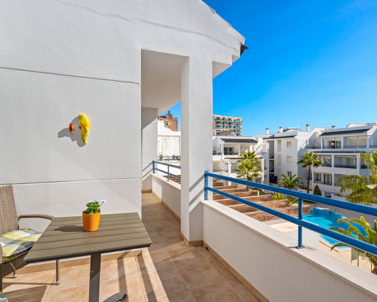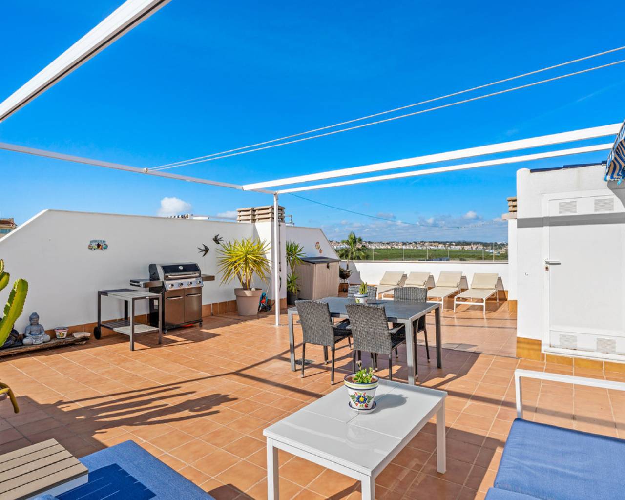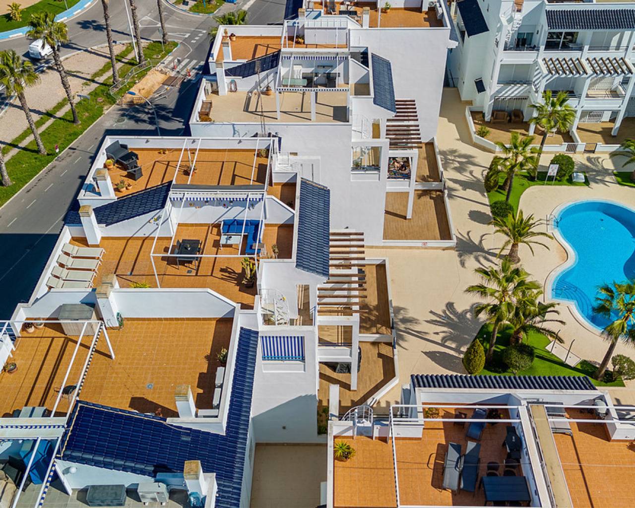 This inviting penthouse apartment from 2005 is located on the 2nd floor in a well-maintained, gated complex with a total of 66 properties. You get a home in very good condition with a well-designed layout, plenty of outdoor space, and a location that ranks among the best in the area. The apartment offers two spacious bedrooms with built-in wardrobes and two bathrooms, one of which is ensuite to the master bedroom. The bathroom in the master bedroom was fully renovated in 2025, giving the property a modern and updated feel. Upon entering the apartment, you are welcomed by an entrance hall with the kitchen located to the right. The kitchen provides ample storage space. From here, there is access to a practical patio area with, among other things, a washing machine. To the left of the entrance, you will find the bright and spacious living room with plenty of space for both a dining area and a lounge. From both the living room and the master bedroom, there is access to a cosy east-facing terrace overlooking the beautiful communal pool area. Here you can enjoy the morning sun in peaceful surroundings, and a side awning provides additional privacy. From the terrace, a staircase leads up to a large and private rooftop terrace, which truly completes the property. Here, the sun can be enjoyed all day, with the option to relax in the shade under the pergola. From the rooftop terrace, there are lovely views of the town and, not least, the characteristic pink salt lake of Torrevieja. There is also a practical storage room on the rooftop. The apartment includes a private parking space in the underground garage. The property is a non-smoking apartment and is generally well maintained. There is air conditioning in both bedrooms as well as in the living room. The air conditioning units in the living room and guest bedroom are approximately 3.5 years old. The communal areas of the complex were renovated, and the entire development was repainted in 2023, giving it a neat and well-kept appearance. The location is excellent. Supermarkets such as Aldi and Lidl are just approximately 260 metres from the property, and there is a bus stop at a similar distance. The sea can be reached within a few minutes' walk – only 300 metres away. In addition, there is a short distance to both Torrevieja town centre and Punta Prima, offering easy access to restaurants, cafés, and local amenities. Alicante Airport is approximately 46 km away, and there is easy access to the main road N332. All in all, this is a wonderful penthouse offering comfort, views, and a highly attractive location – ideal as both a holiday home and a permanent residence.